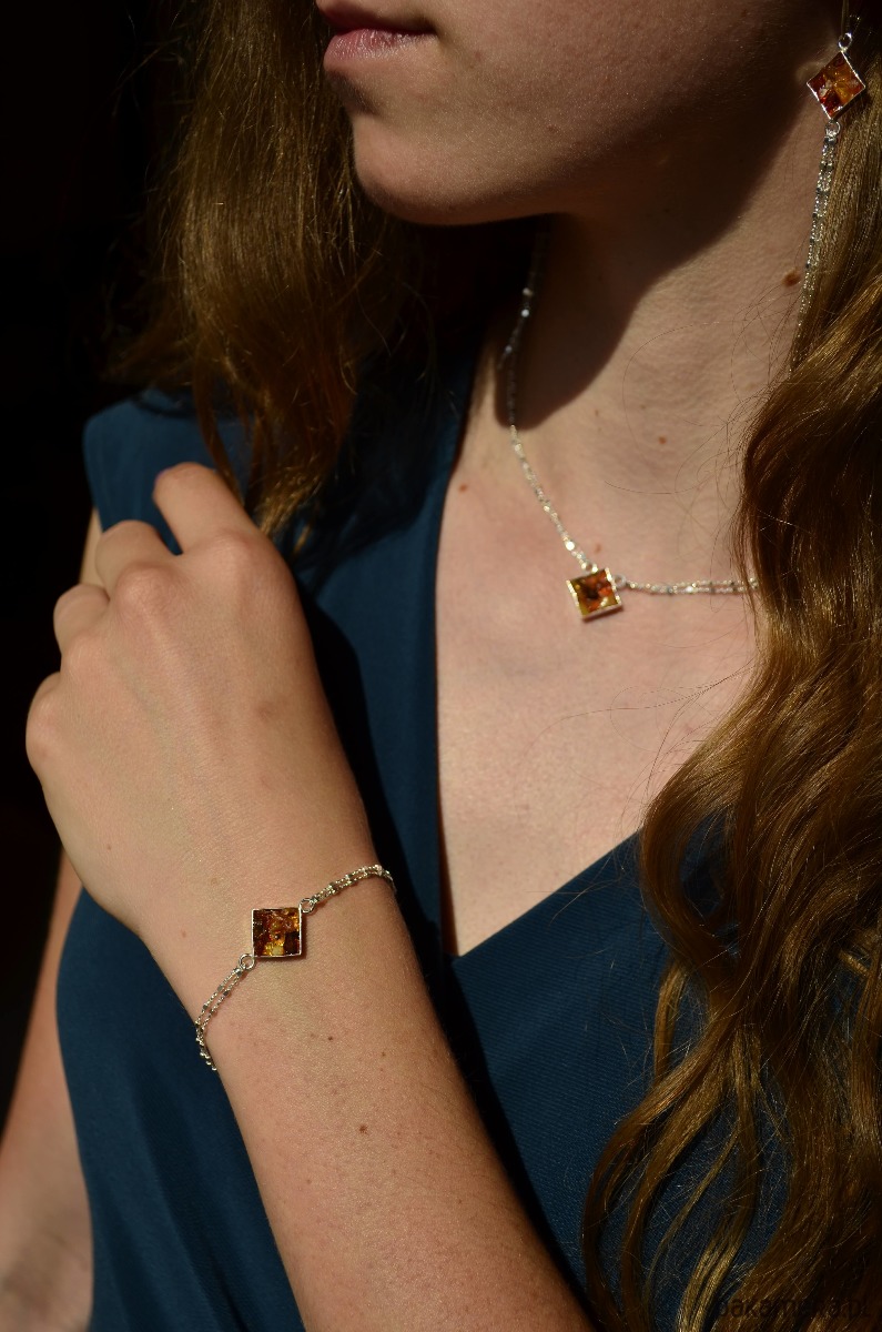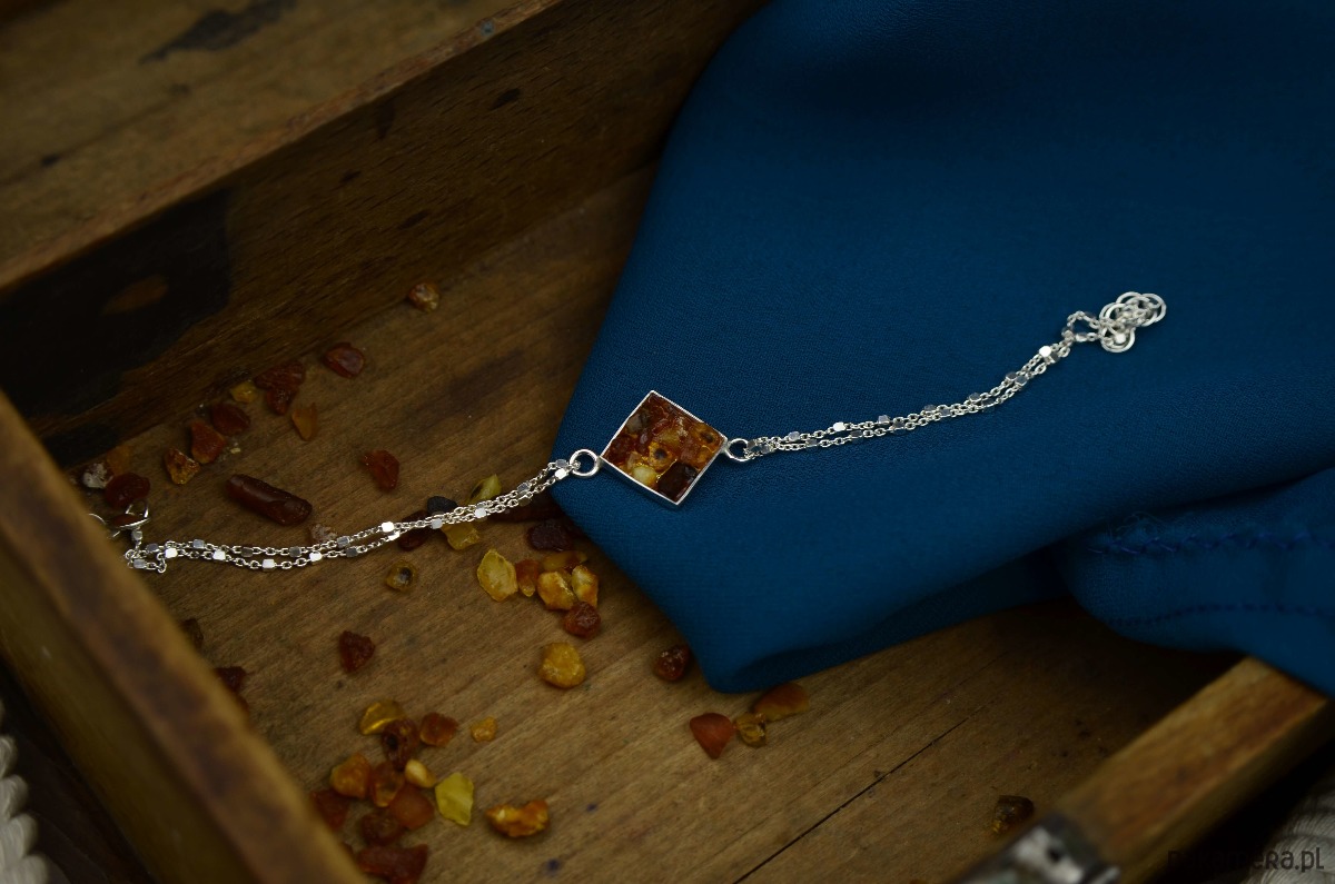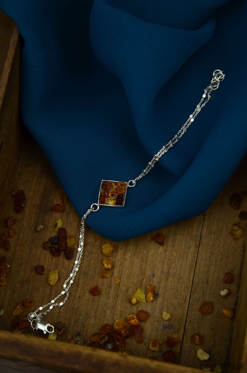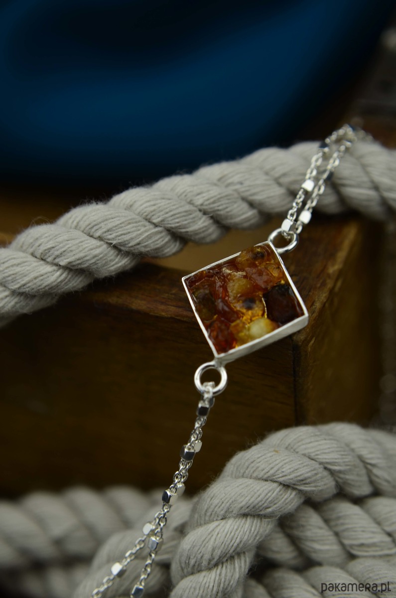 Błyszczące srebro i kawałki surowego bursztynu to eleganckie połączenie, które przypomina nam wakacje nad morzem. Bursztyny zebrane z plaży zamknęłam w srebrnych geometrycznych formach i zawiesiłam na ozdobnym delikatnym łańcuszku. Ta bursztynowa bransoletka to świetna propozycja dla minimalistek lubiących naturalne piękno bursztynu.