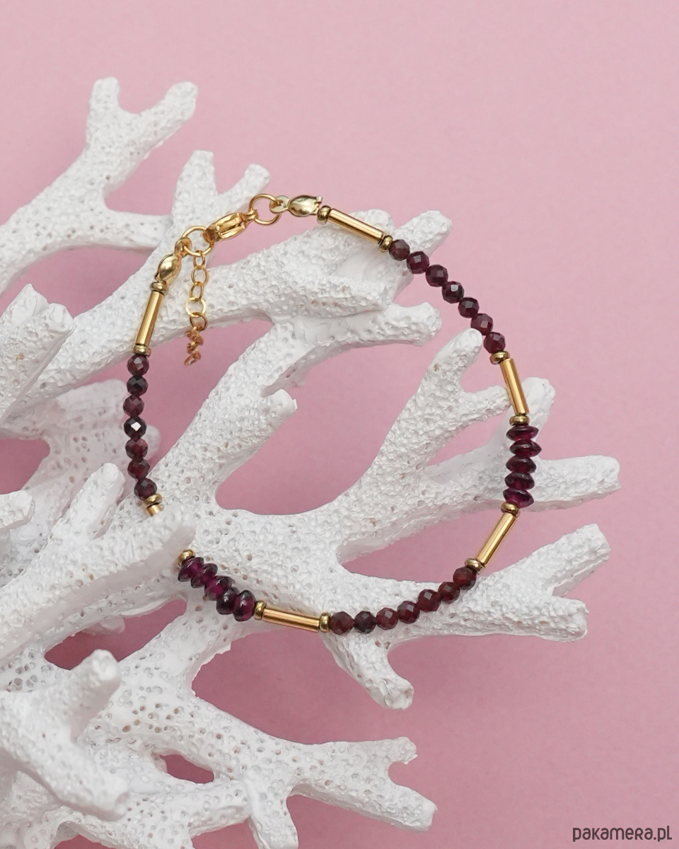 Delikatna i elegancka bransoletka wykonana z GRANATU i złotego HEMATYTU. Kamienie granatu są w formie kulek o fasetowanym wykończeniu oraz gładkich dysków. Zapięcie i łańcuszek to STAL SZLACHETNA w kolorze złotym.