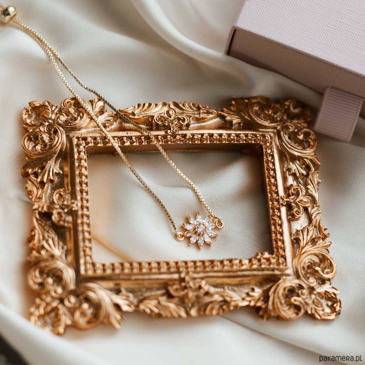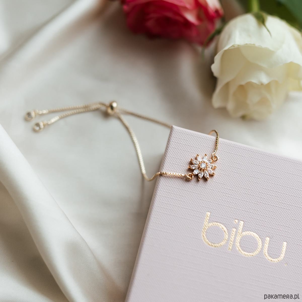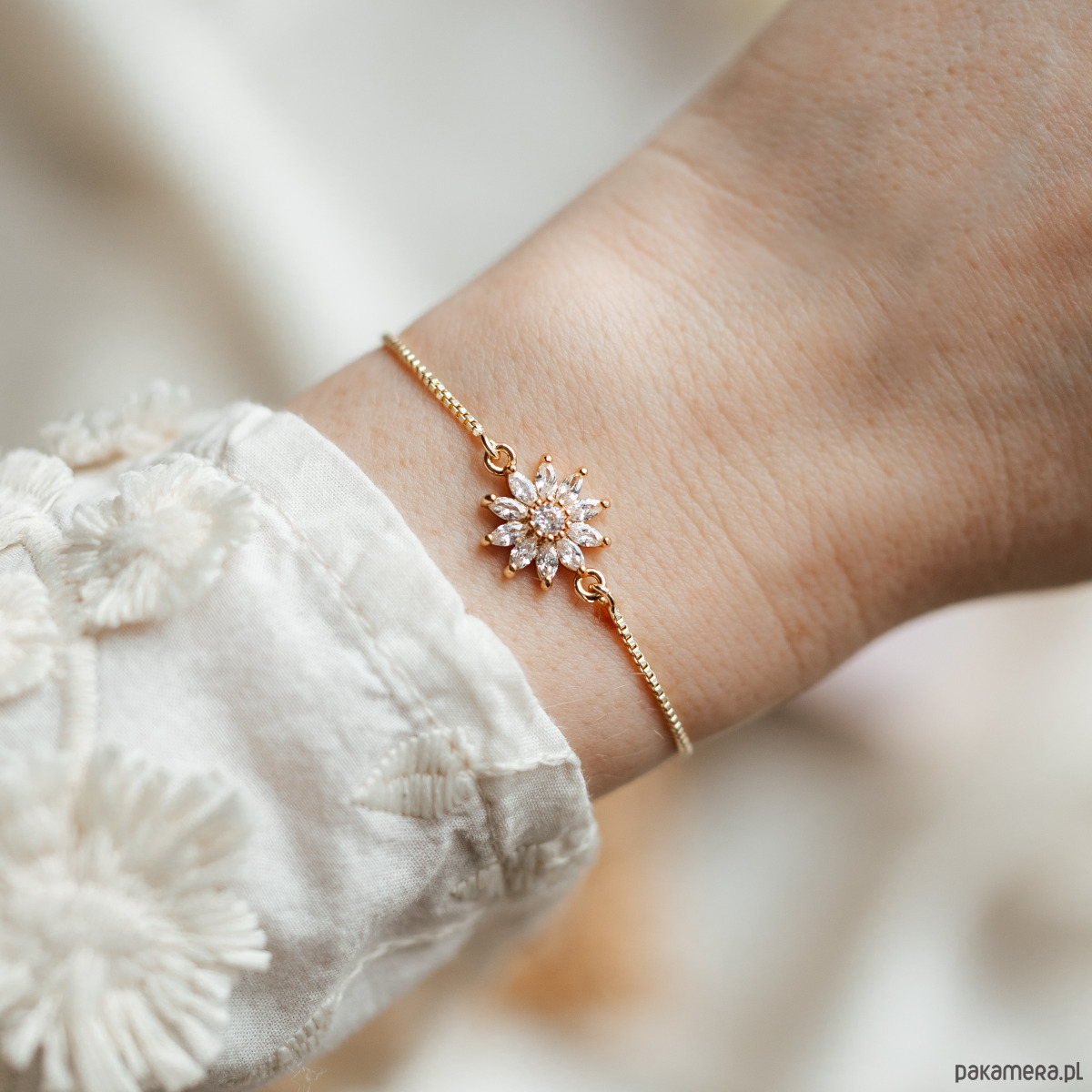 Podaruj niezapomniany moment dzięki tej eleganckiej bransoletce na cienkim, regulowanym złotym łańcuszku, zdobionej przepięknym kwiatem z małymi kryształkami. Delikatny i subtelny dodatek, idealny, aby towarzyszyć wyjątkowemu pytaniu: