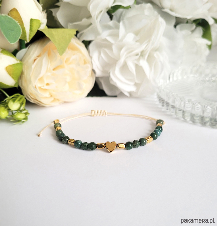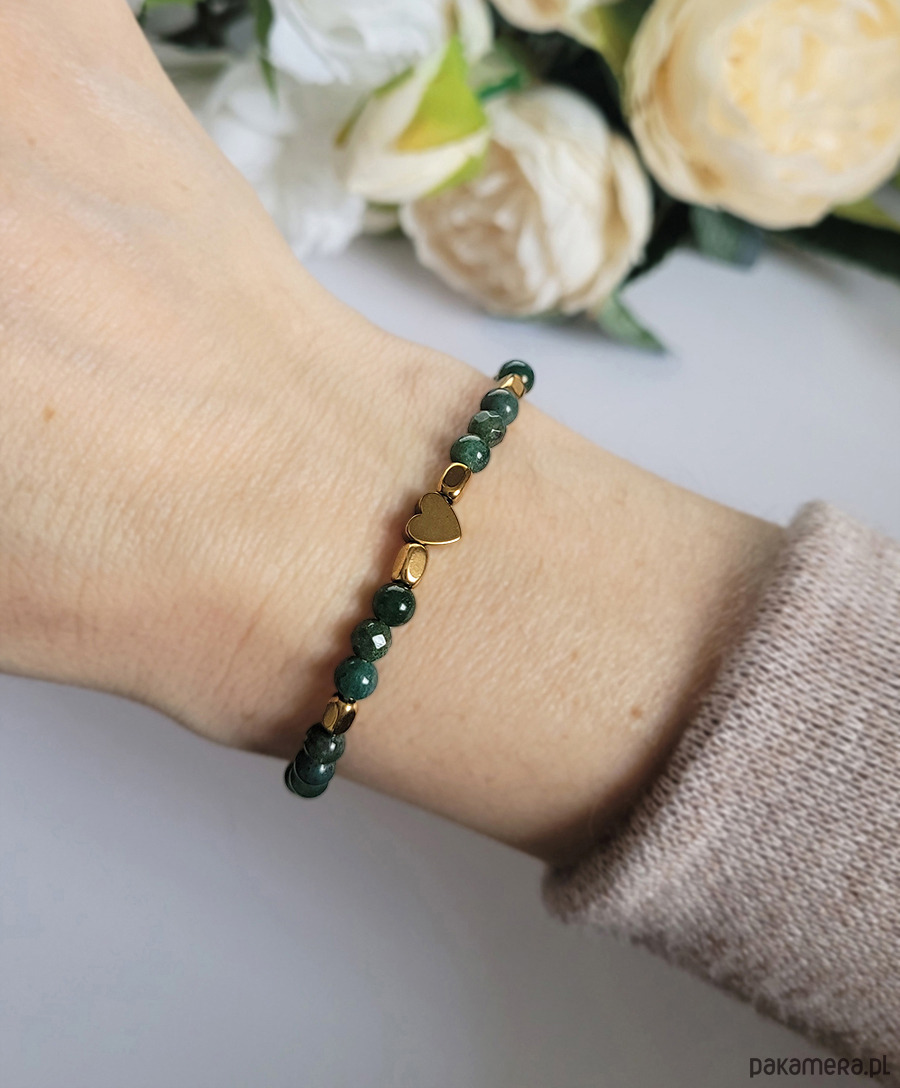 Piękna delikatna bransoletka zrobiona z kamieni naturalnych: Agatu mszystego oraz Hematytu w kolorze złota.