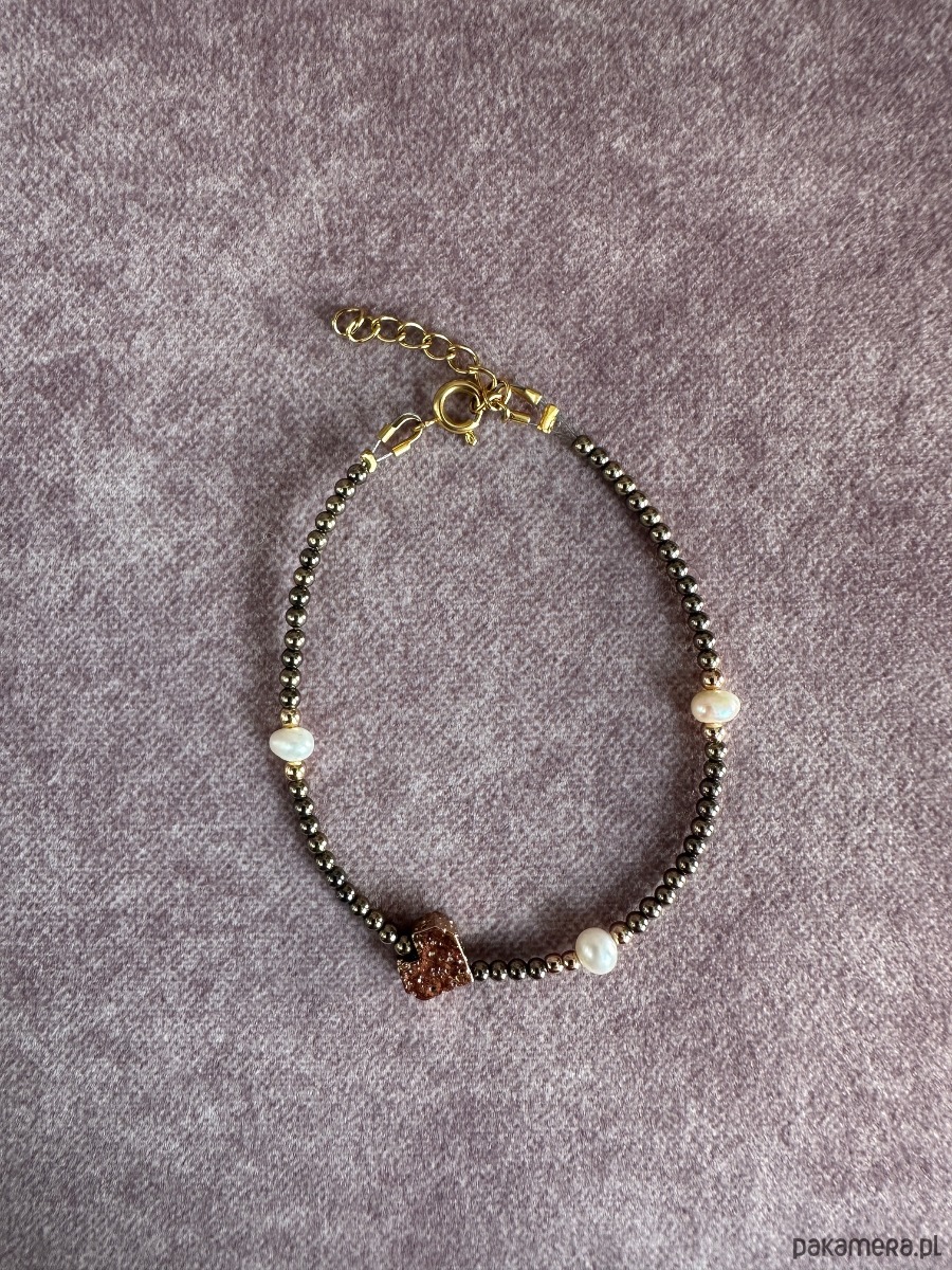 Bazą bransoletki jest hematyt w kolorze takiego ciemnego złota, połączenia szarości brązu i złotego.