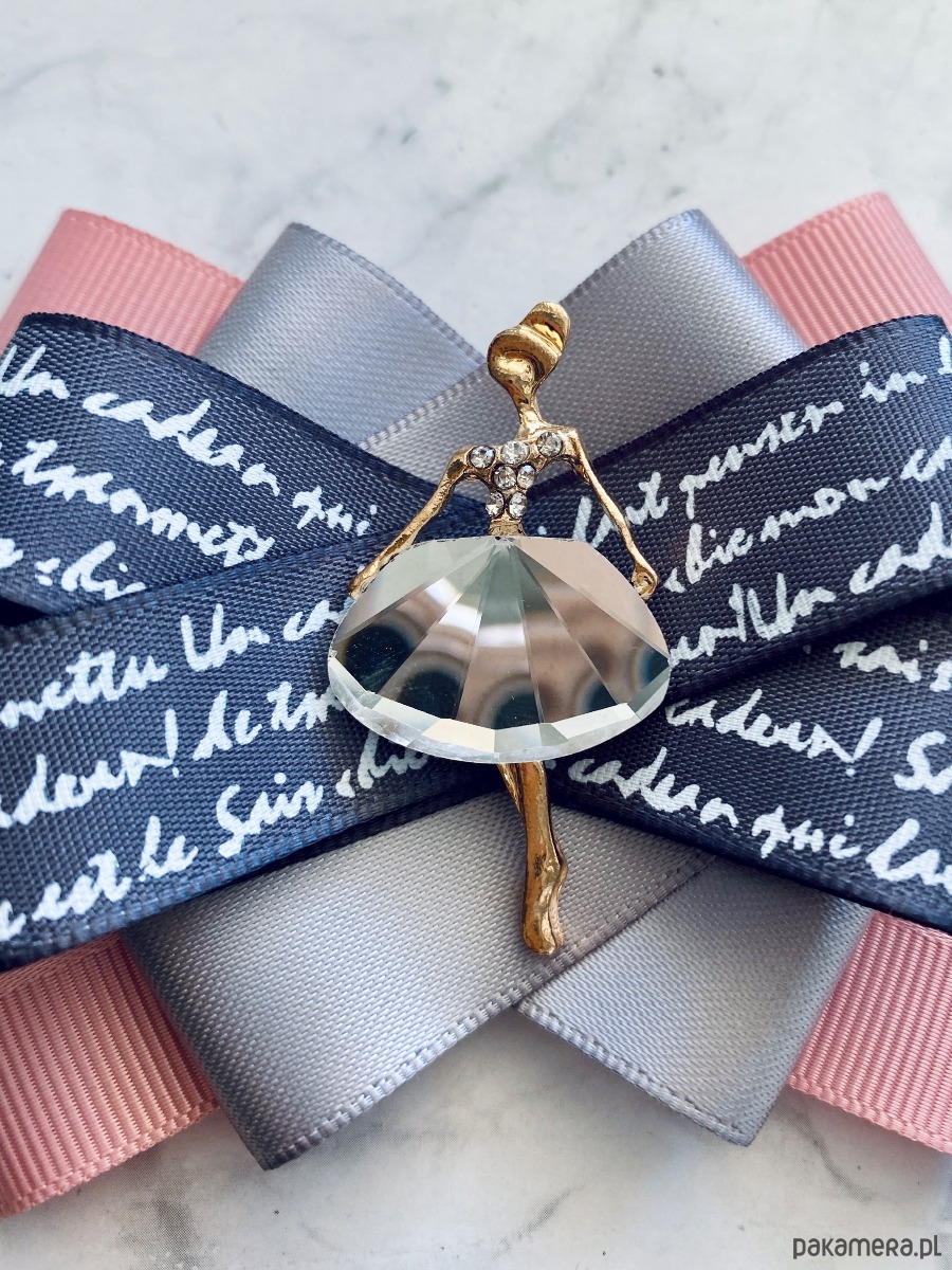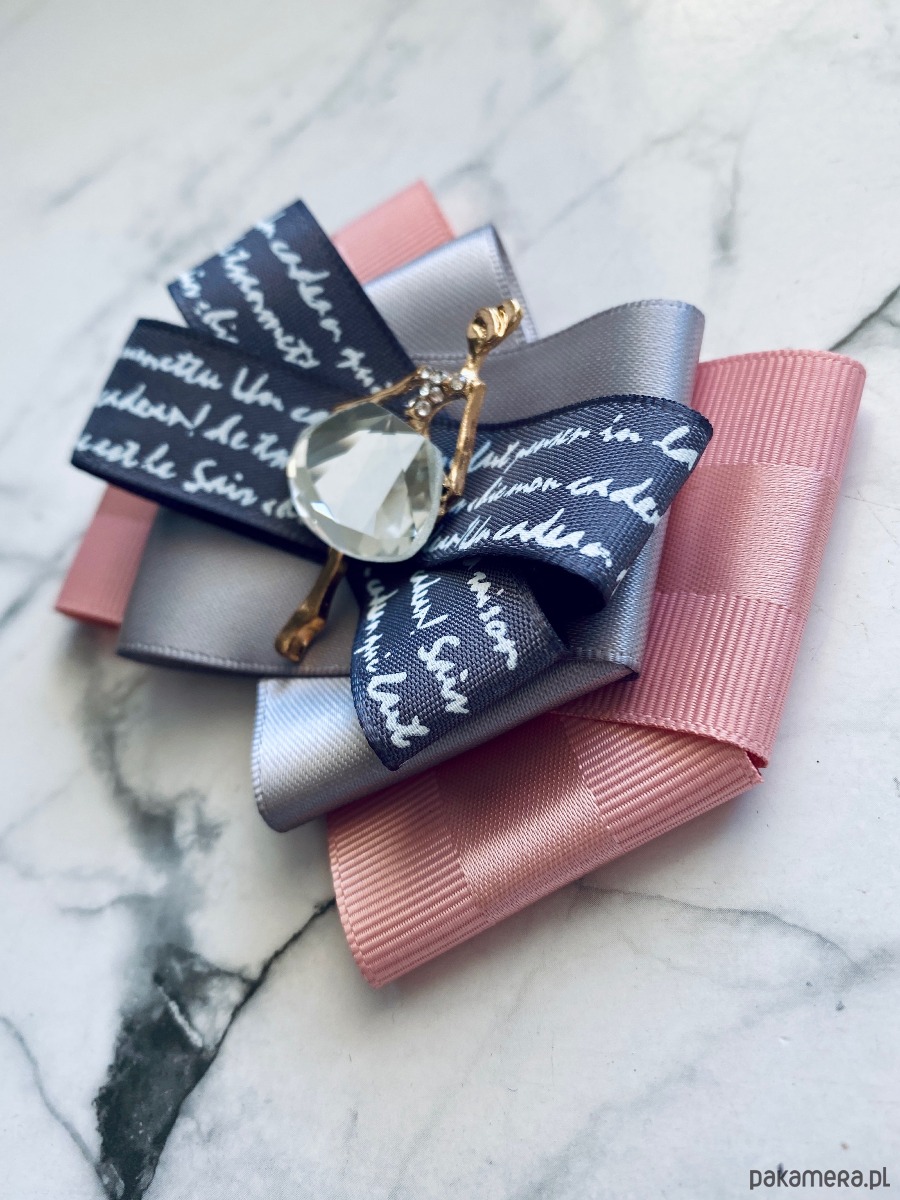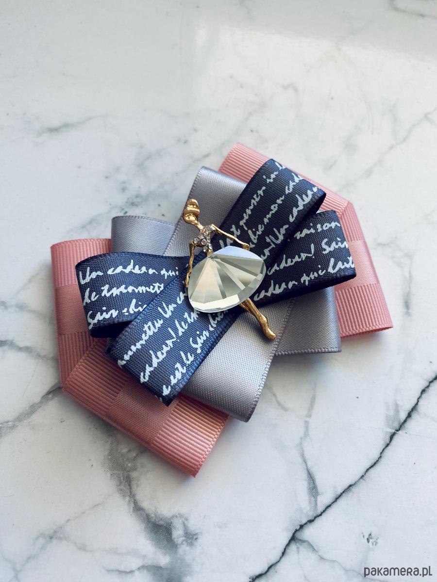 Brosza wykonana z wysokiej jakości taśm i dodatków. Broszka w kolorach pudrowego różu, szarości z dodatkiem prześlicznej wstążki z napisami. Piękna oryginalna ozdoba na środku Dama wykonana z kryształków. Będzie idealnie pasować zarówno do koszul, bluzek, swetrów, sukienek, żakietów oraz do płaszczy, kurtek, szali i chust. Idealna do każdej stylizacji, zarówno do sportowej jak również do eleganckich stylizacji.