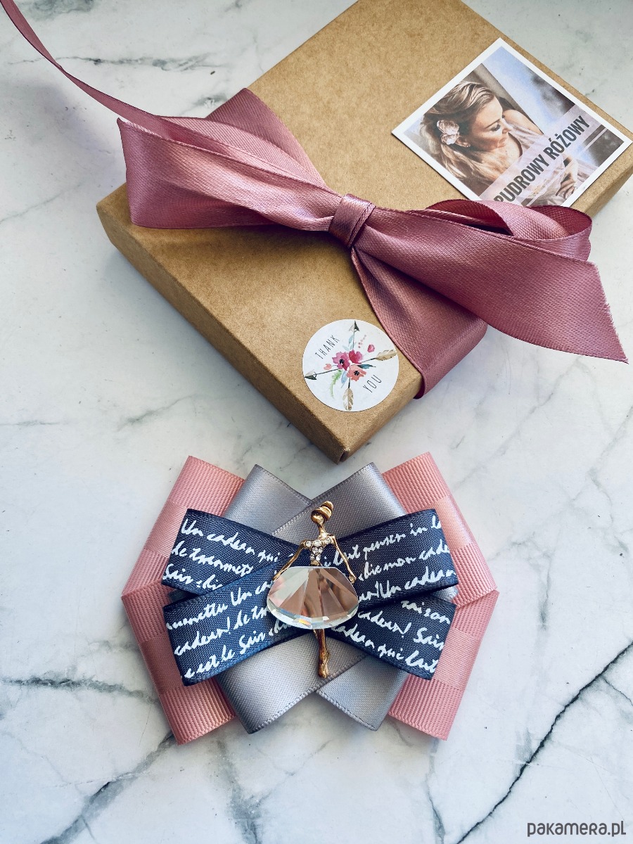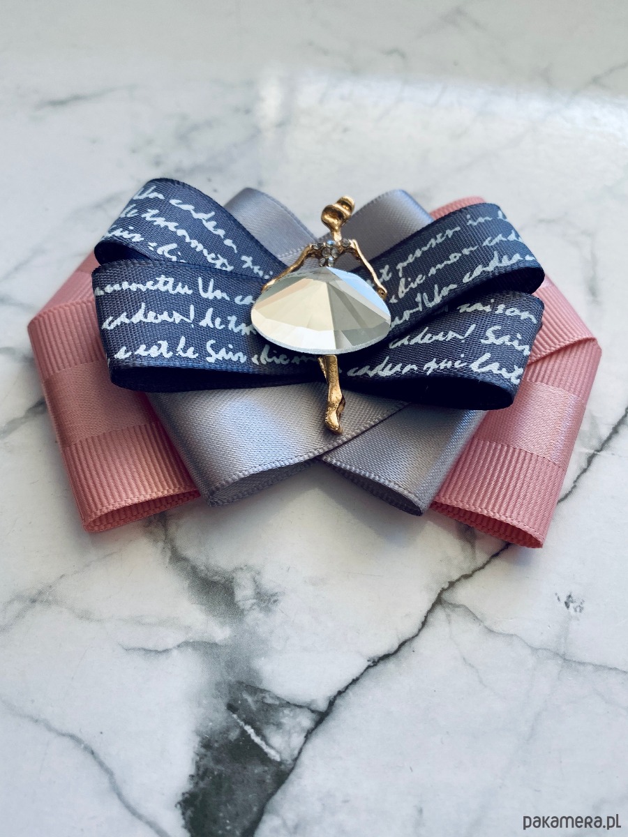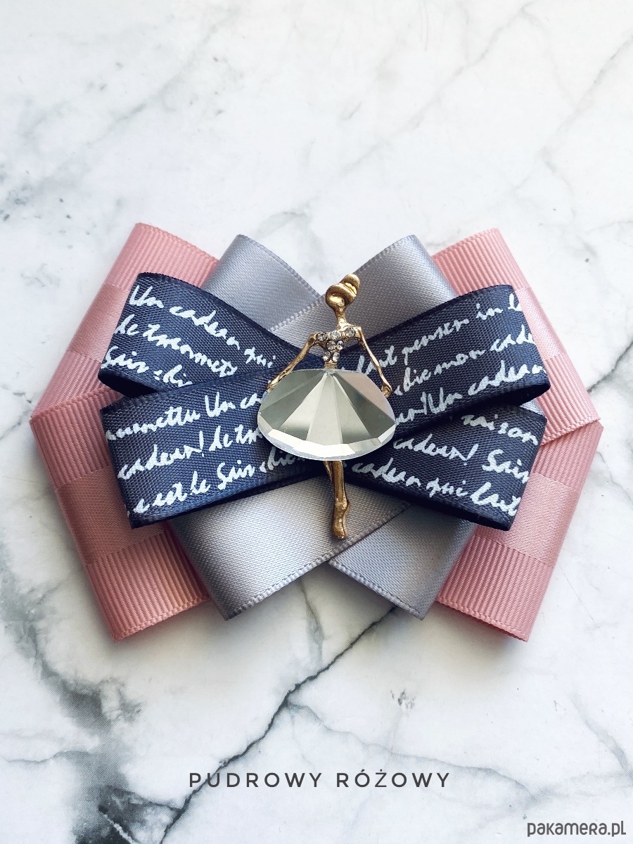 Brosza wykonana z wysokiej jakości taśm i dodatków. Broszka w kolorach pudrowego różu, szarości z dodatkiem prześlicznej wstążki z napisami. Piękna oryginalna ozdoba na środku Dama wykonana z kryształków. Będzie idealnie pasować zarówno do koszul, bluzek, swetrów, sukienek, żakietów oraz do płaszczy, kurtek, szali i chust. Idealna do każdej stylizacji, zarówno do sportowej jak również do eleganckich stylizacji.