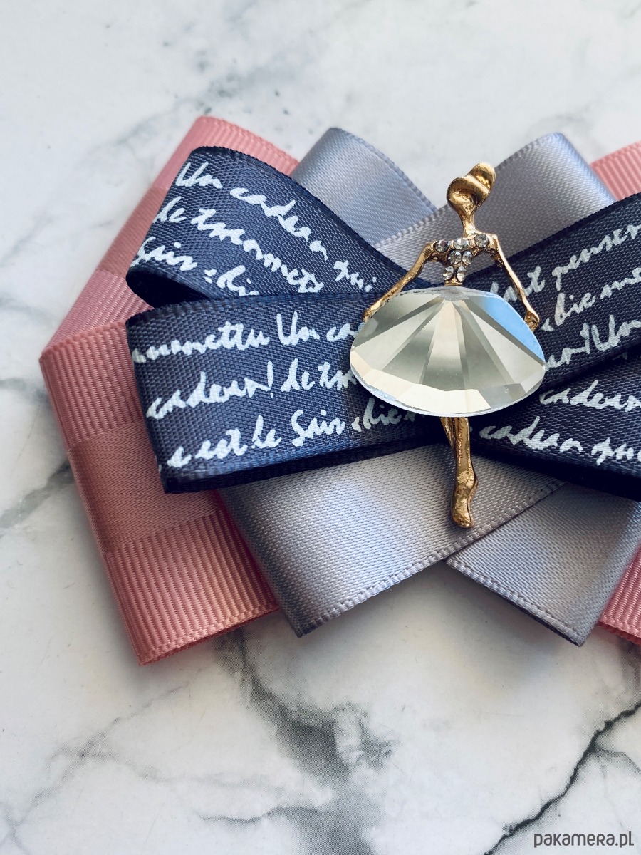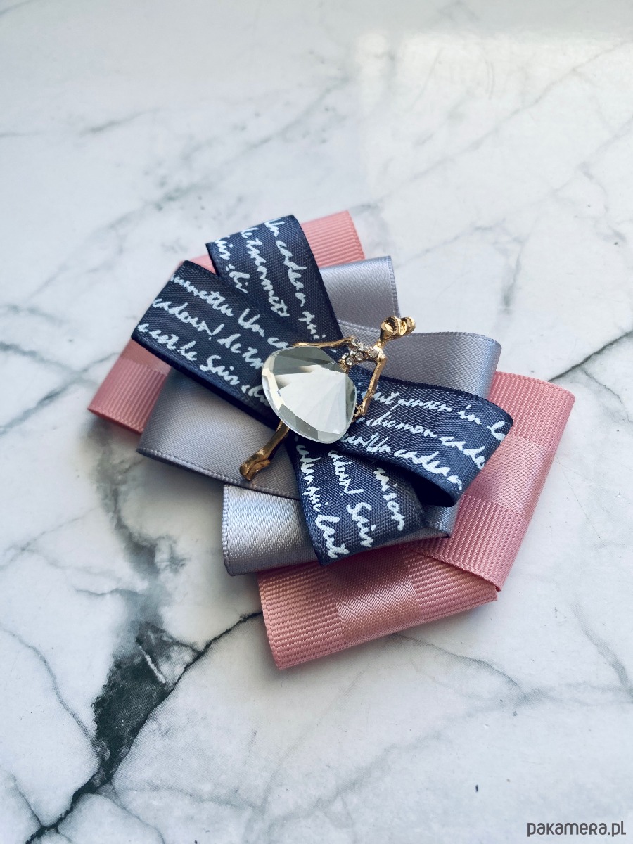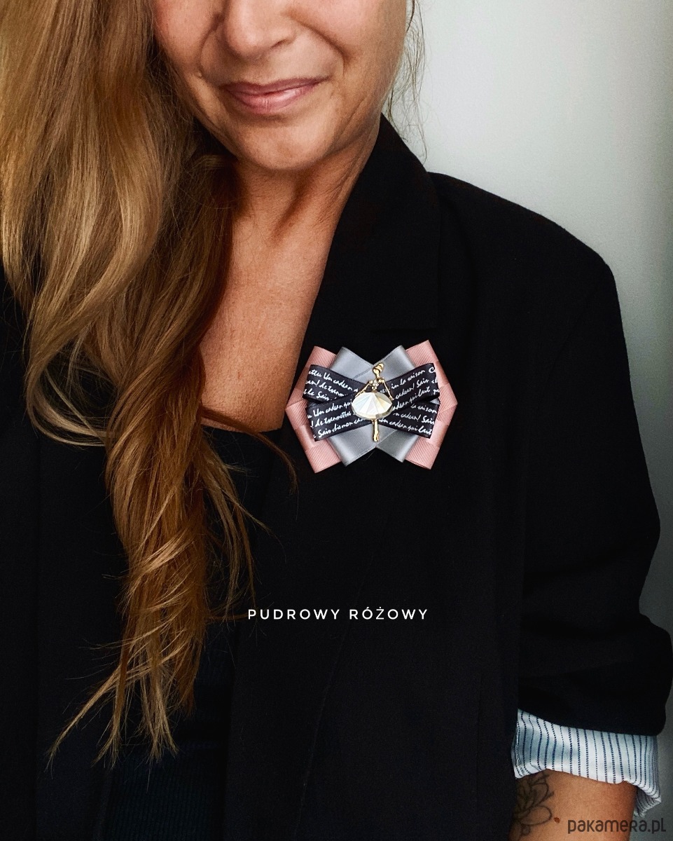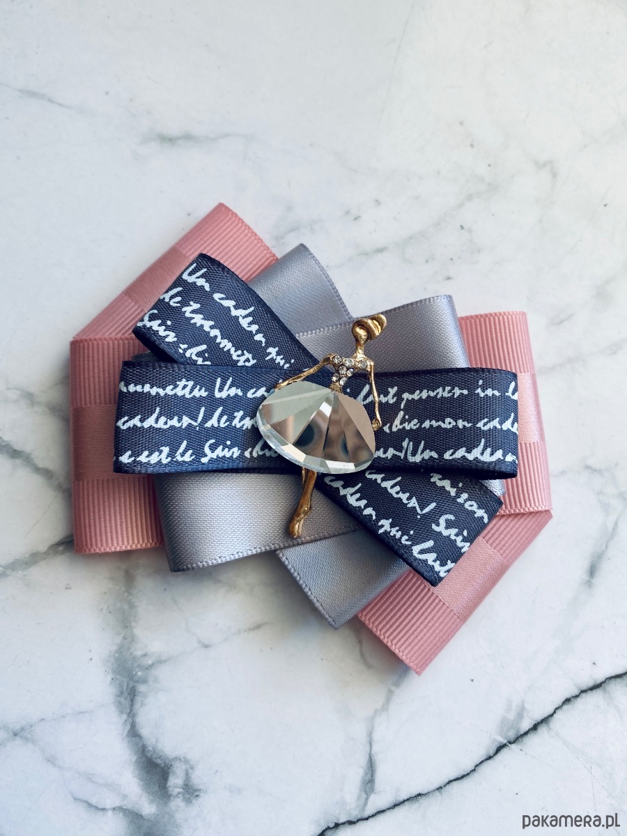 Brosza wykonana z wysokiej jakości taśm i dodatków. Broszka w kolorach pudrowego różu, szarości z dodatkiem prześlicznej wstążki z napisami. Piękna oryginalna ozdoba na środku Dama wykonana z kryształków. Będzie idealnie pasować zarówno do koszul, bluzek, swetrów, sukienek, żakietów oraz do płaszczy, kurtek, szali i chust. Idealna do każdej stylizacji, zarówno do sportowej jak również do eleganckich stylizacji.