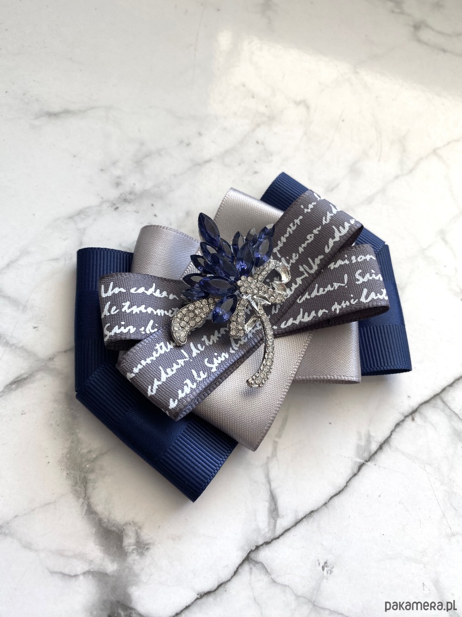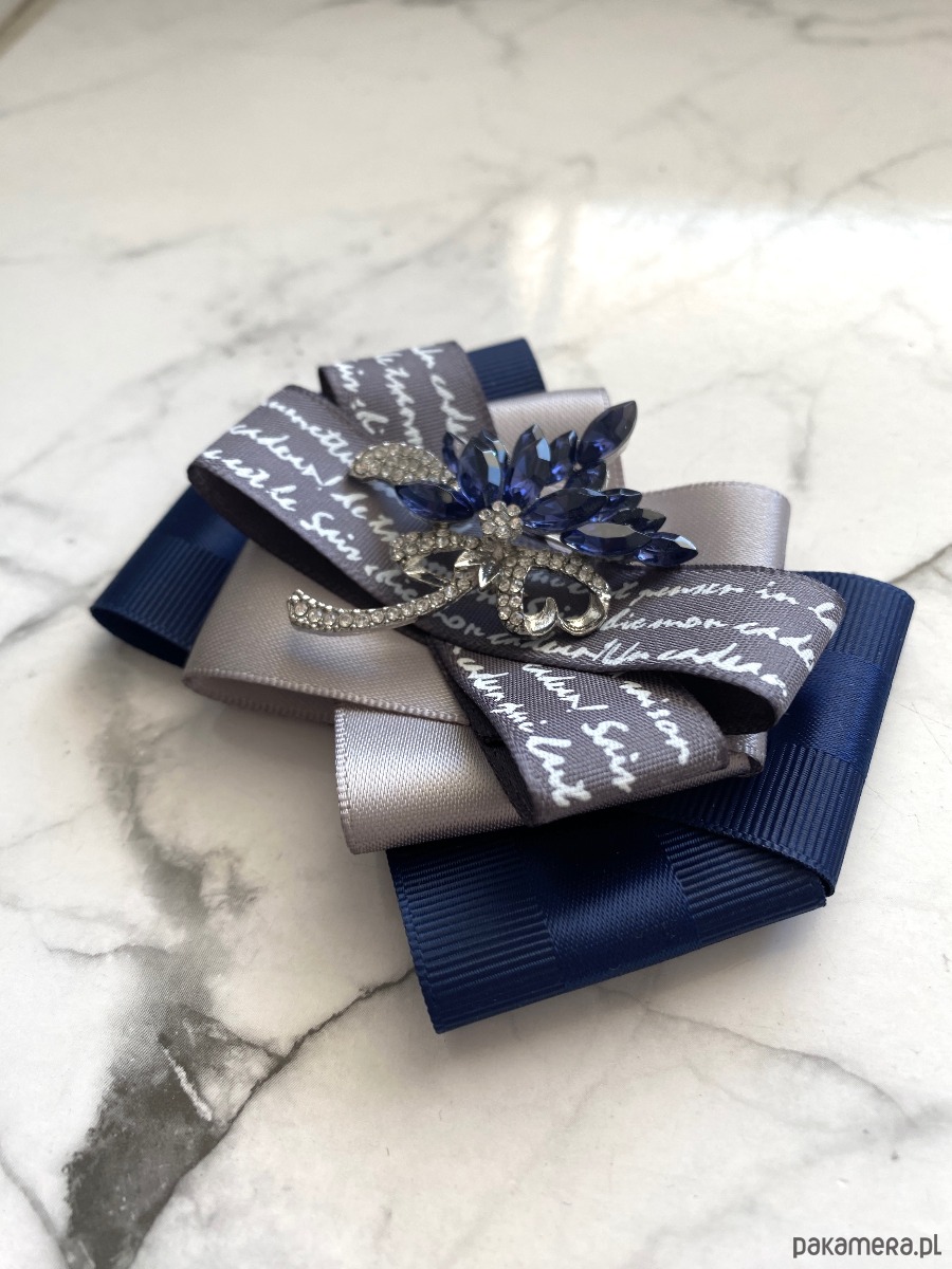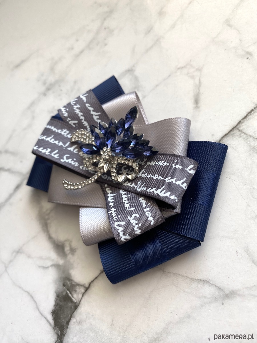 Brosza wykonana z wysokiej jakości taśm i dodatków. Broszka w kolorach granatu i szarości z dodatkiem prześlicznej wstążki z napisami. Piękna oryginalna ozdoba na środku kwiat wykonany z kryształków. Będzie idealnie pasować zarówno do koszul, bluzek, swetrów, sukienek, żakietów oraz do płaszczy, kurtek, szali i chust. Idealna do każdej stylizacji, zarówno do sportowej jak również do eleganckich stylizacji.