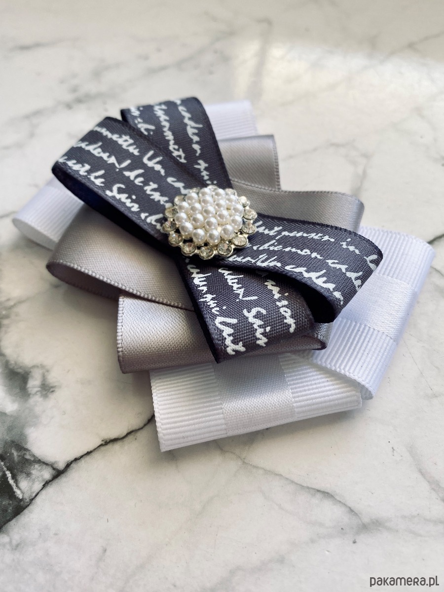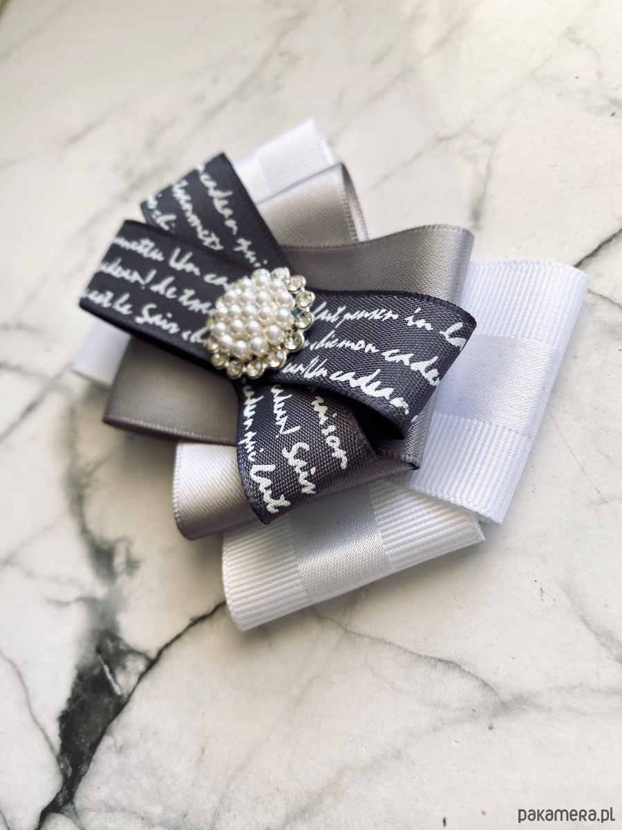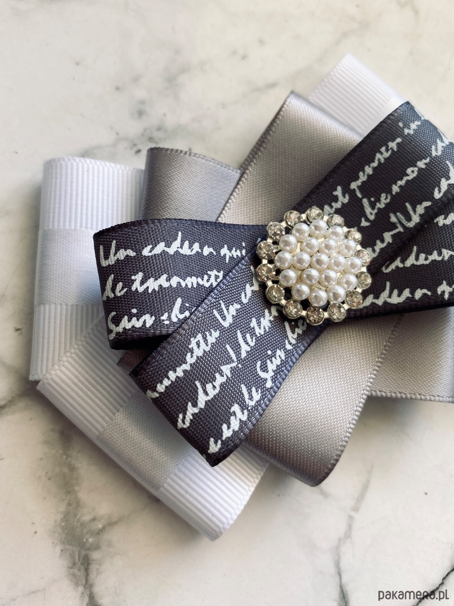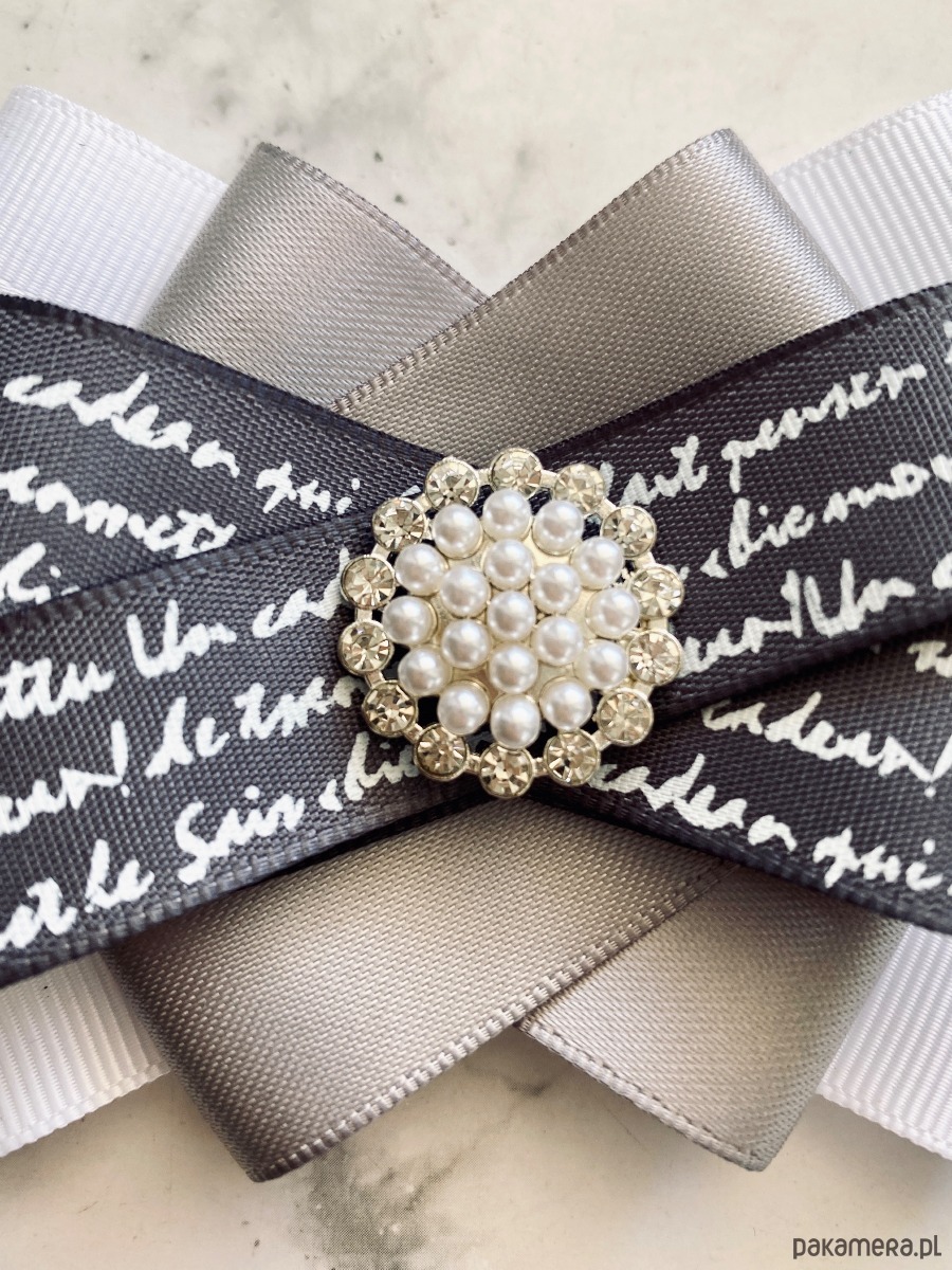 Brosza wykonana z wysokiej jakości taśm i dodatków. Broszka w kolorach bieli szarości z dodatkiem prześlicznej wstążki z napisami. Piękna delikatna ozdoba na środku wykonana z drobnych perełek i z kryształków. Będzie idealnie pasować zarówno do koszul, bluzek, swetrów, sukienek, żakietów oraz do płaszczy, kurtek, szali i chust. Idealna do każdej stylizacji, zarówno do sportowej jak również do eleganckich stylizacji.