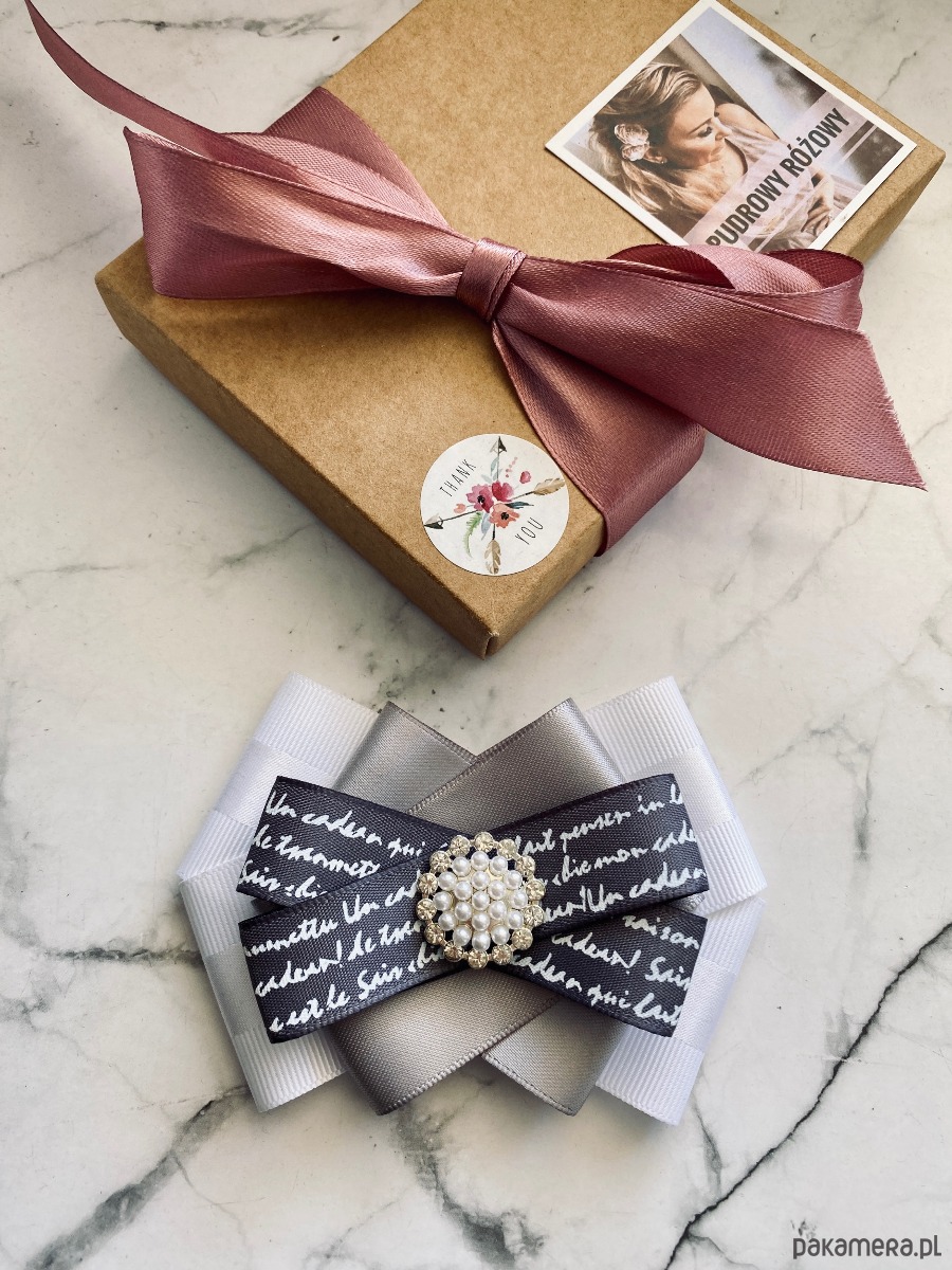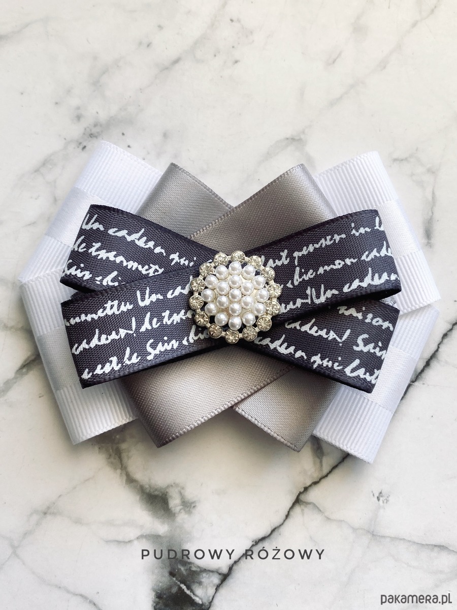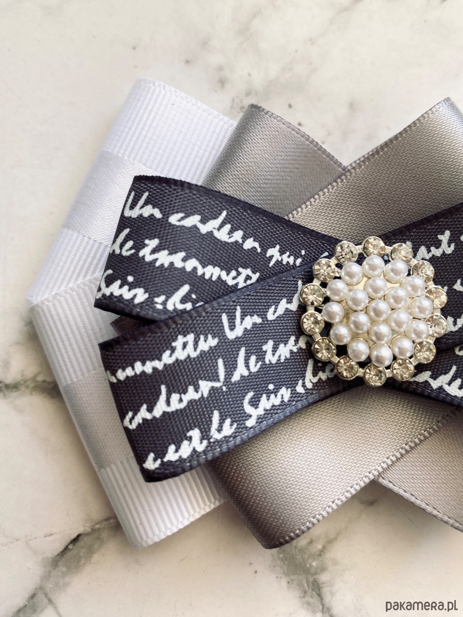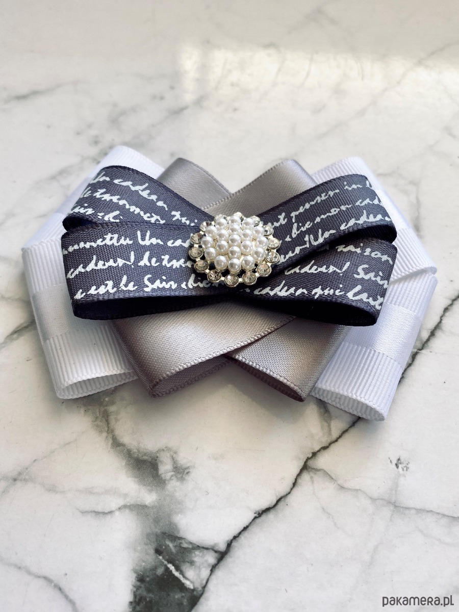 Brosza wykonana z wysokiej jakości taśm i dodatków. Broszka w kolorach bieli szarości z dodatkiem prześlicznej wstążki z napisami. Piękna delikatna ozdoba na środku wykonana z drobnych perełek i z kryształków. Będzie idealnie pasować zarówno do koszul, bluzek, swetrów, sukienek, żakietów oraz do płaszczy, kurtek, szali i chust. Idealna do każdej stylizacji, zarówno do sportowej jak również do eleganckich stylizacji.