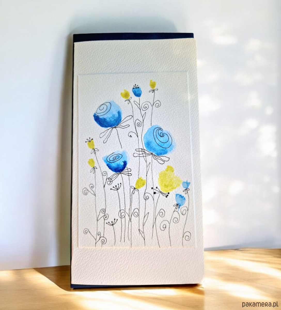 Oto kartka, która doda blasku każdej okazji! Ręcznie malowana na grubym papierze z fakturą, z subtelnymi, niebieskimi i żółtymi kwiatuszkami, które wyglądają jakby wyszły spod artystycznego pędzla motyla z wyjątkowym poczuciem humoru.