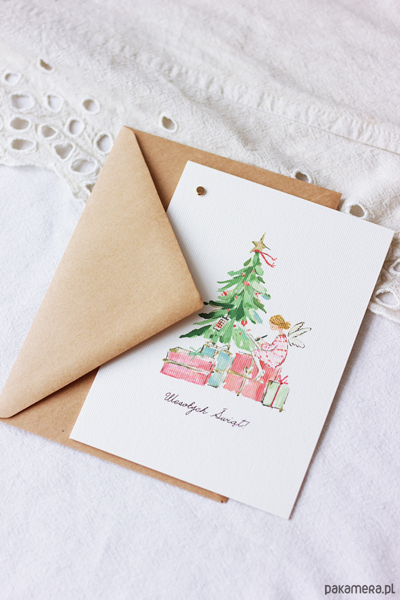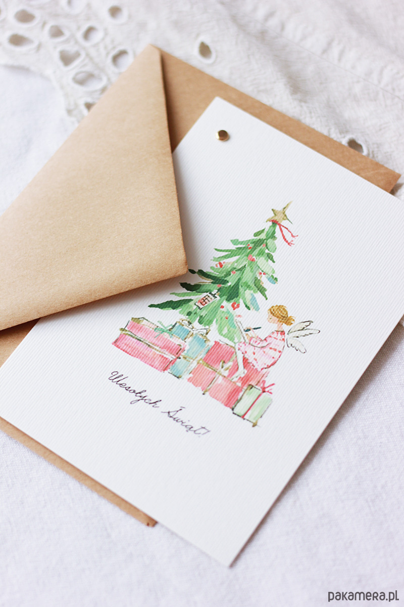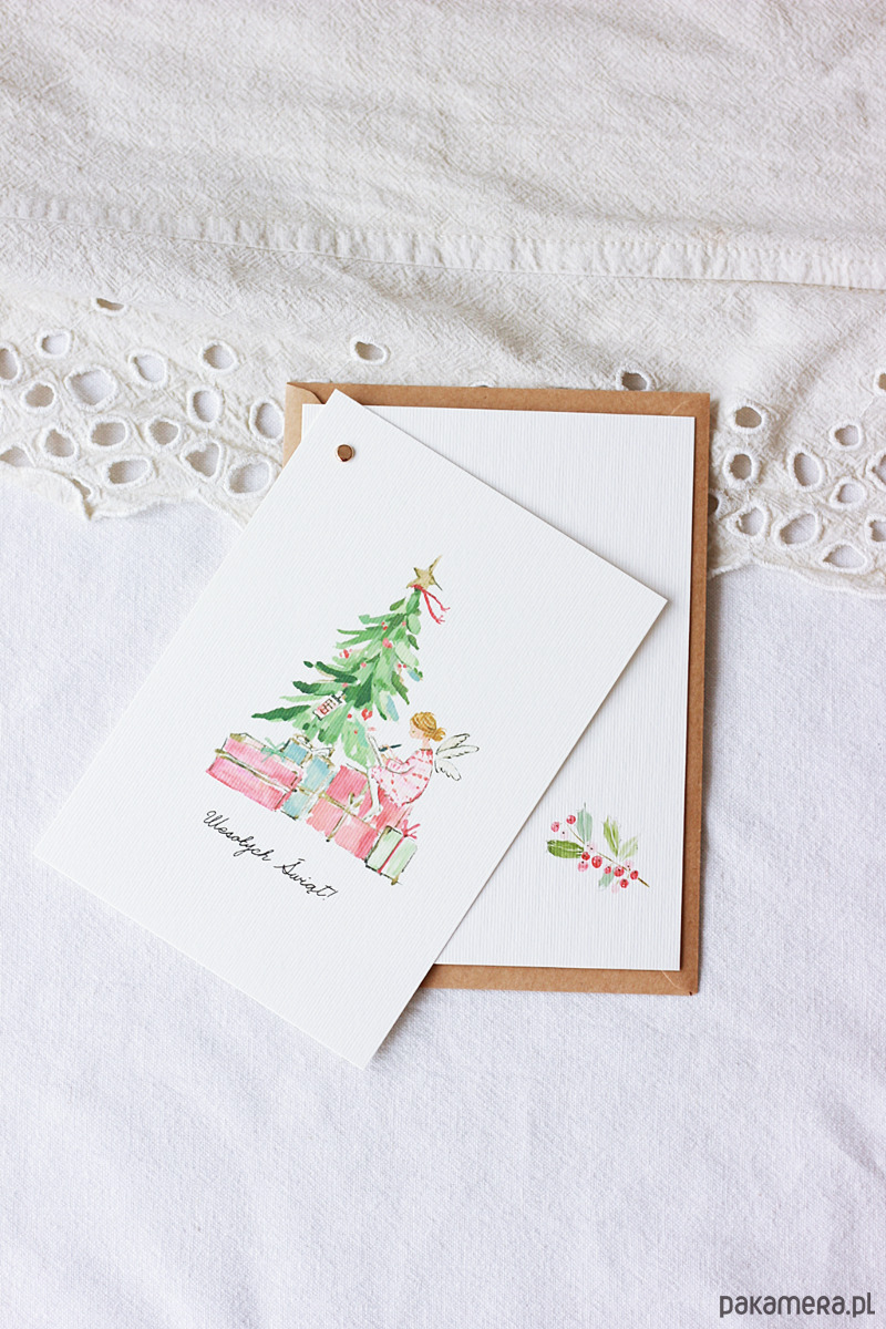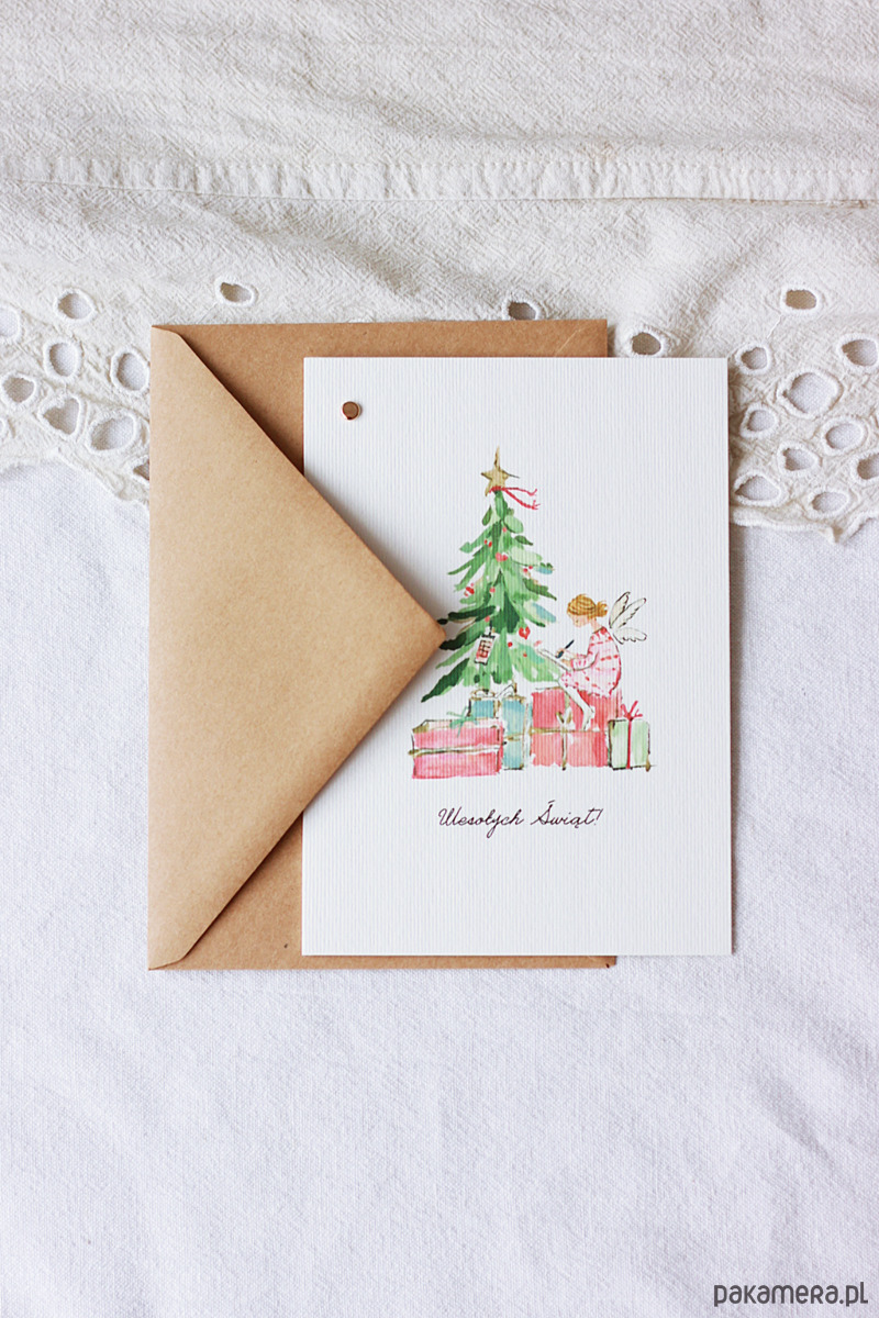 Delikatna kartka świąteczna z motywem choinki i wróżki. Prosta i elegancka.