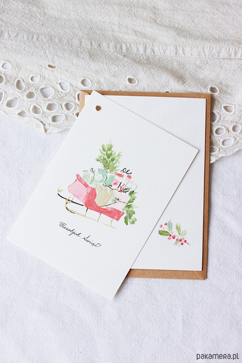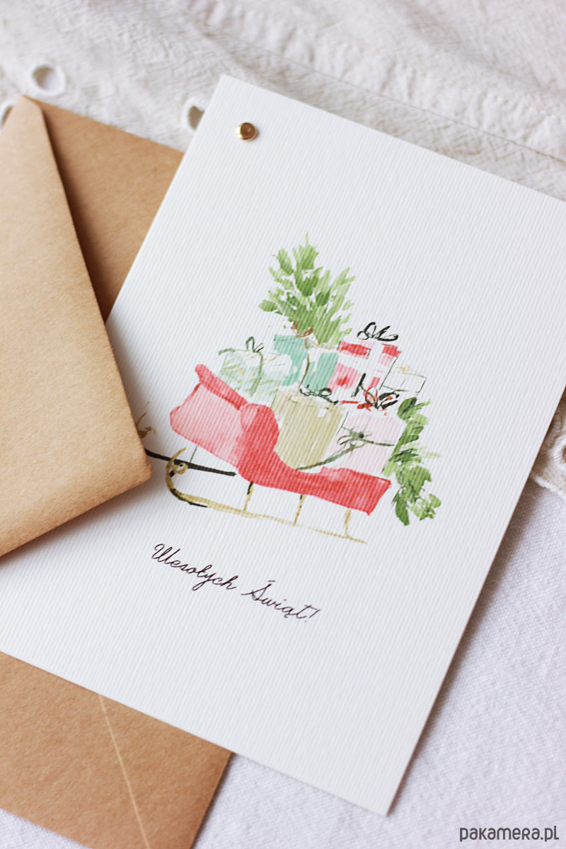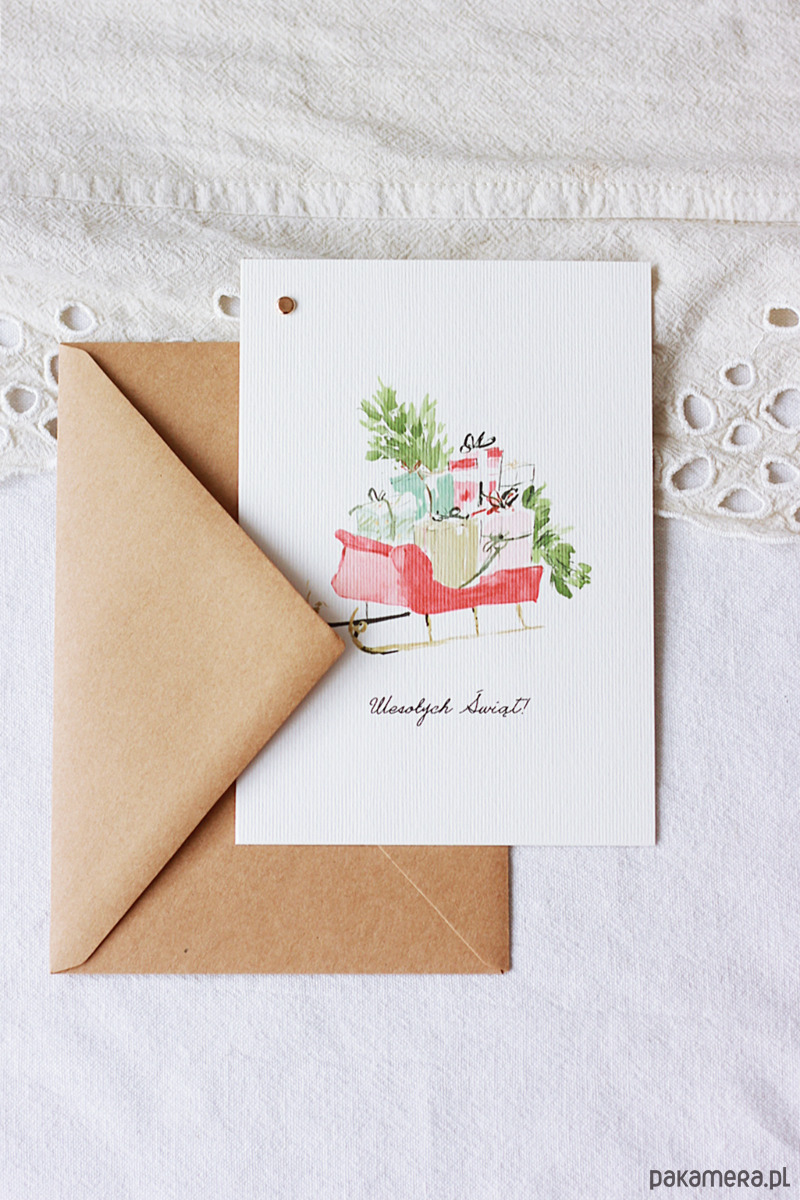 Delikatna kartka świąteczna z motywem sań. Prosta i elegancka.