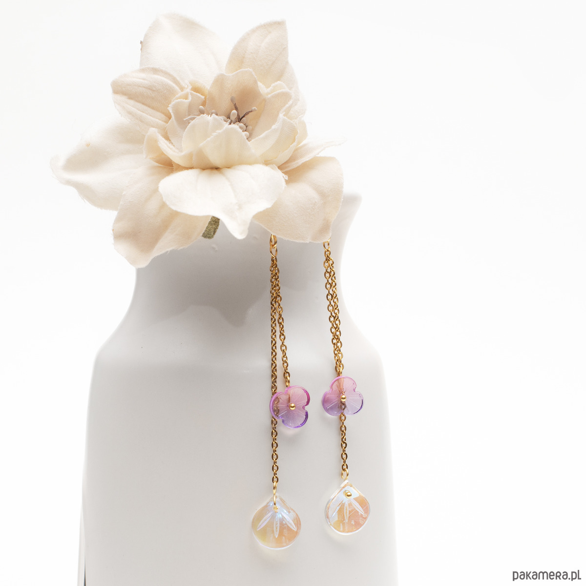 Delikatne, długie kolczyki pozłacane ze szklanymi kwiatkami