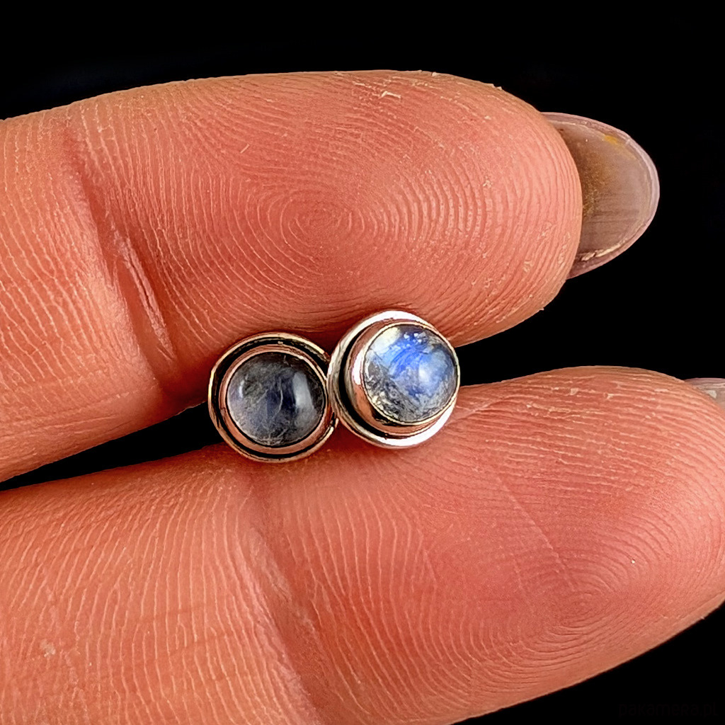 Kolczyki własnoręcznie wykonane ze srebra próby 925 oraz pięknych kamieni księżycowych. Średnica elementów z kamieniami 6 mm. Waga jednego kolczyka 0,4 grama. Kolczyki zostaną zapakowane w ozdobne pudełeczko.