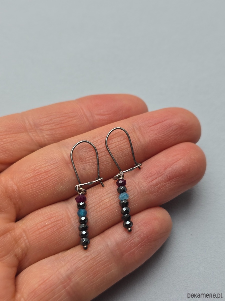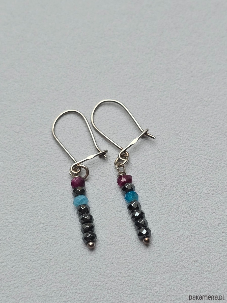 Minimalistyczne kolczyki z 3mm oponek fasetowanych hematytów, rubinów i apatytów.