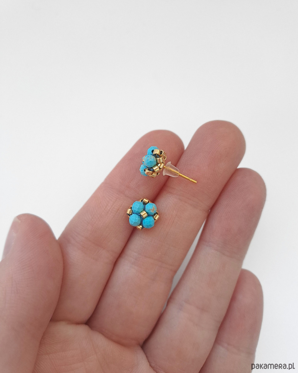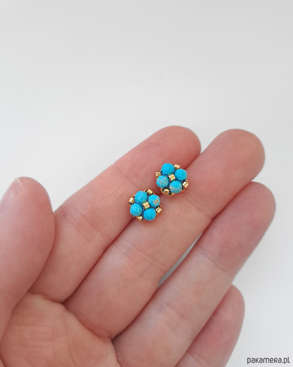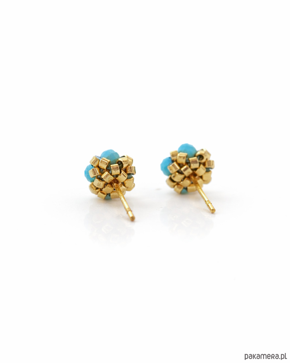 Sztyfty z turkusem zachwycają intensywnym, morskim odcieniem przełamanym naturalnym rysunkiem kamienia. Złota oprawa z koralików Miyuki dodaje im ciepła i elegancji, pięknie podkreślając nasyconą barwę turkusu. To połączenie tworzy wyrazistą, a jednocześnie harmonijną kompozycję, która rozświetla twarz i dodaje stylizacji świeżości. Niewielki rozmiar sprawia, że kolczyki są komfortowe w noszeniu przez cały dzień.