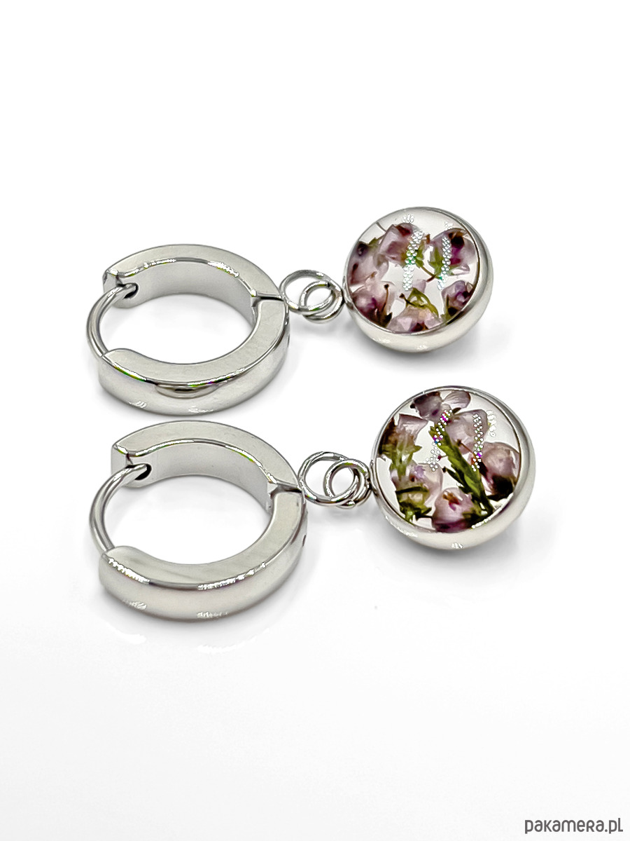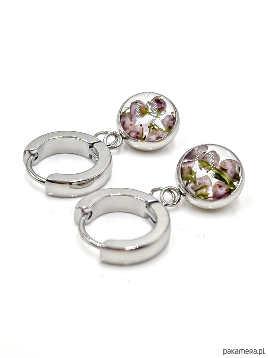 Delikatne kolczyki z drobnymi zawieszkami, w których utrwalone zostały prawdziwe kwiatuszki wrzosów. Do kompletu polecamy naszyjnik, bransoletkę oraz pierścionek z wrzosami.