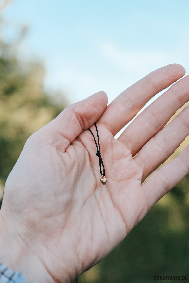 Delikatne tyci serduszko w kolorze miedzi - ciemnego złota - zawieszone na czarnym, przyjemnym w dotyku, rzemieniu.