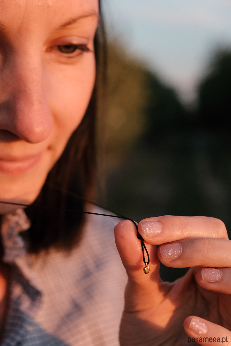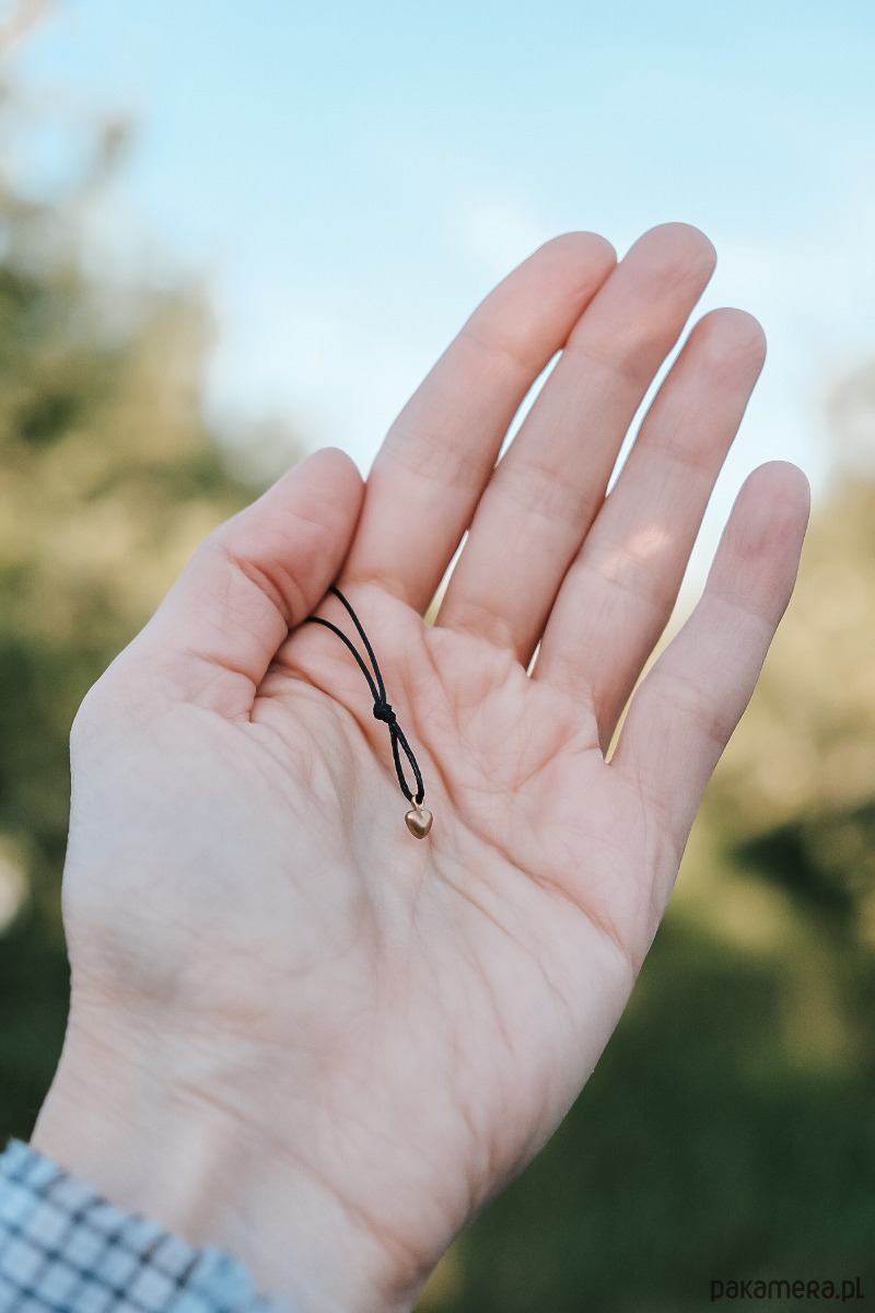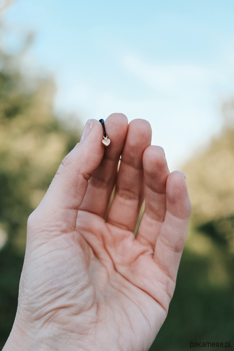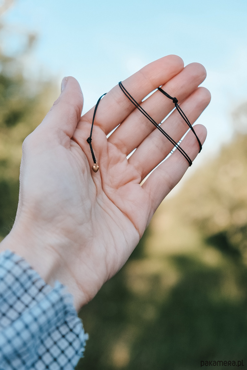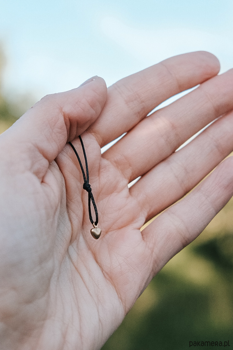 Delikatne tyci serduszko w kolorze miedzi - ciemnego złota - zawieszone na czarnym, przyjemnym w dotyku, rzemieniu.