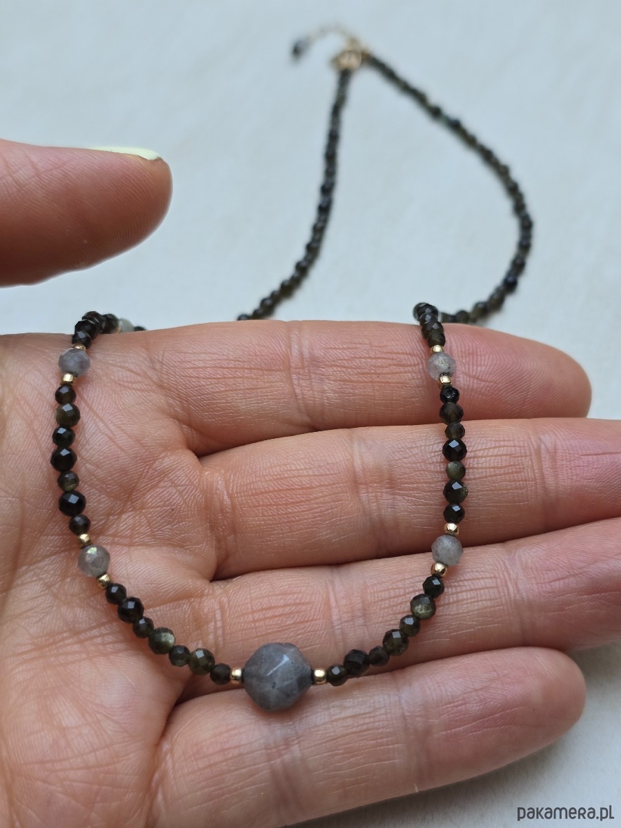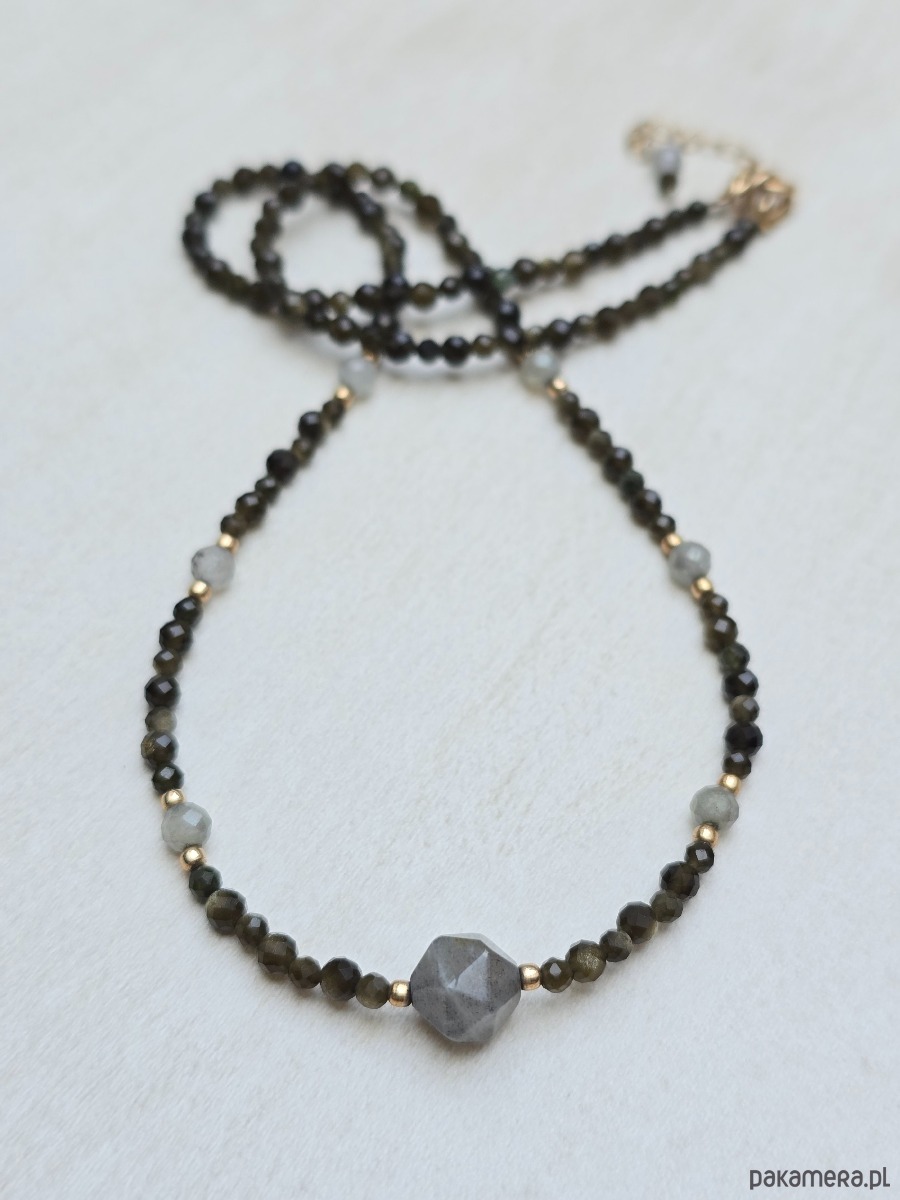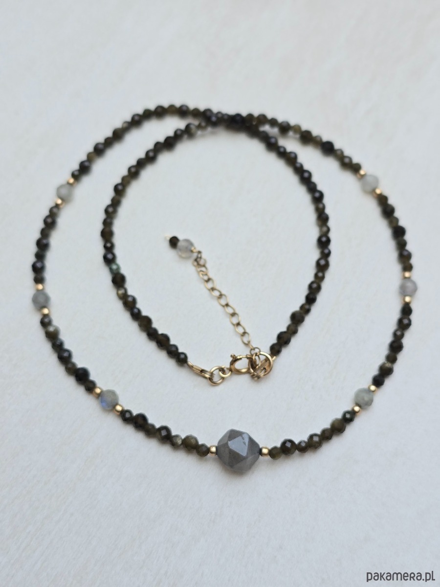 Krótki, delikatny naszyjnik z oliwinu i labradorytu.
