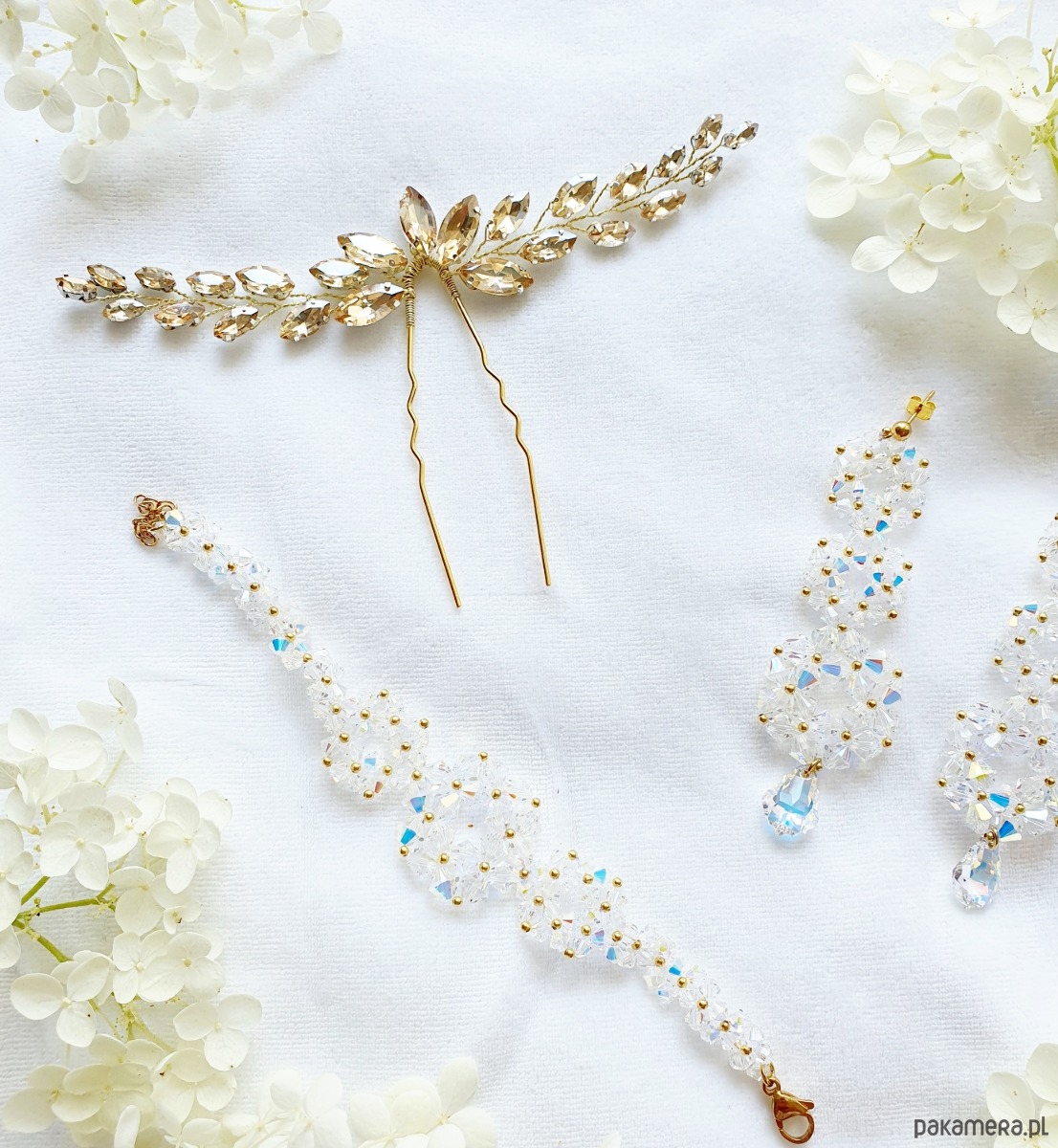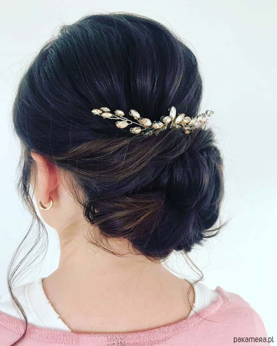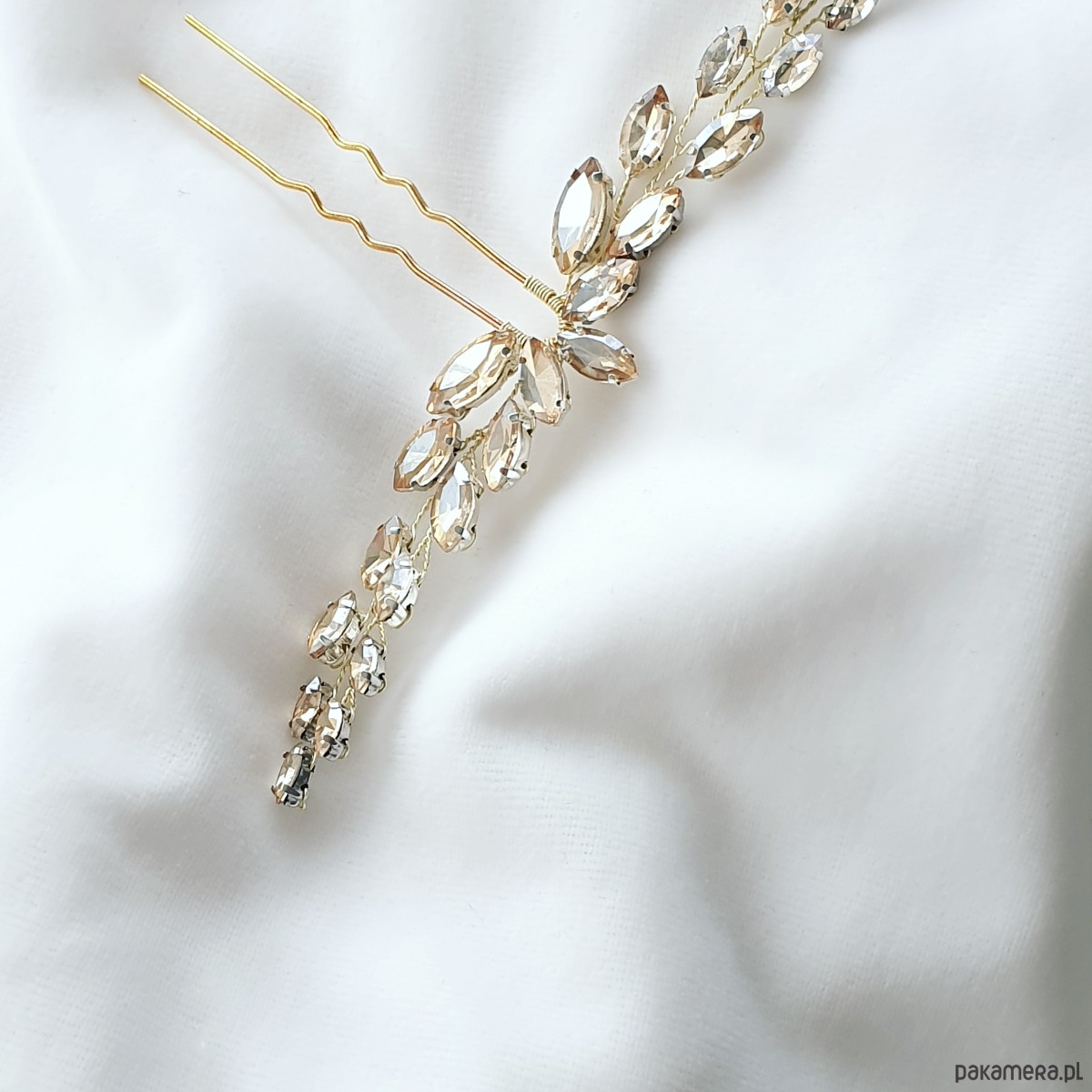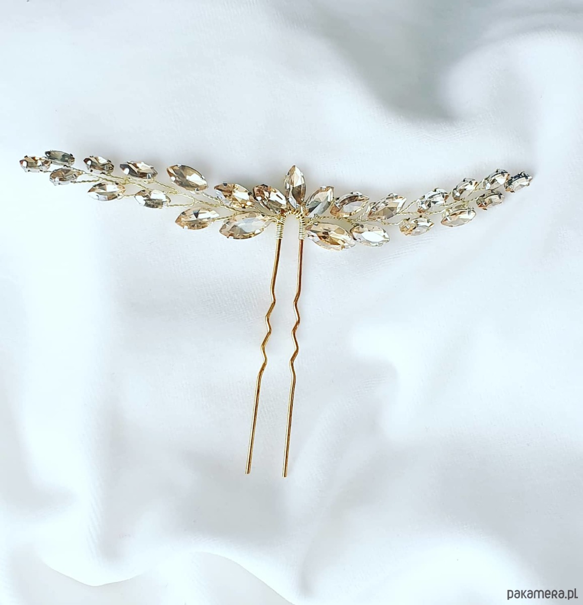 Delikatny grzebyk ślubny zrobiony z oprawionych kryształków Preciosa w kolorze szampańskim.