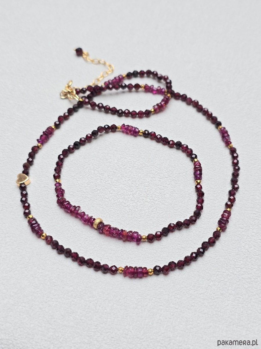 Delikatny komplet z granatu składający się z krótkiego naszyjnika i elastycznej bransoletki.
