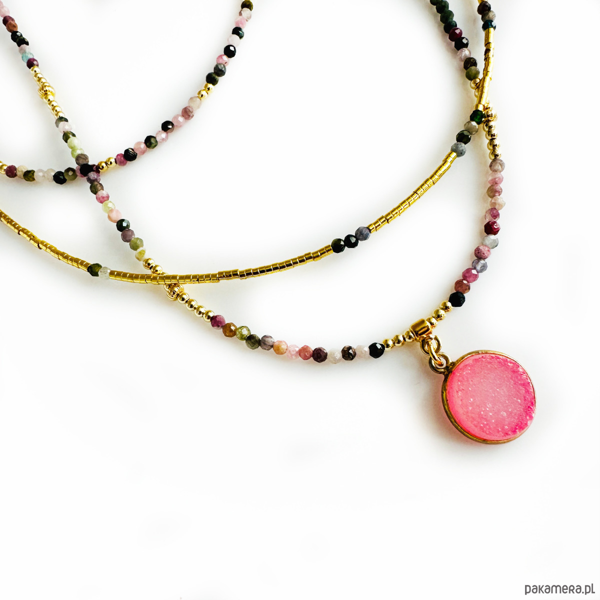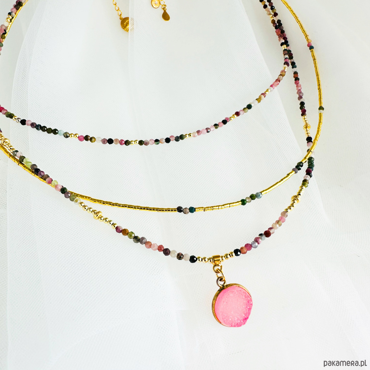 Zachwycający komplet ręcznie wykonanych naszyjników z fasetowanych, wielokolorowych turmalinów to połączenie subtelnej elegancji z artystyczną swobodą stylu boho. Delikatne, a zarazem przyciągające wzrok – będą wyjątkową ozdobą zarówno na co dzień, jak i na specjalne okazje.