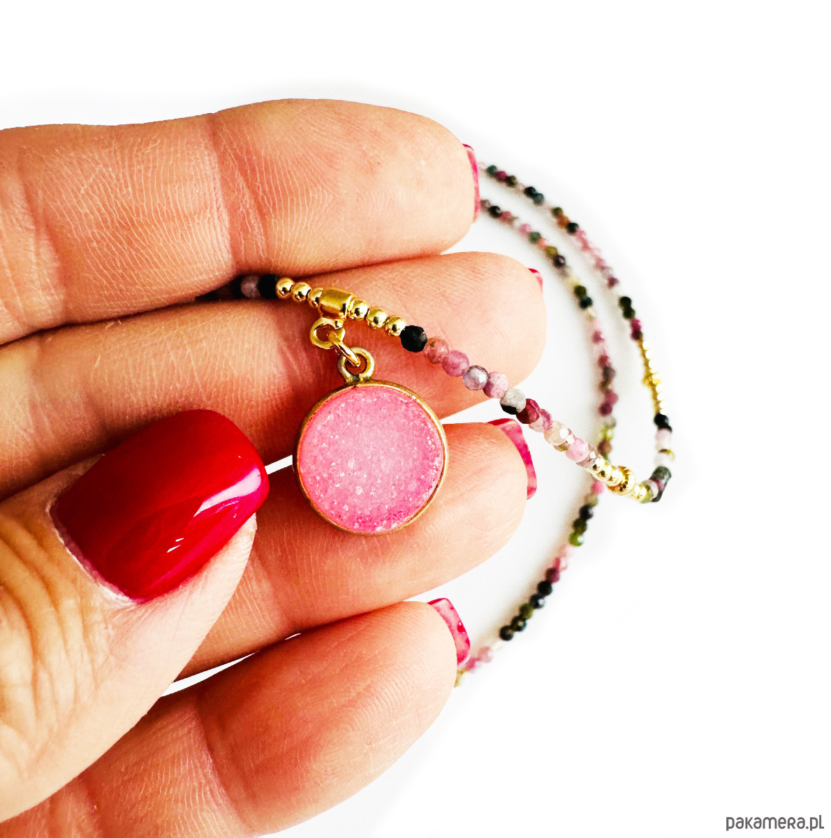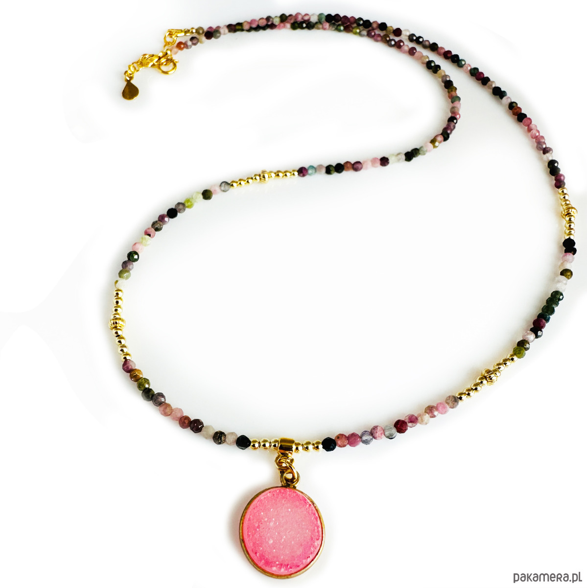 1. turmaliny z zawieszką z agatu oprawionego w pozłacane srebro.kamień w oprawie : agat druzy 13 mm, wysokość kamienia 4 mm, Długość :48 cm plus przedłużka 3 cm