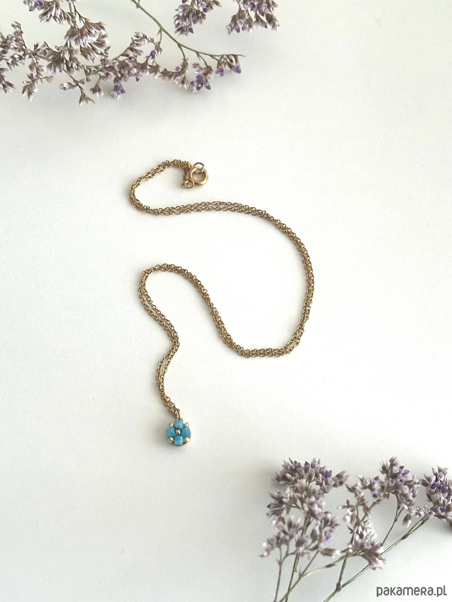 Łańcuszek długości 45cm, 5cm przedłużki . Sztyfty i wisiorek średnicy około 7mm. Kamienie apatytu przetykane koralikami toho w złotym kolorze.