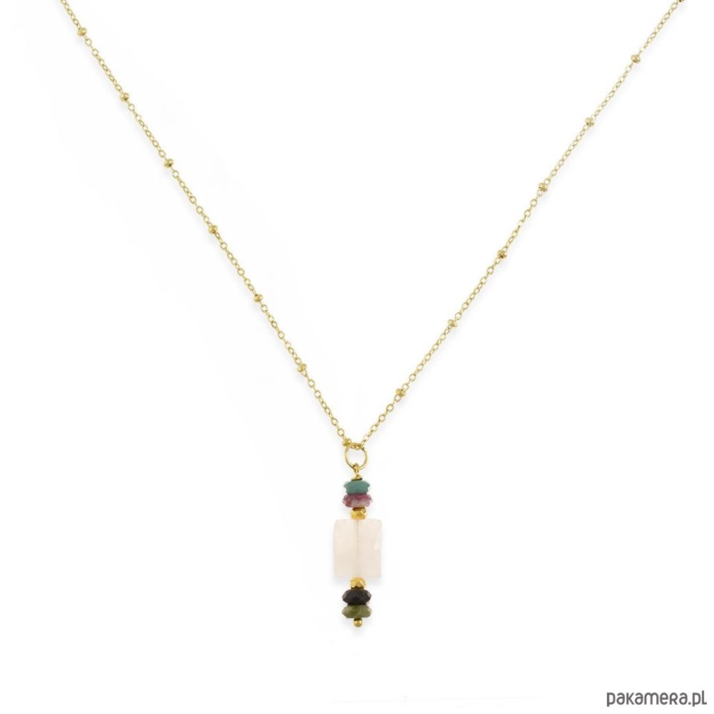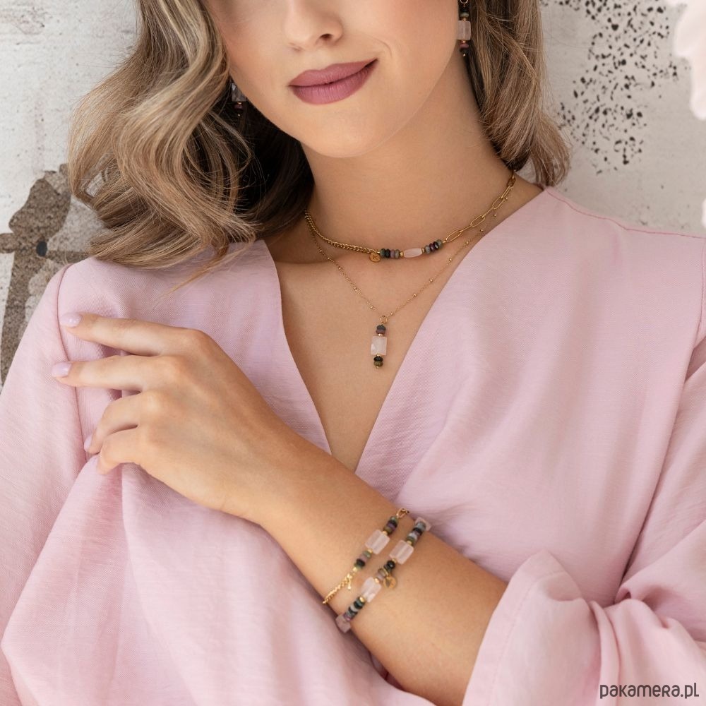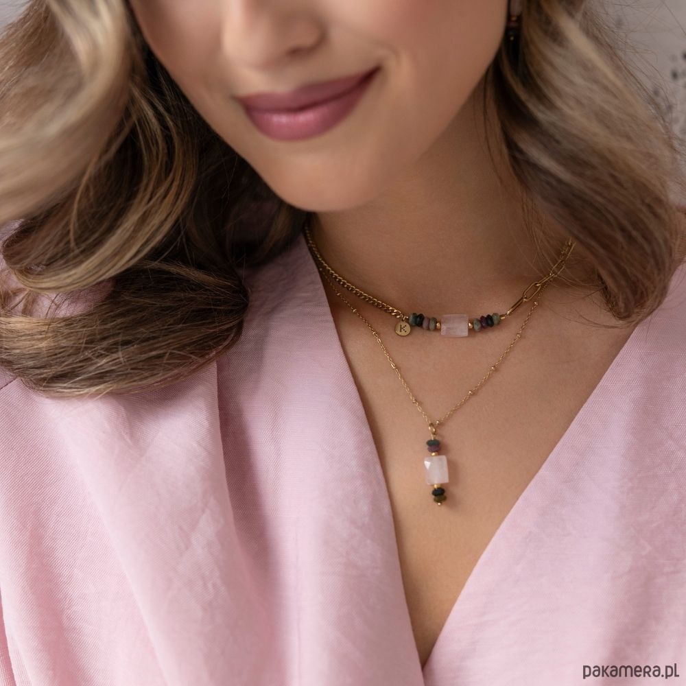 Z pozoru prosty – oparty na złotym, kulkowym łańcuszku ze stali chirurgicznej – zachwyca subtelnym blaskiem i lekkością. W centrum kompozycji znajduje się zawieszka z naturalnych kamieni: Kwarcu Różowego, Kolorowych Turmalinów i drobnego Hematytu.