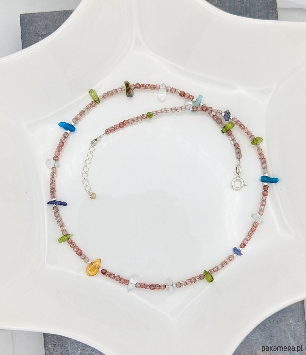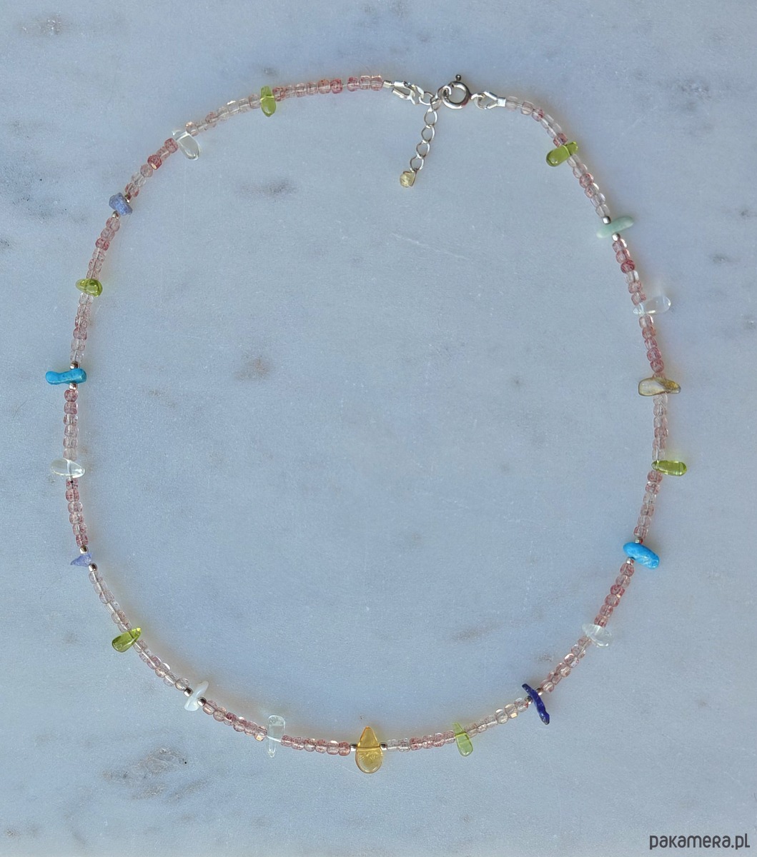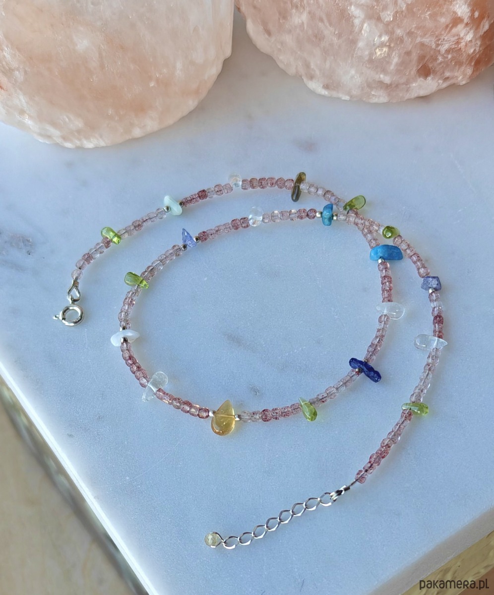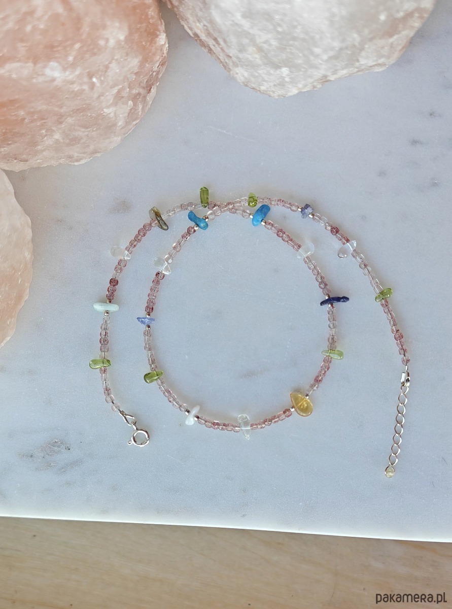 Naszyjnik wykonany z z wielu kolorowych kamieni i srebra. Idealny dla wielbicielek minerałów. Znajduje się tu aż osiem ich rodzajów: bazą jest kwarc truskawkowy, a pomiędzy umieszczone zostały nieregularne bryłki kamieni naturalnych: tanzanit, oliwin, akwamaryn, apatyt, cytryn, amazonit, labradoryt. Kamyki są barwne jak podświetlone morskie koralowce. Bardzo pozytywny i kreatywny.