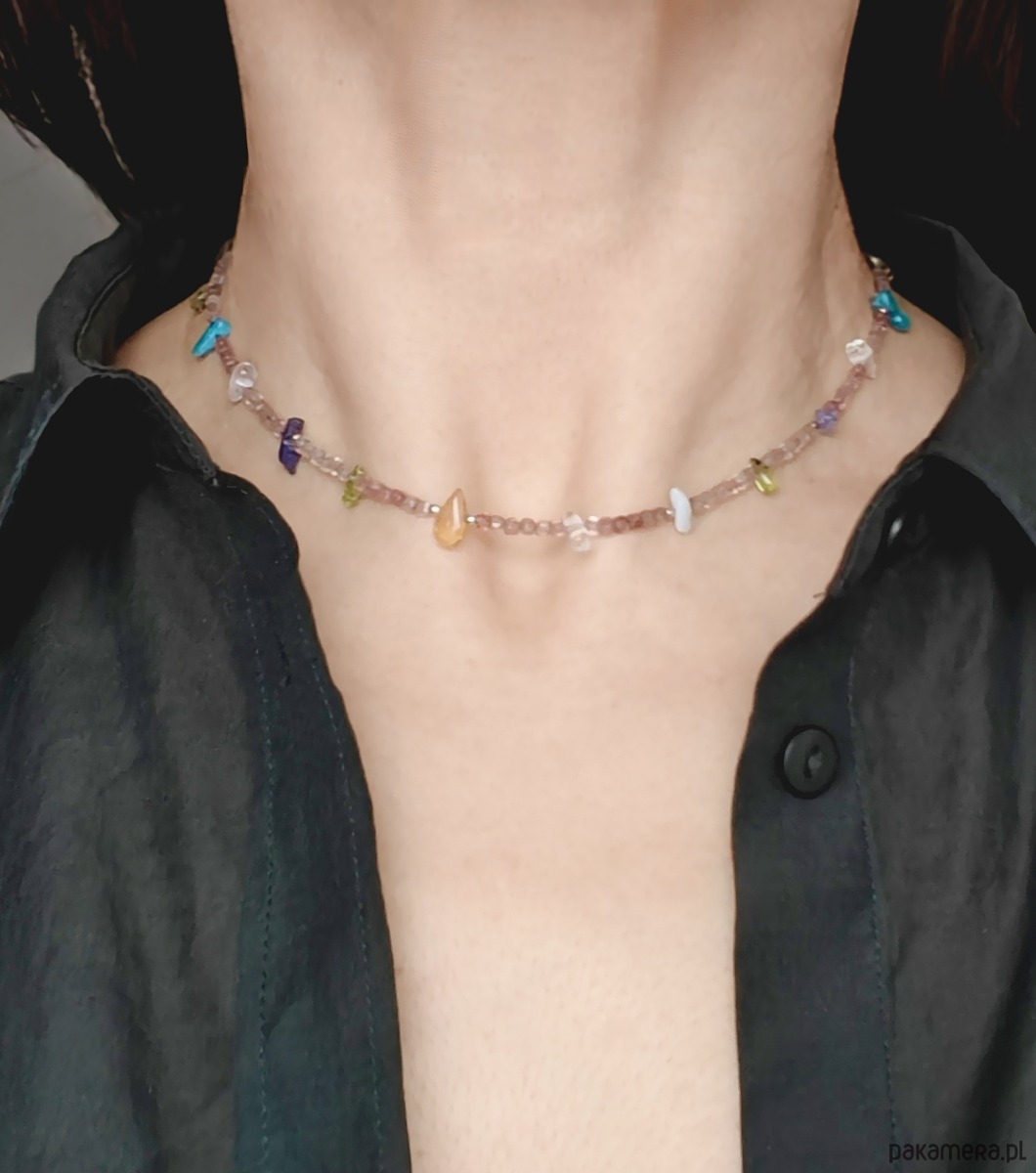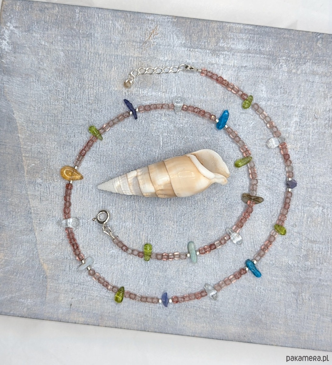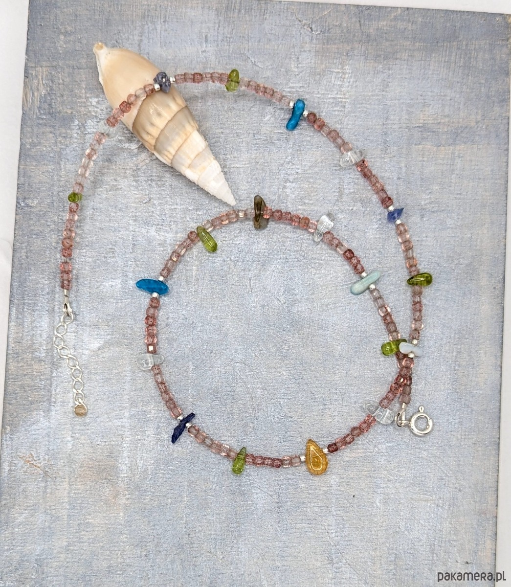 Naszyjnik wykonany z z wielu kolorowych kamieni i srebra. Idealny dla wielbicielek minerałów. Znajduje się tu aż osiem ich rodzajów: bazą jest kwarc truskawkowy, a pomiędzy umieszczone zostały nieregularne bryłki kamieni naturalnych: tanzanit, oliwin, akwamaryn, apatyt, cytryn, amazonit, labradoryt. Kamyki są barwne jak podświetlone morskie koralowce. Bardzo pozytywny i kreatywny.