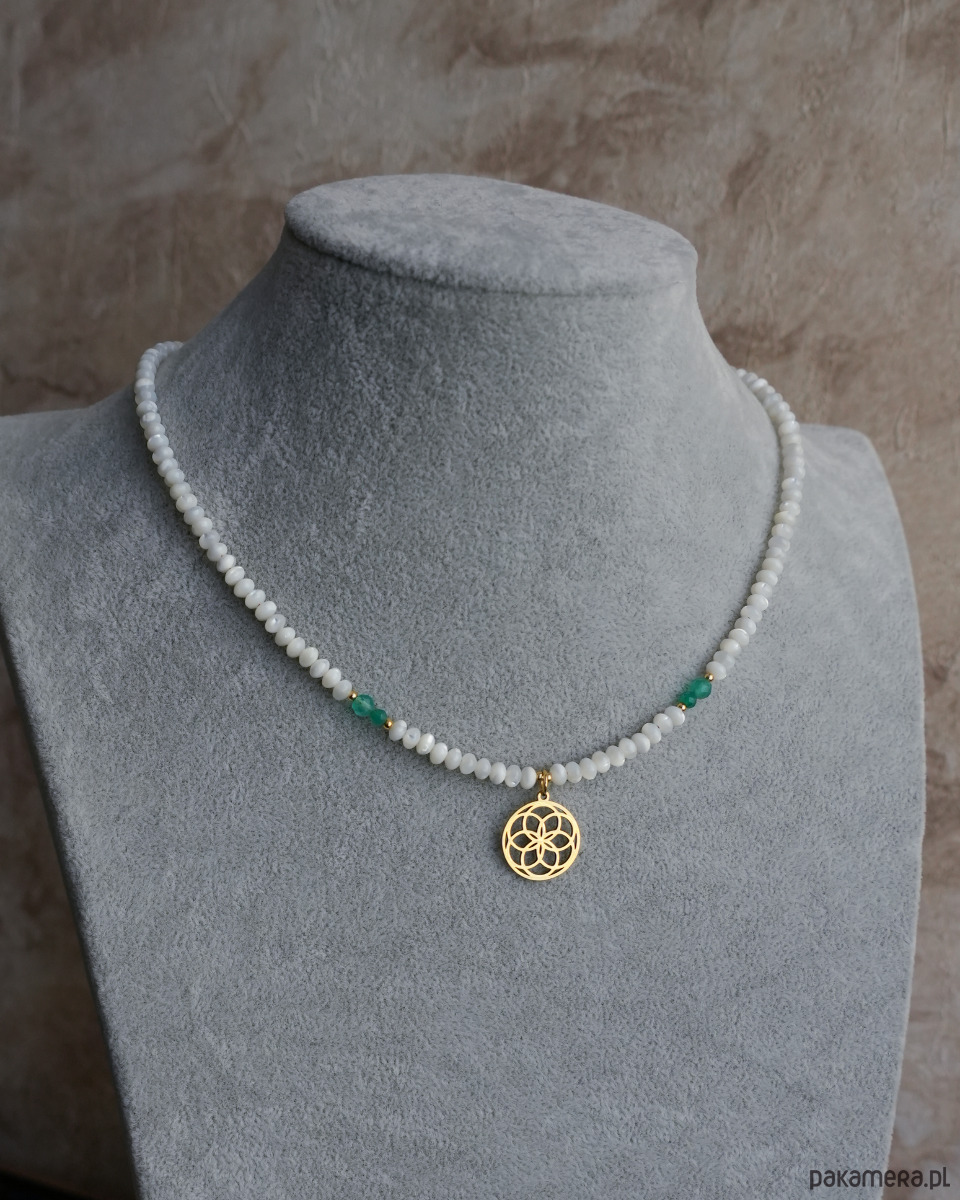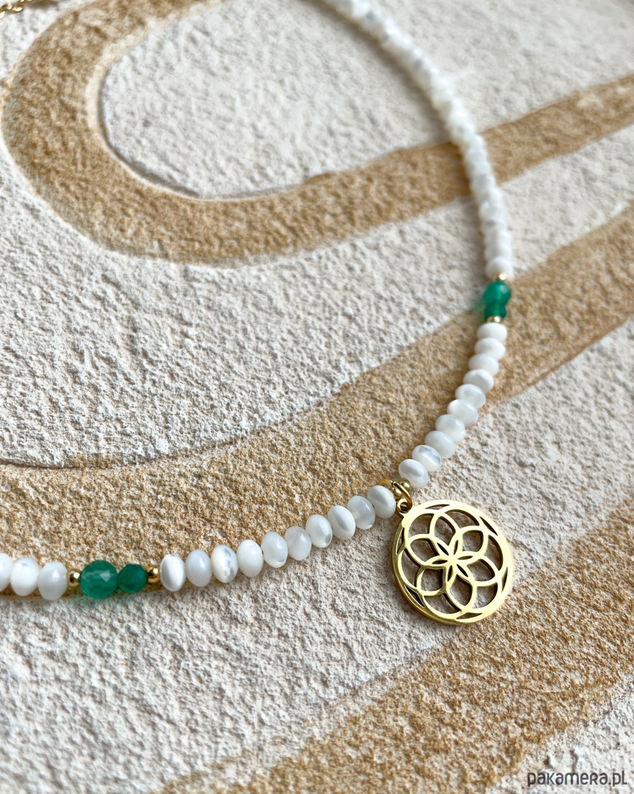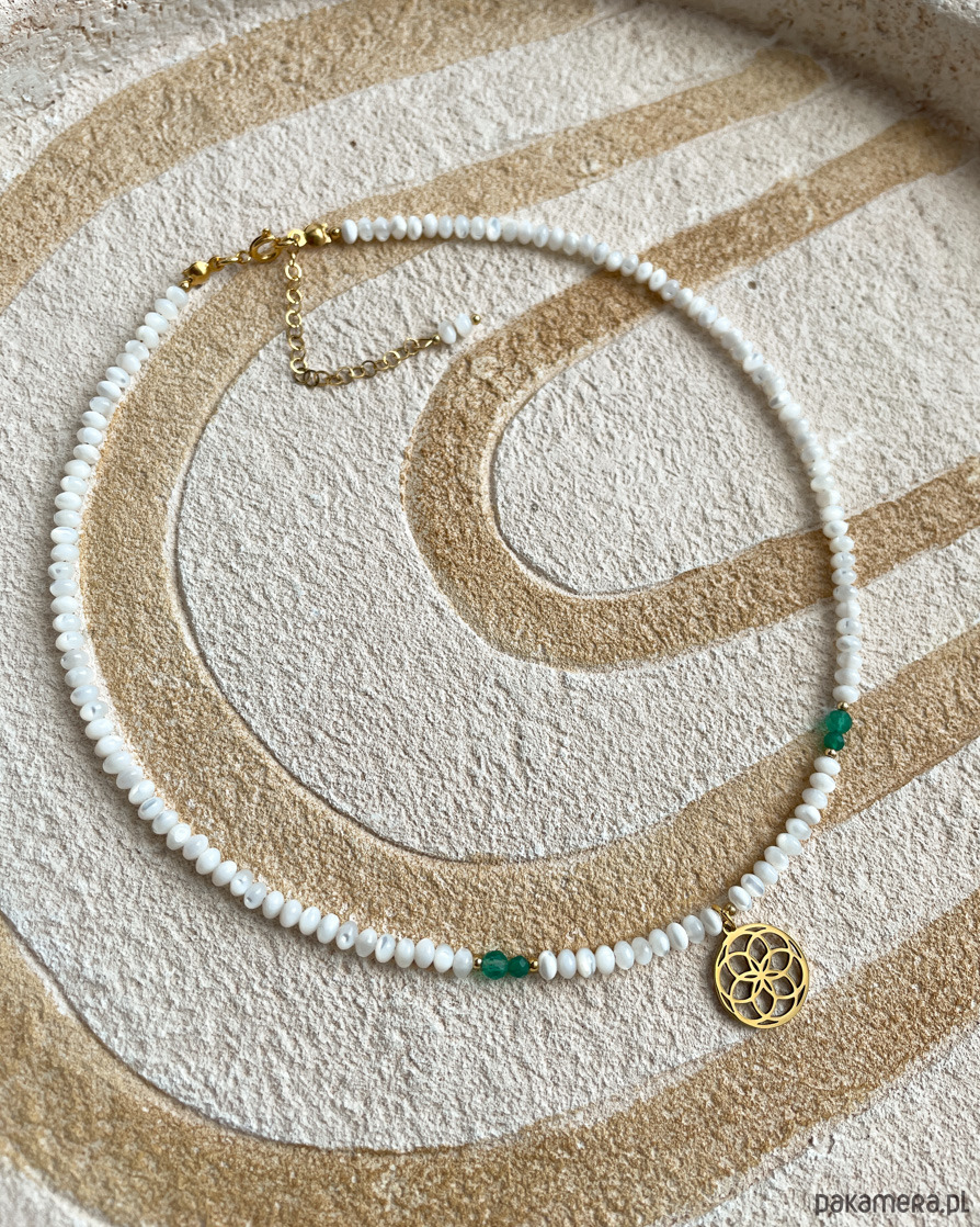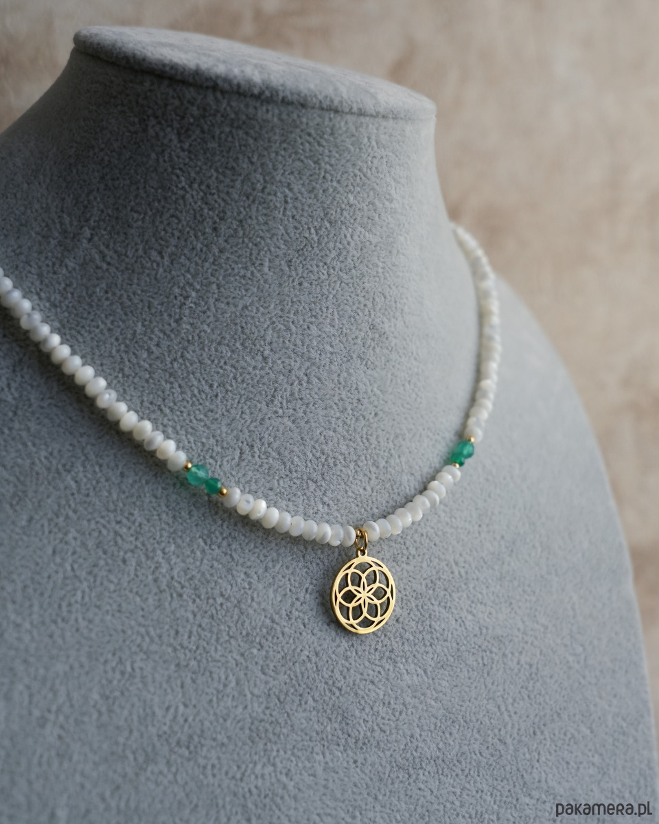 Delikatny i eteryczny naszyjnik (choker) wykonany z połyskującej MASY PERŁOWEJ i zielonego ONYKSU. Zawieszka, zapięcie i łańcuszek to STAL SZLACHETNA w kolorze złotym.