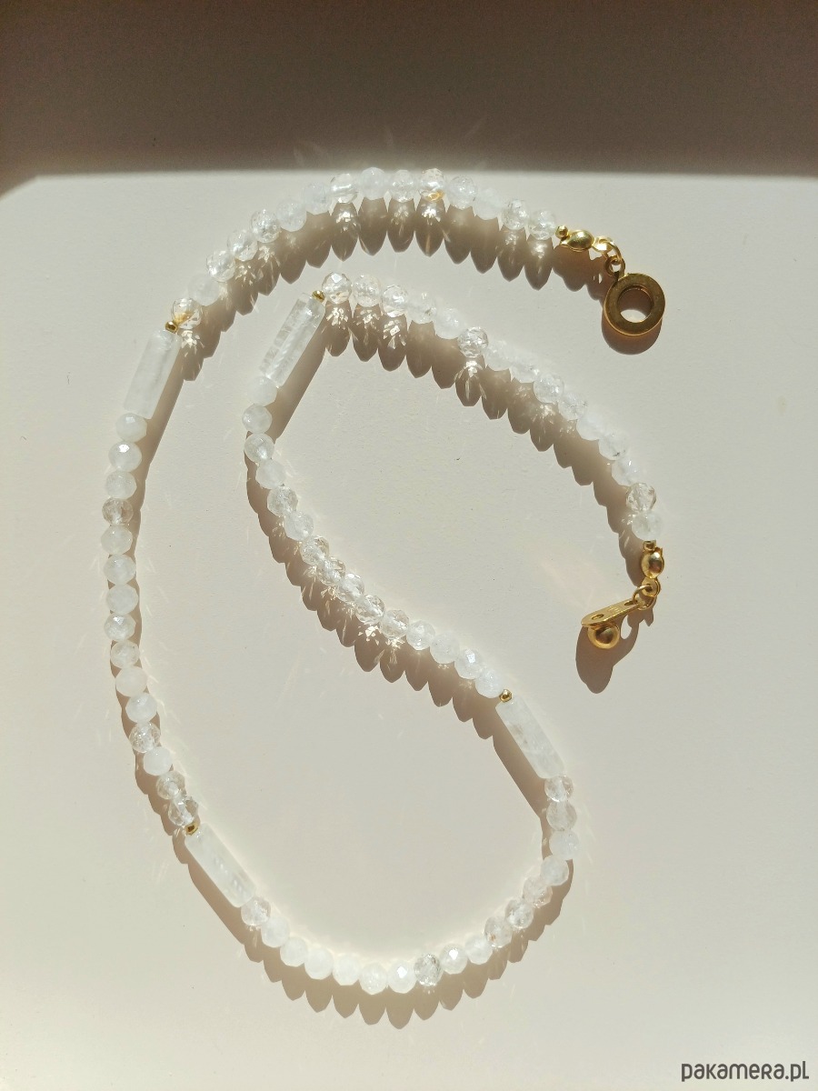 Bardzo kobiecy, delikatny naszyjnik wykonany z kryształu górskiego. Minimalizm, prostota i elegancja w jednym. Idealny dla kobiet ceniących sobie harmonię wokół siebie. Dopasowany na wyjątkowe okazje, do prostych stylizacji, jak również na co dzień.