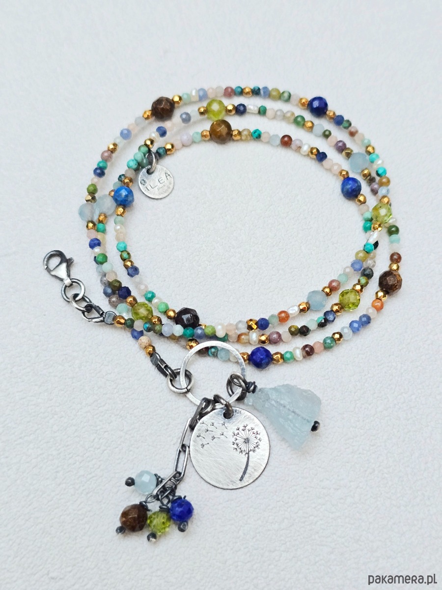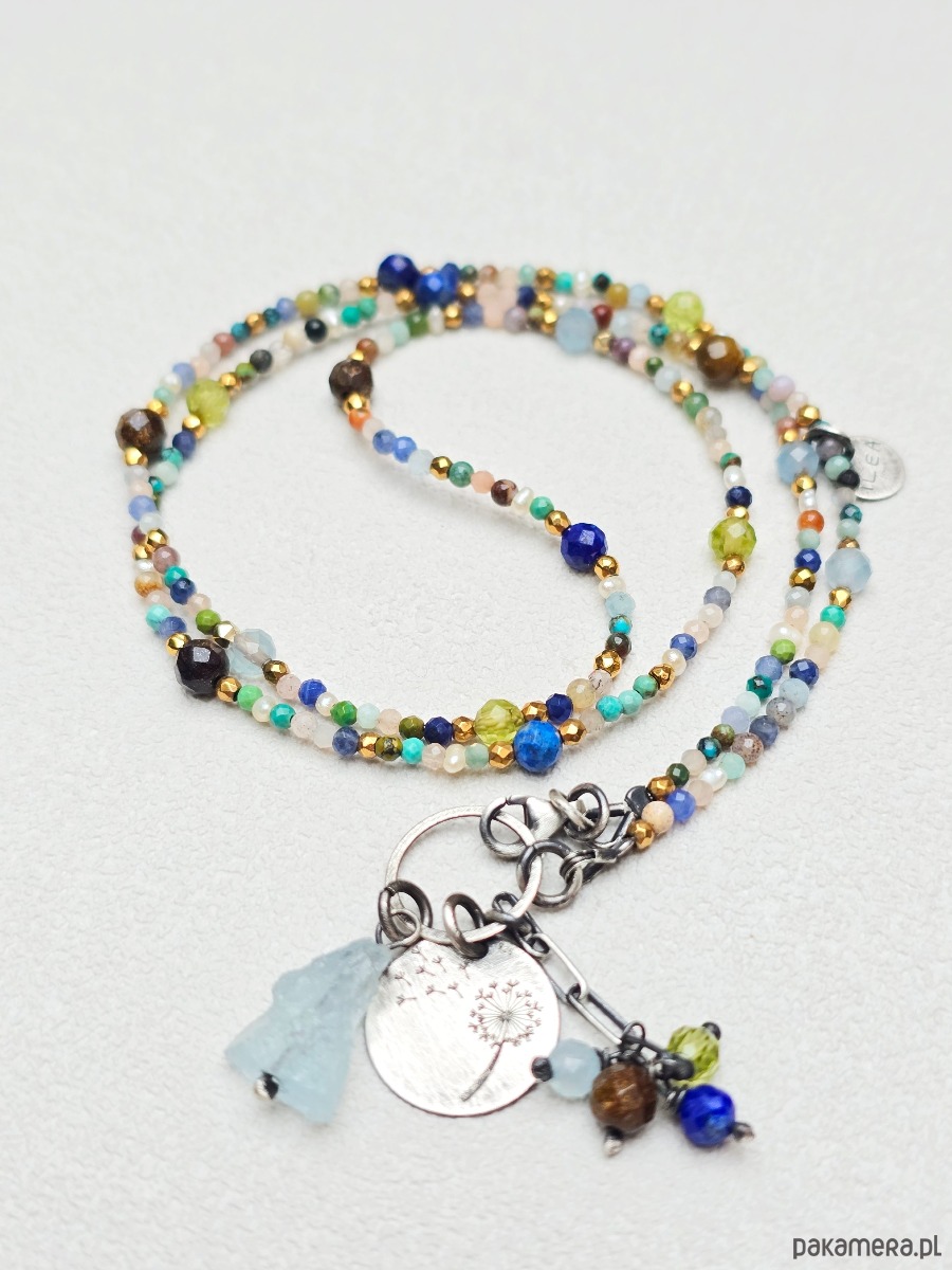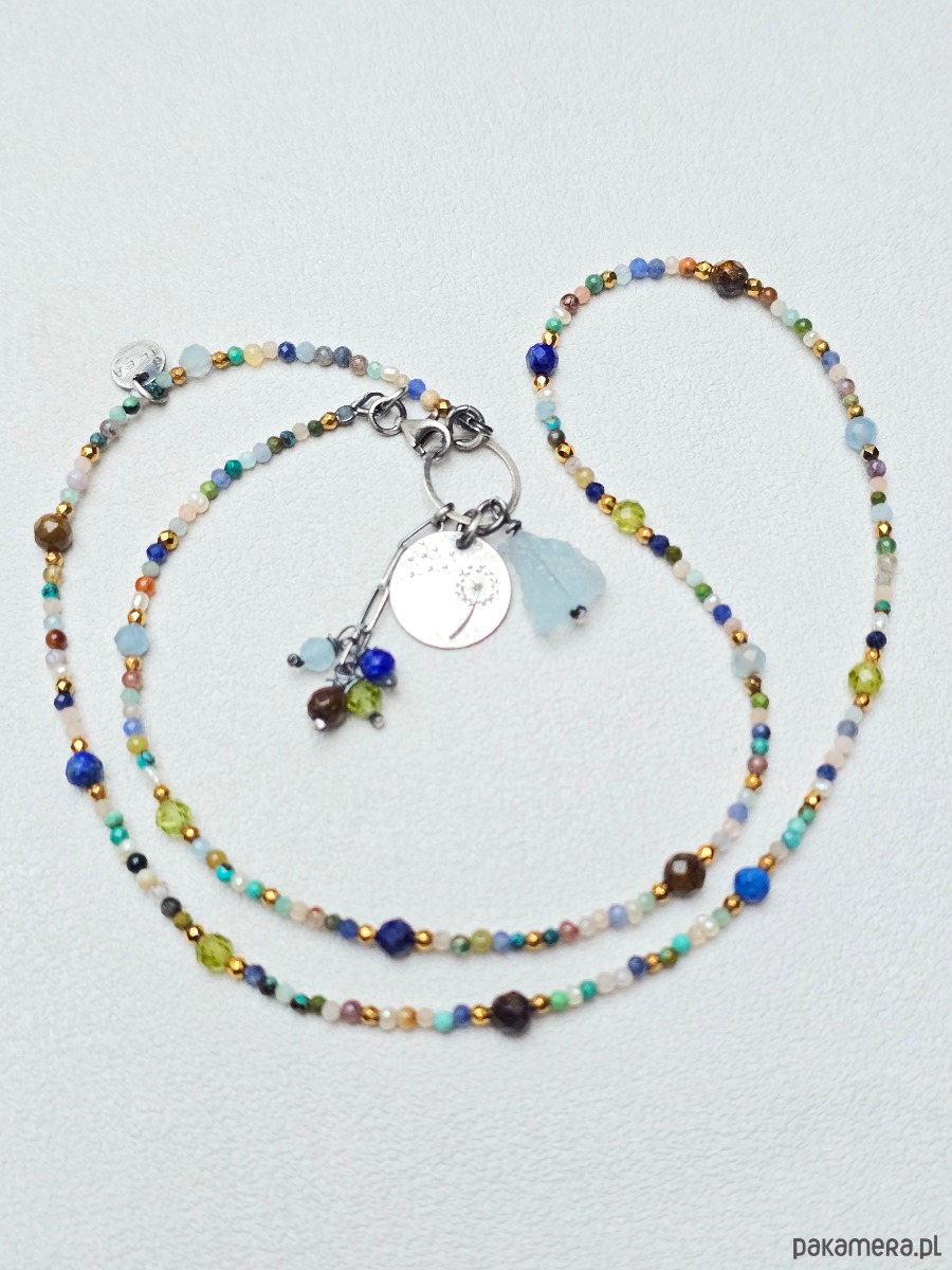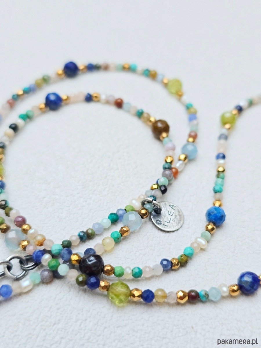 Wykorzystane kamienie: akwamaryn, bronzyt, lapis lazuli, peridot, turkus, perełki naturalne, hematyt złocony, magnezyt, zielony onyks, kamień słoneczny