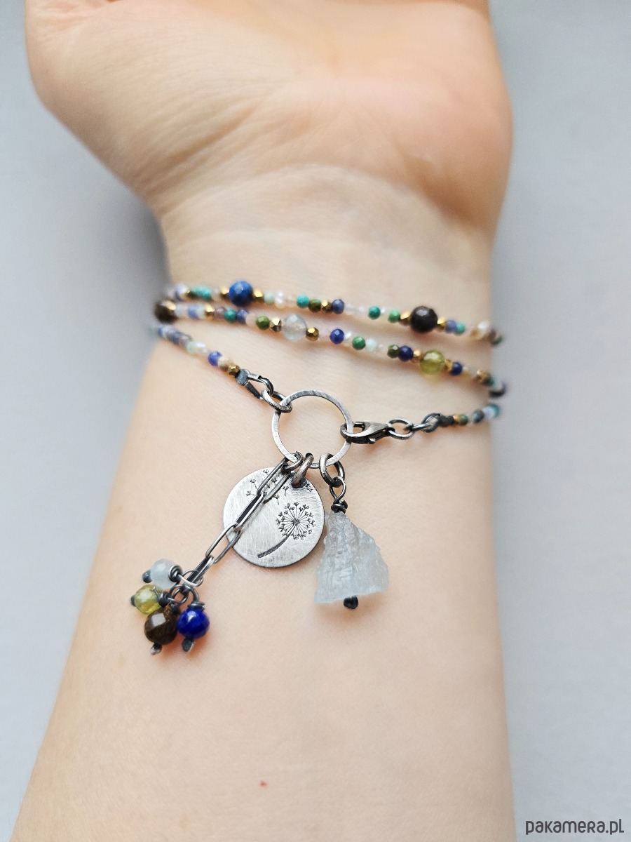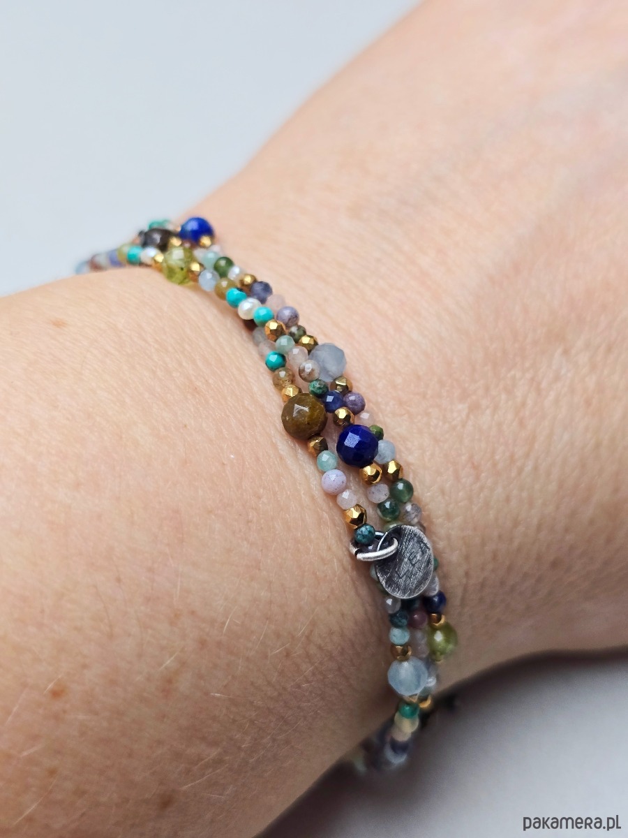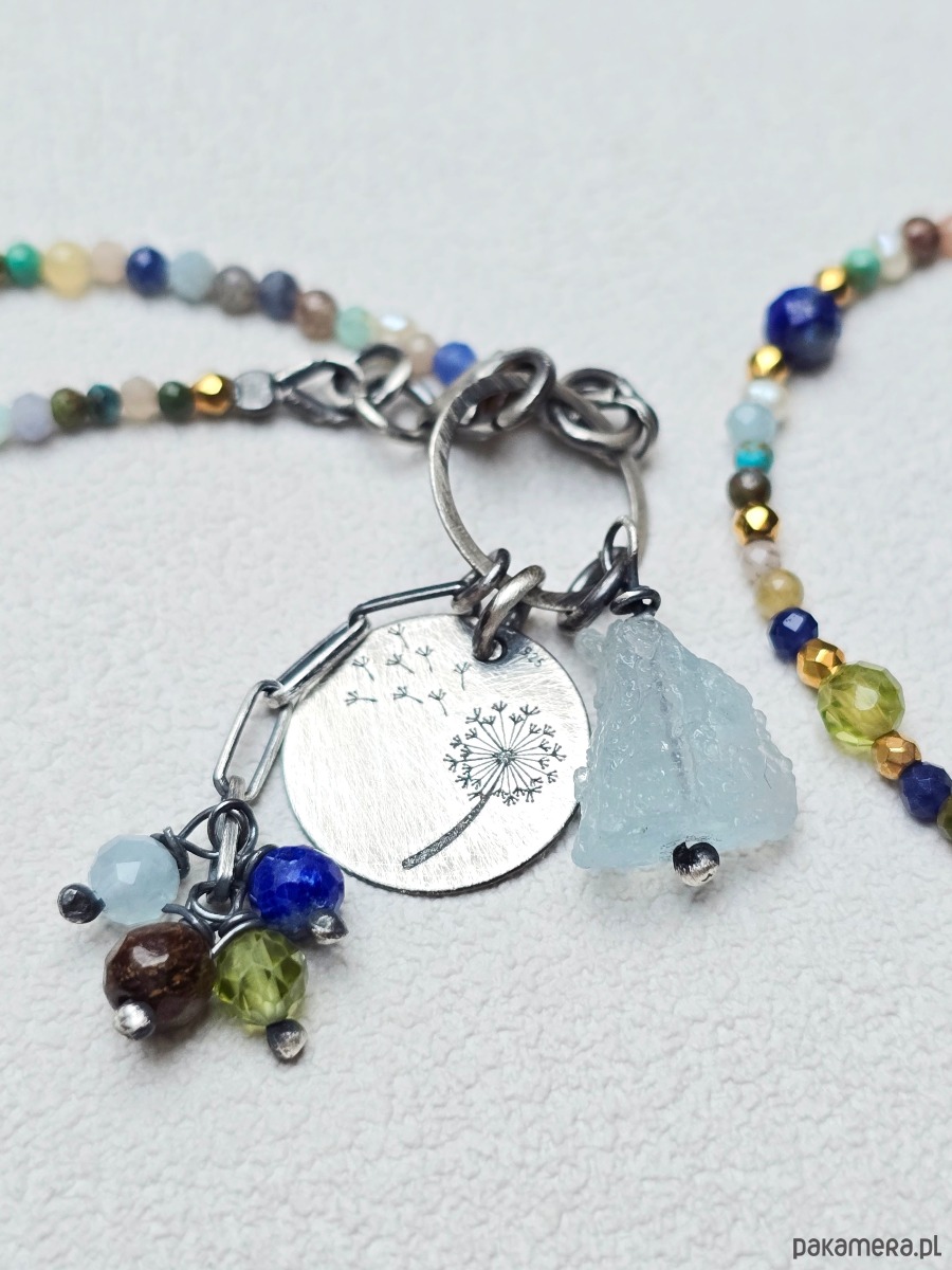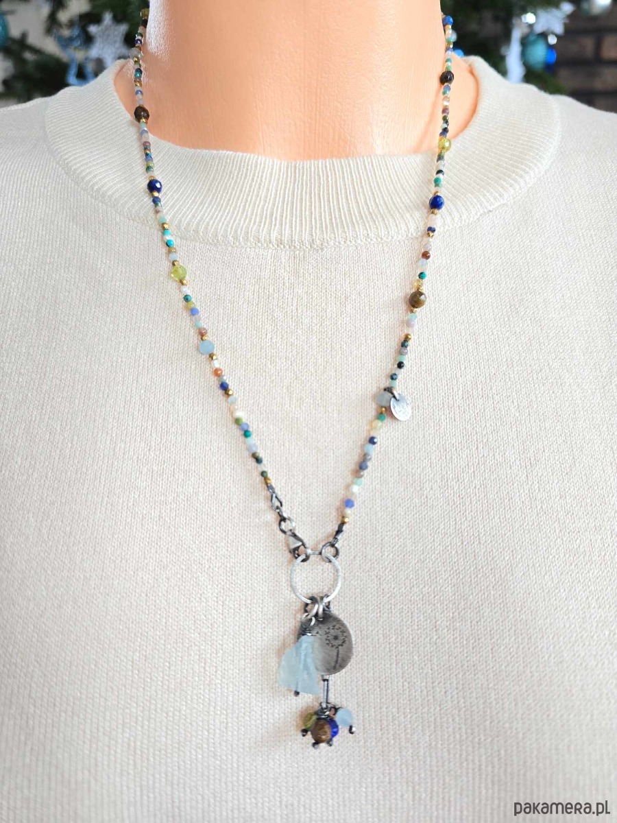 Wykorzystane kamienie: akwamaryn, bronzyt, lapis lazuli, peridot, turkus, perełki naturalne, hematyt złocony, magnezyt, zielony onyks, kamień słoneczny
