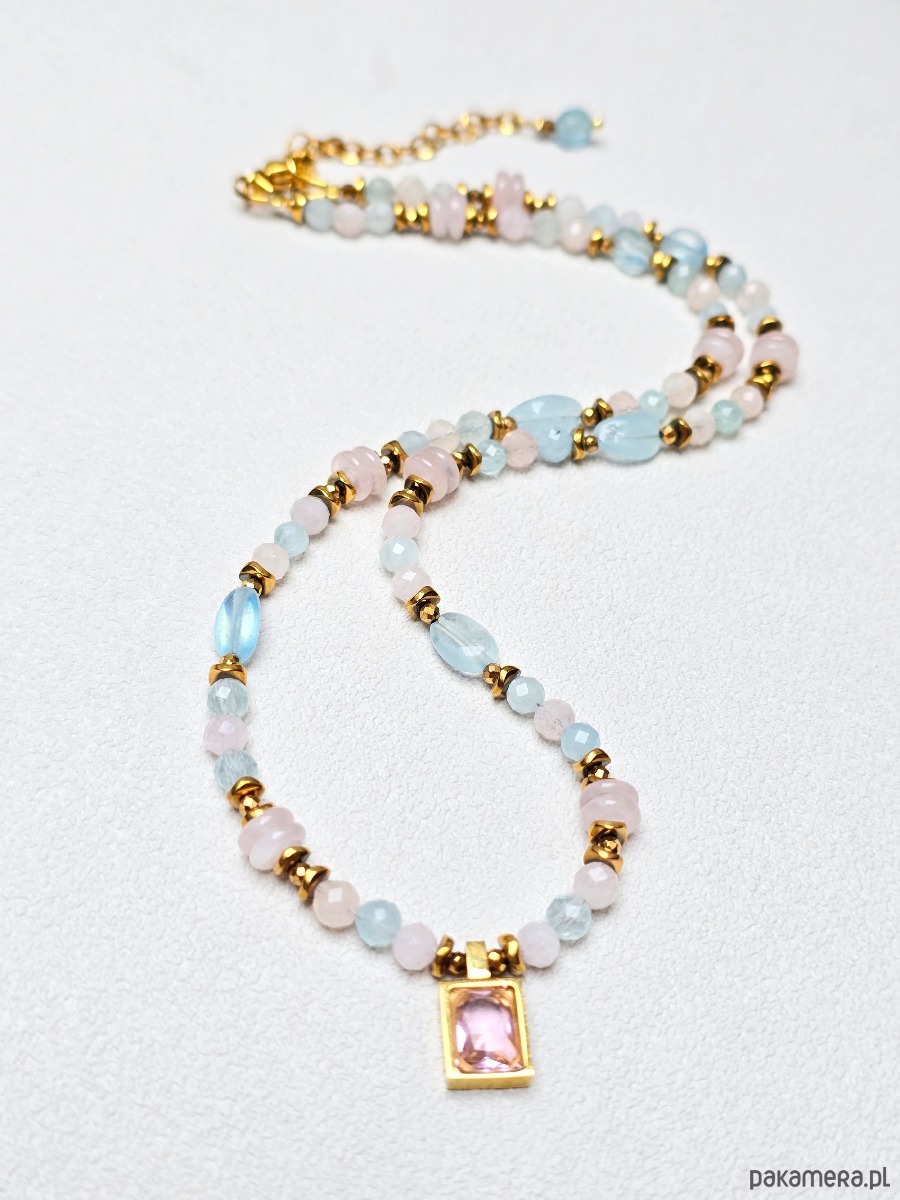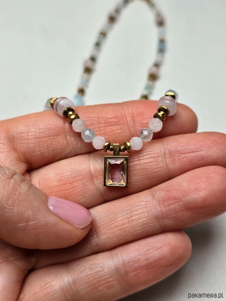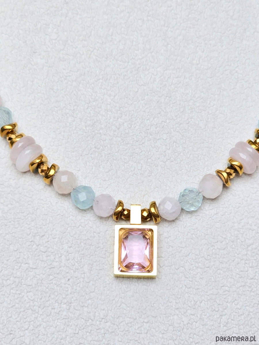 Delikatny naszyjnik z kamieni naturalnych tj.: kwarc różowy, morganit, akwamaryn, złocony hematyt.