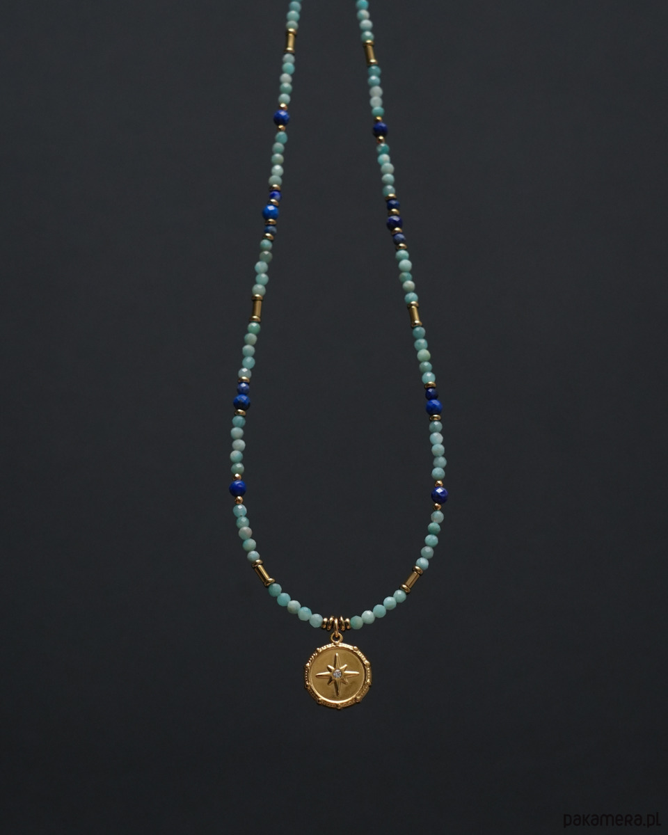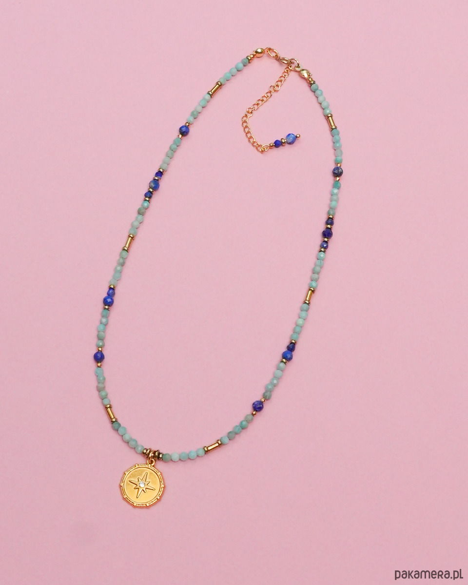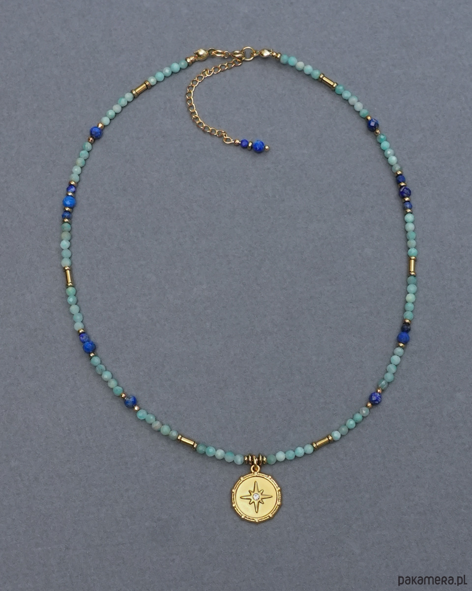 Delikatny naszyjnik wykonany z AMAZONITU, LAPISU LAZULI i złotego HEMATYTU. Ozdobiony okrągłą zawieszką z gwiazdką i cyrkonią.