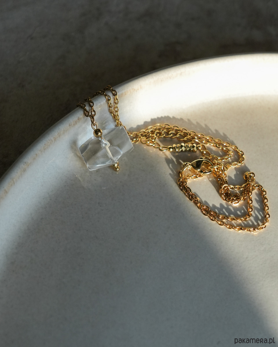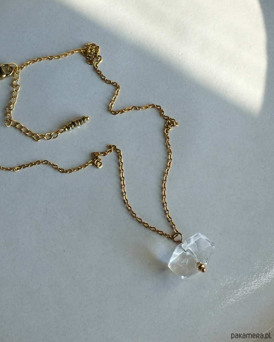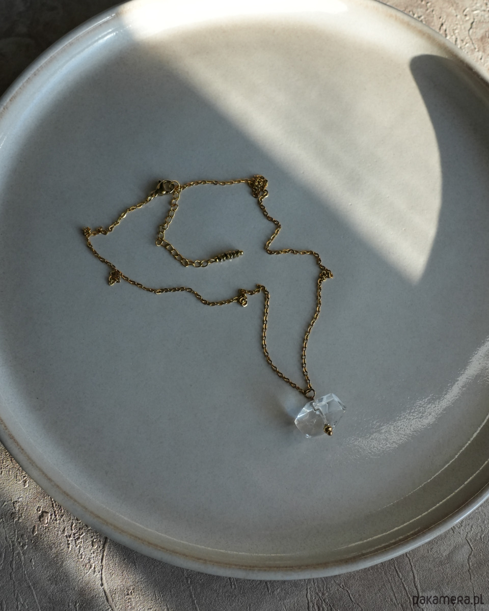 Delikatny i minimalistyczny naszyjnik z klarownym KRYSZTAŁEM GÓRSKIM w formie bryłki o pięknym, nieregularnym szlifie. Delikatny łańcuszek i kuleczki ozdobne to STAL SZLACHETNA w kolorze złotym. Na końcu łańcuszka ozdobny element ze złotego HEMATYTU.