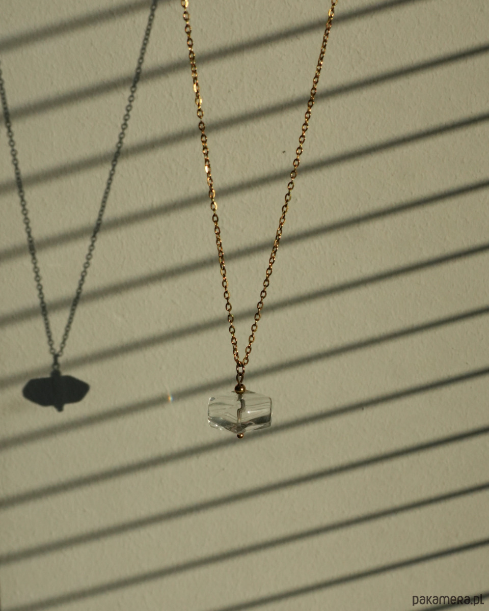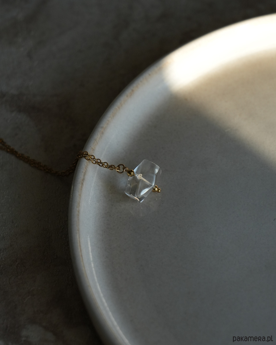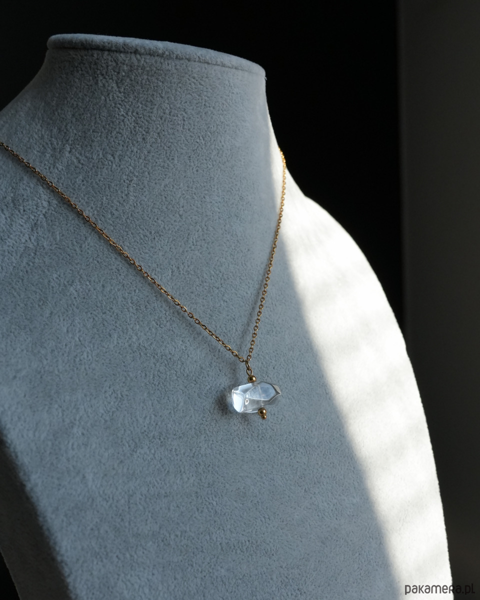 Delikatny i minimalistyczny naszyjnik z klarownym KRYSZTAŁEM GÓRSKIM w formie bryłki o pięknym, nieregularnym szlifie. Delikatny łańcuszek i kuleczki ozdobne to STAL SZLACHETNA w kolorze złotym. Na końcu łańcuszka ozdobny element ze złotego HEMATYTU.
