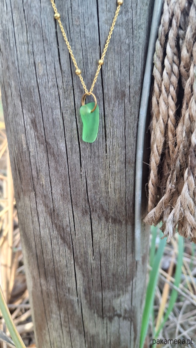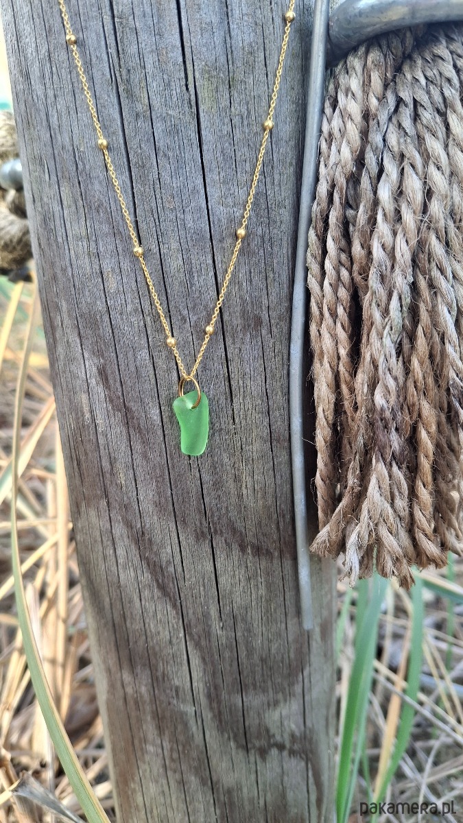 Delikatny łańcuszek wykonany ze srebra, następnie pozłocony. Sercem naszyjnika jest zielone szkło morskie - wygładzone przez czas i naturę, jakby zatrzymało w sobie wspomnienie letniego dnia nad morzem.