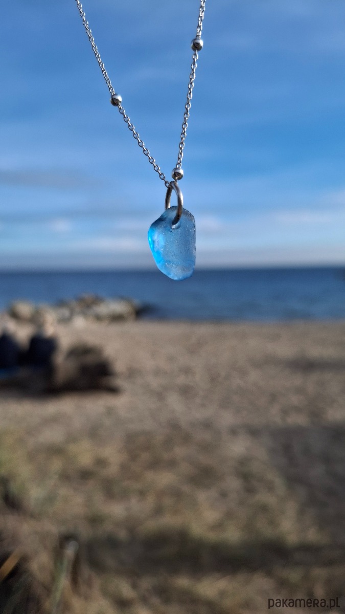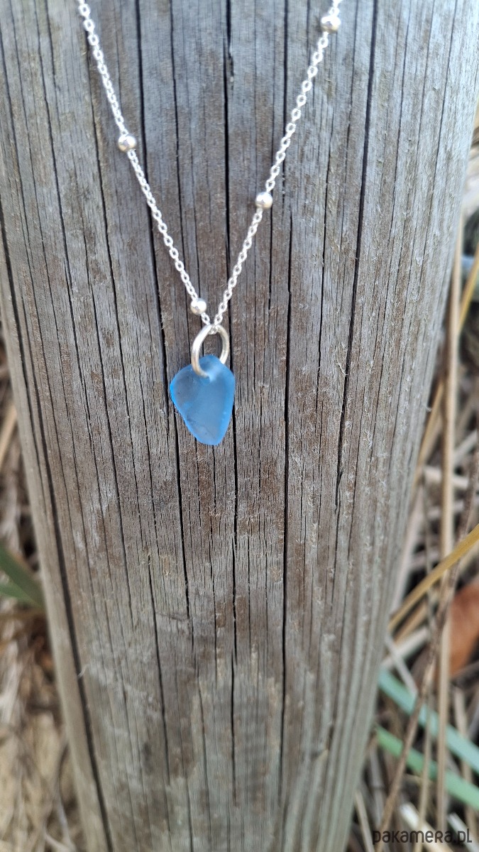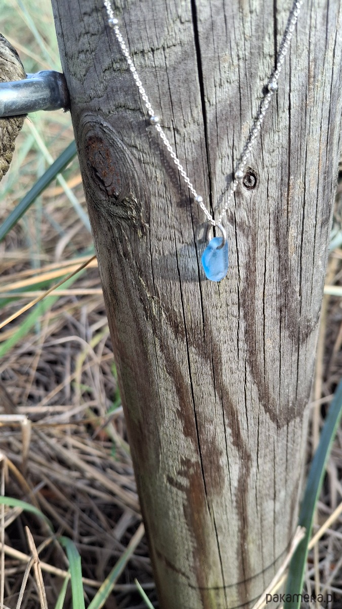 Delikatny srebrny łańcuszek zdobią drobne kuleczki, które połyskują niczym krople wody w słońcu. Sercem naszyjnika jest prawdziwe szkło morskie w kolorze letniego nieba.
