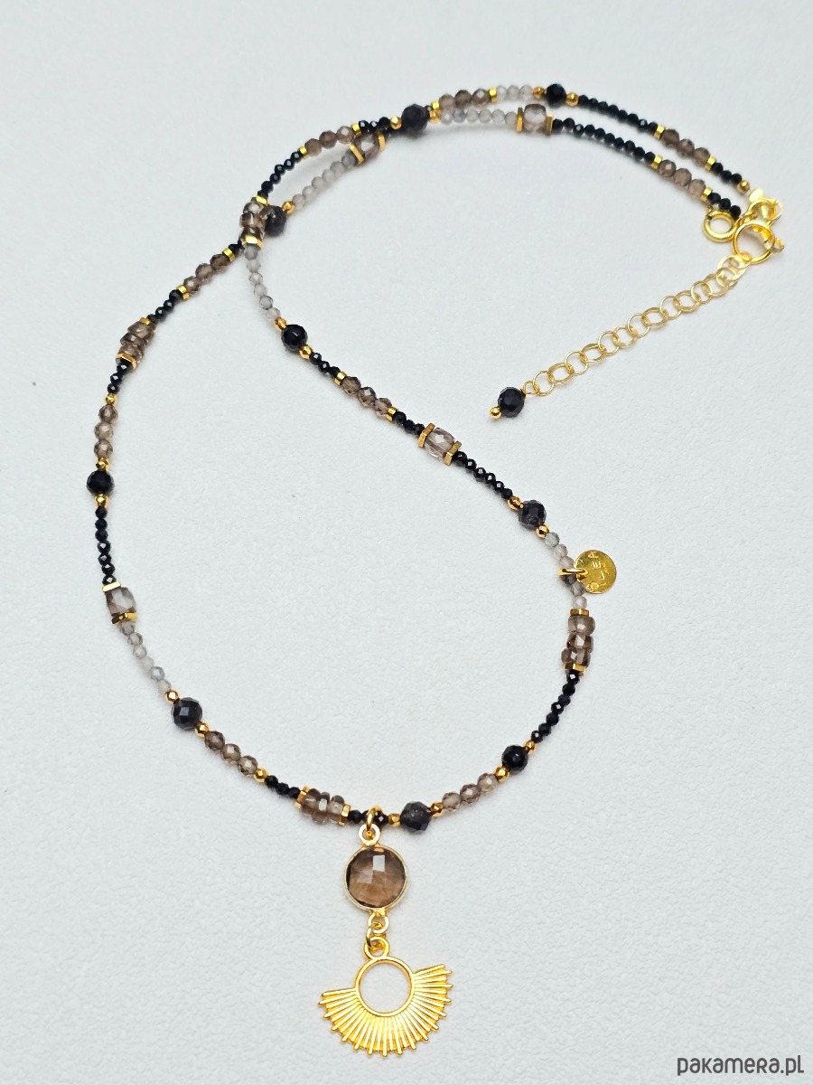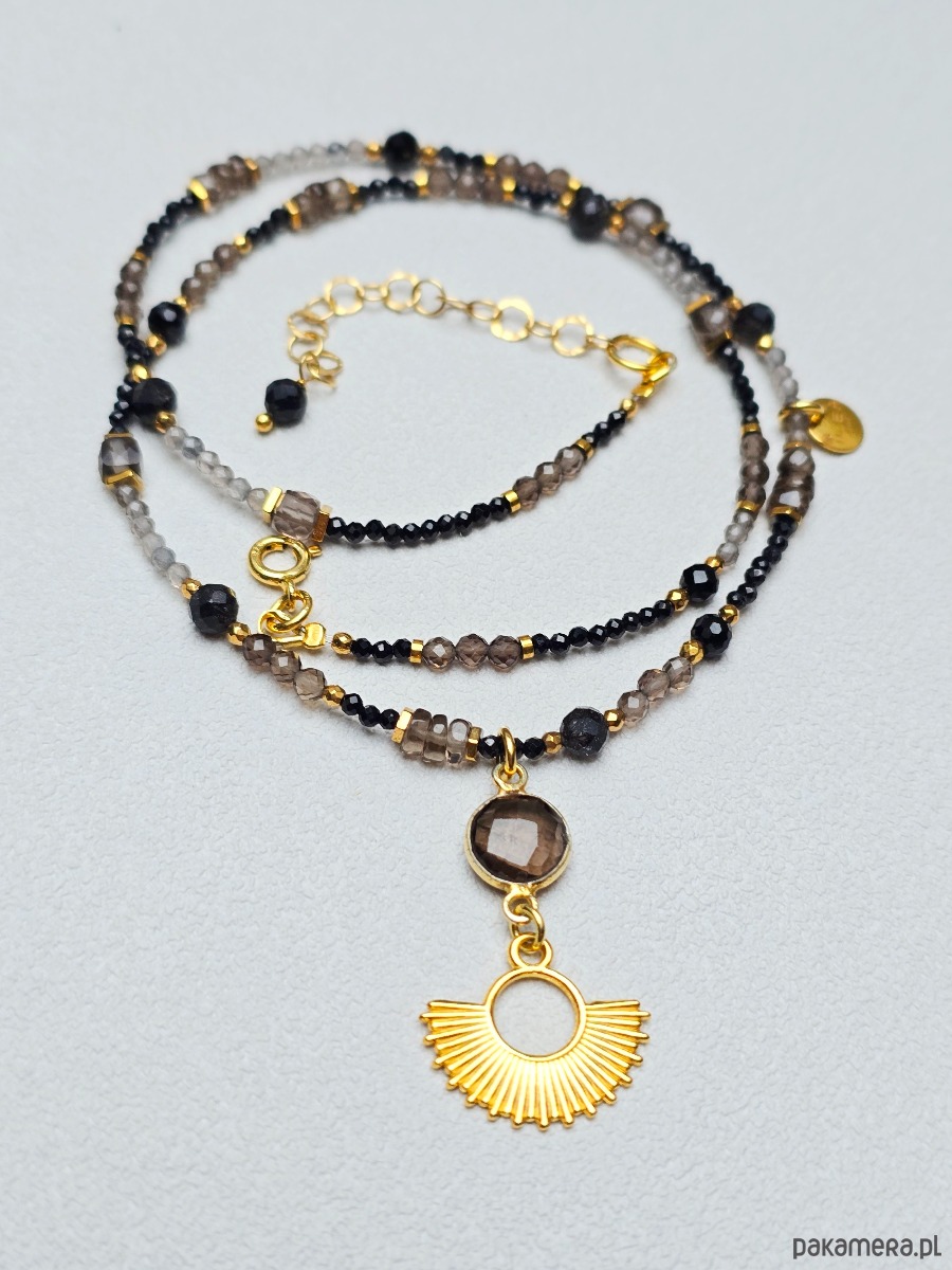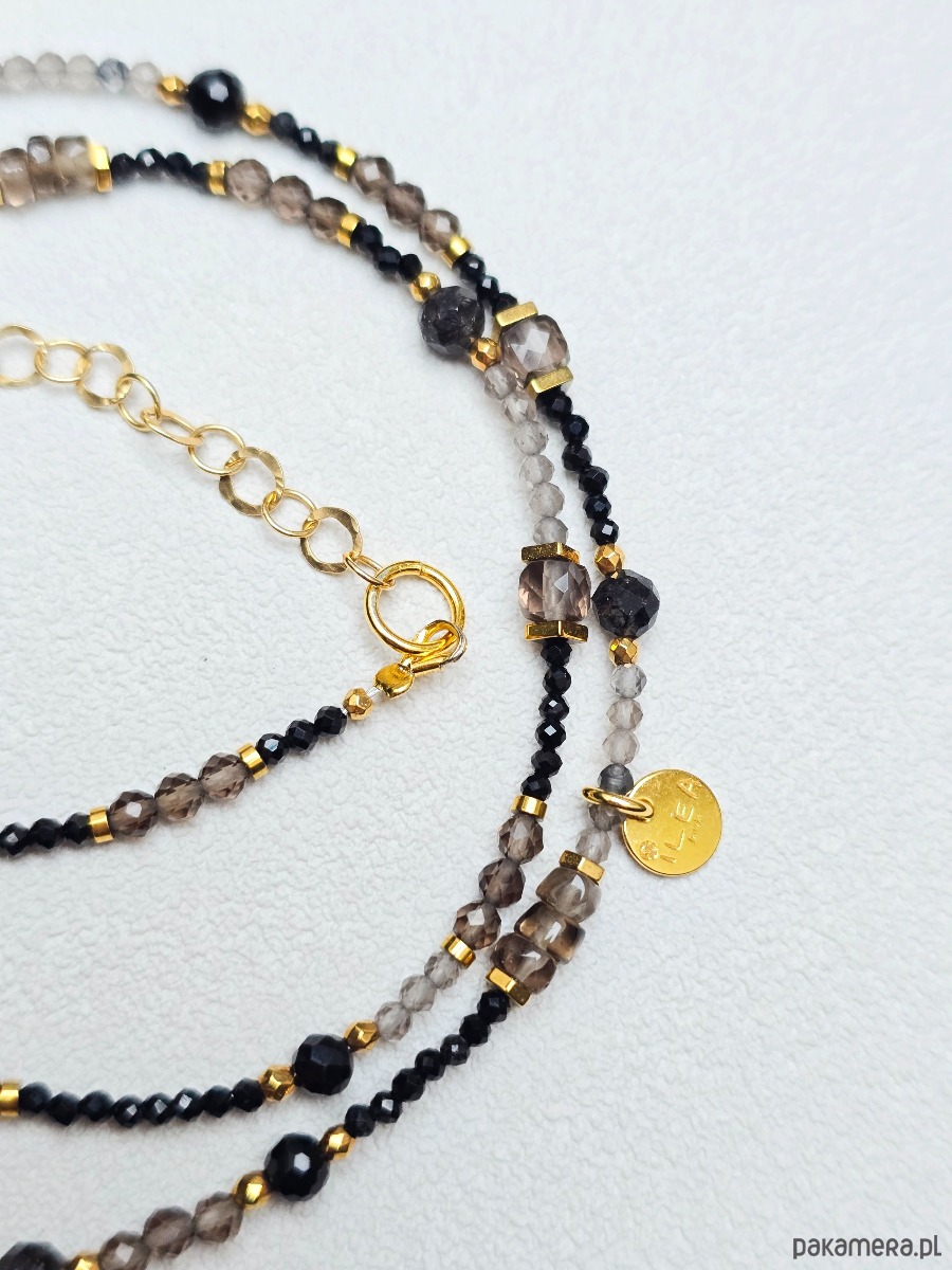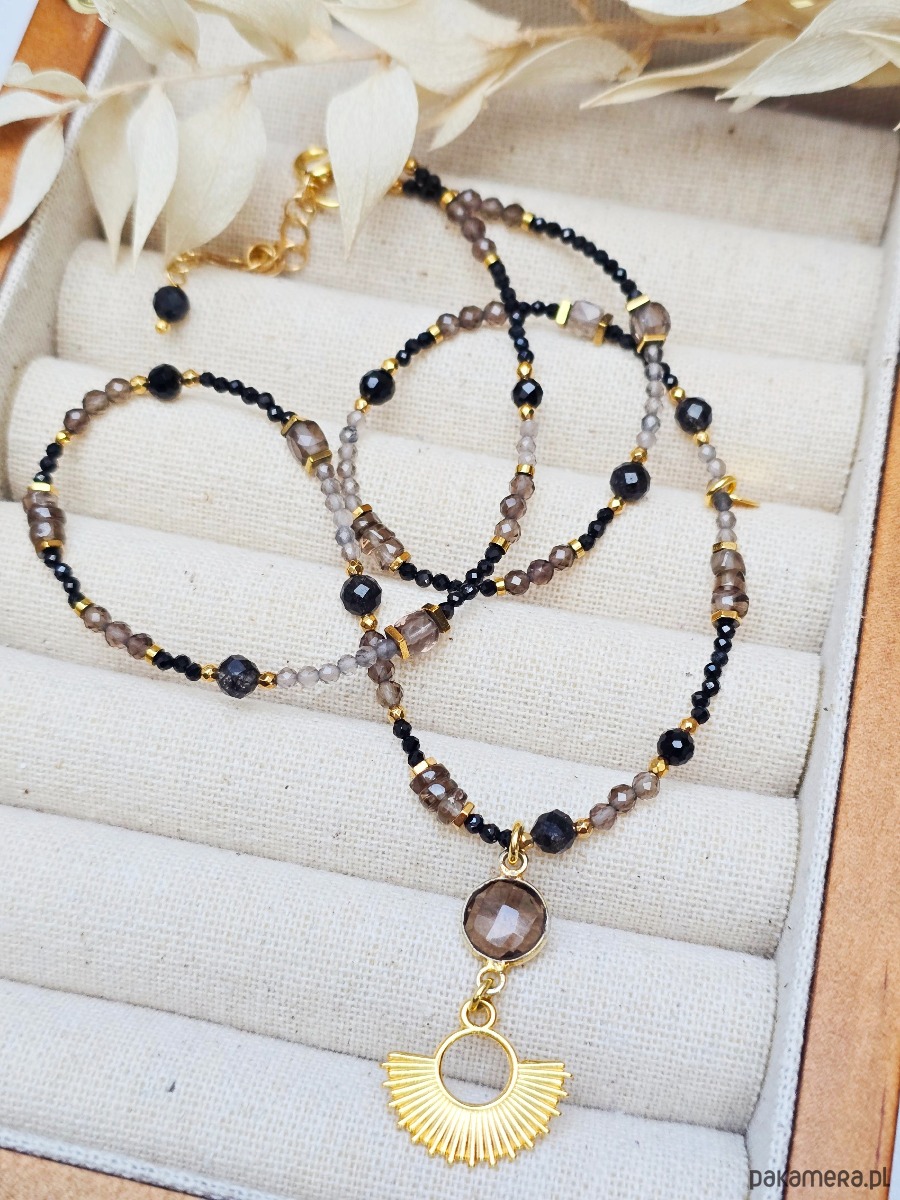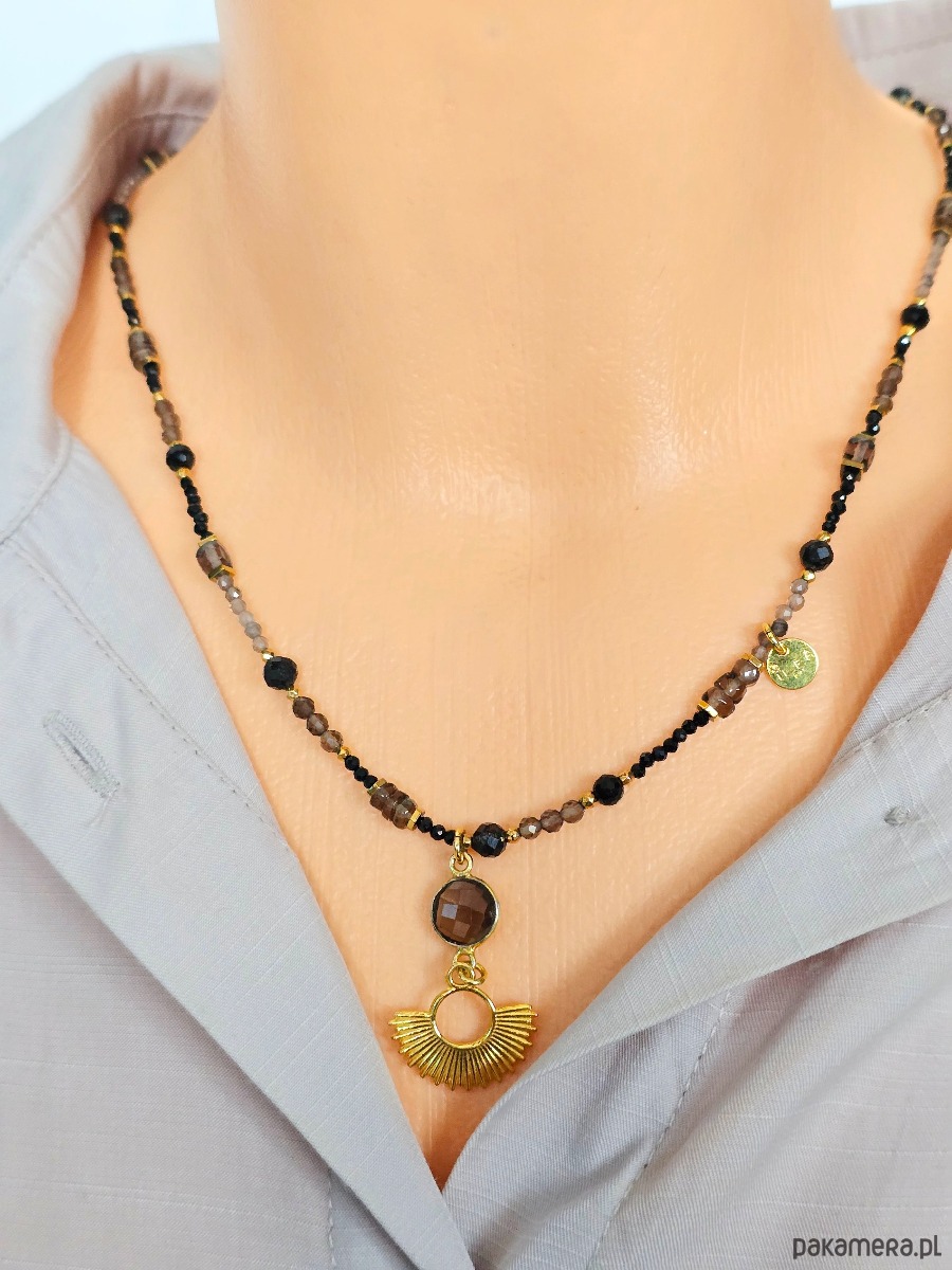 Wyjątkowy naszyjnik z kwarcu dymnego, czarnego turmalinu, kwarcu, złocony hematyt.