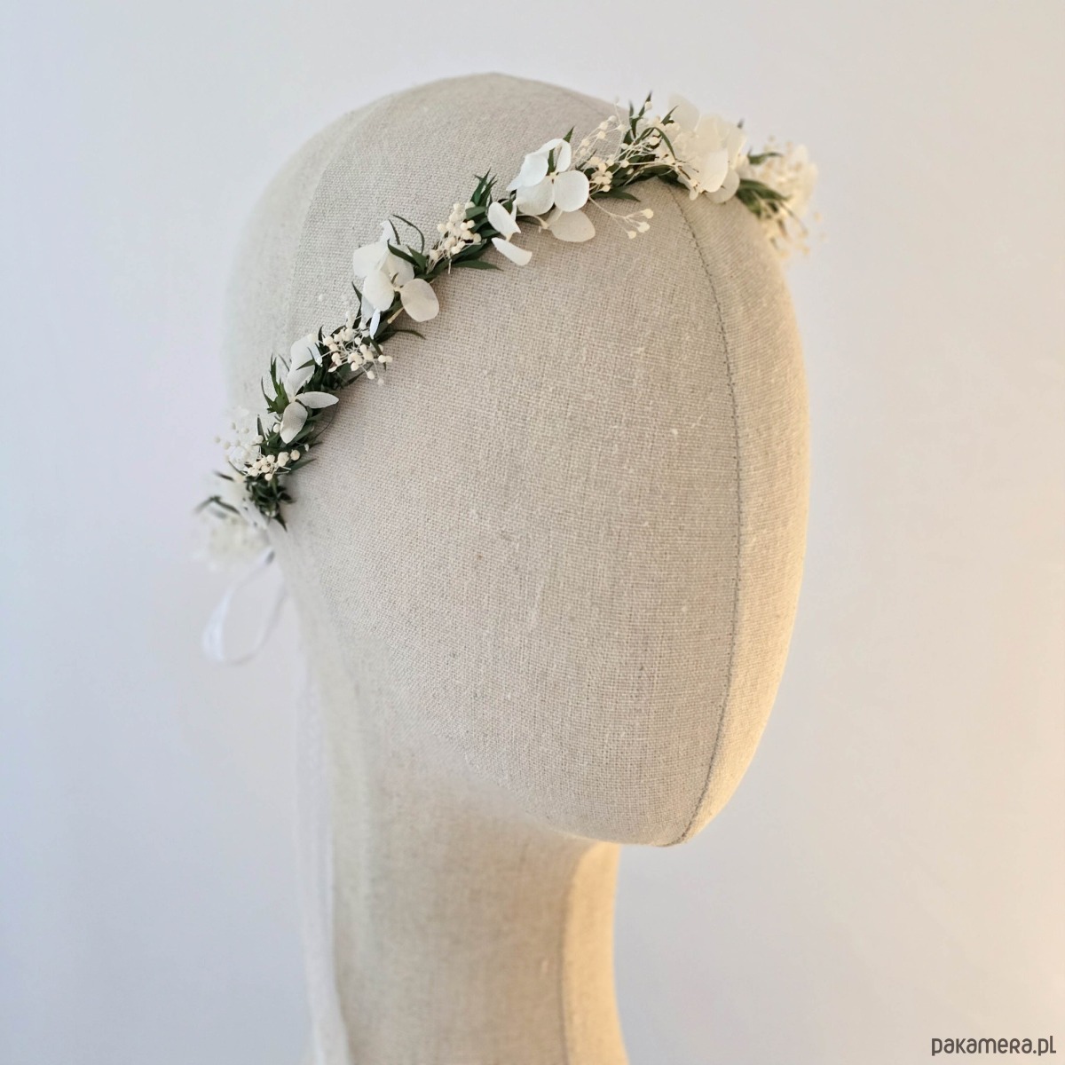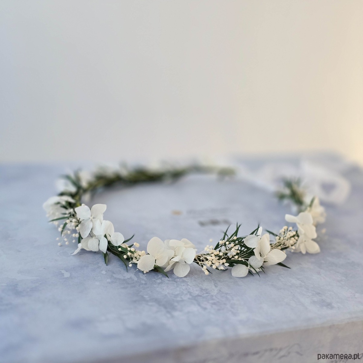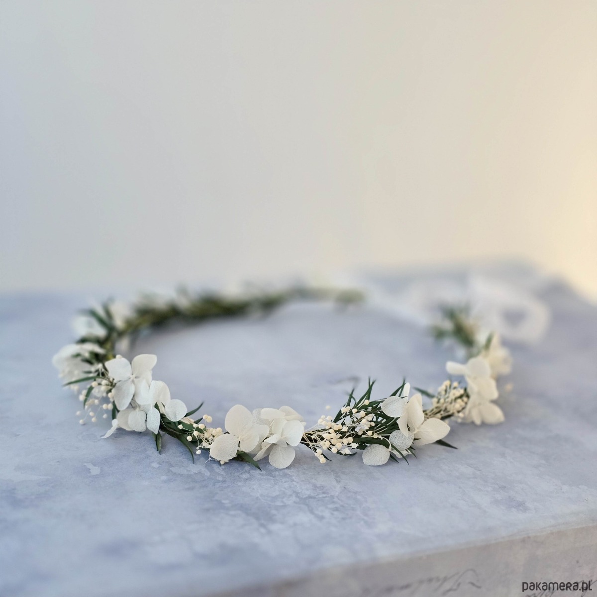 Delikatny, kwiatowy wianek na głowę. Ten subtelny wianuszek to idealny wybór dla wielbicielek minimalizmu. Wianek wykonany z naturalnych, stabilizowanych listków i białych suszonych kwiatów. Część kwiatowa wianka ma 50cm, więc pasuje na każdą głowę o obwodzie powyżej 50cm. Będzie pasował zarówno na głowę dziecka, jak i osoby dorosłej. Możliwość regulacji wielkości obwodu, dzięki satynowej tasiemce z tyłu.