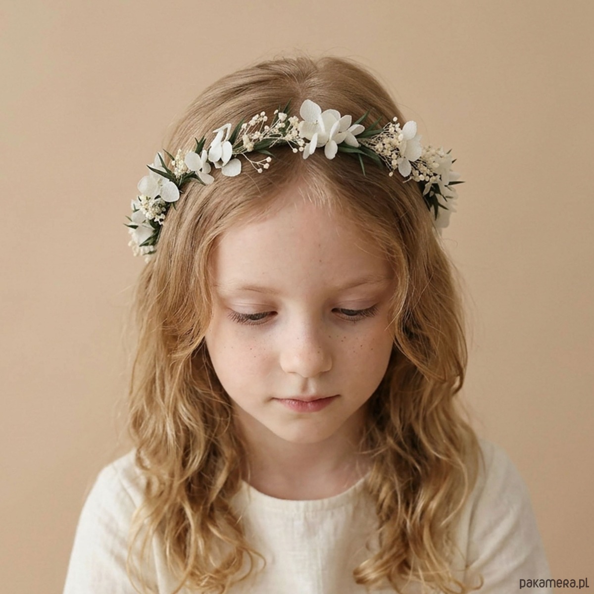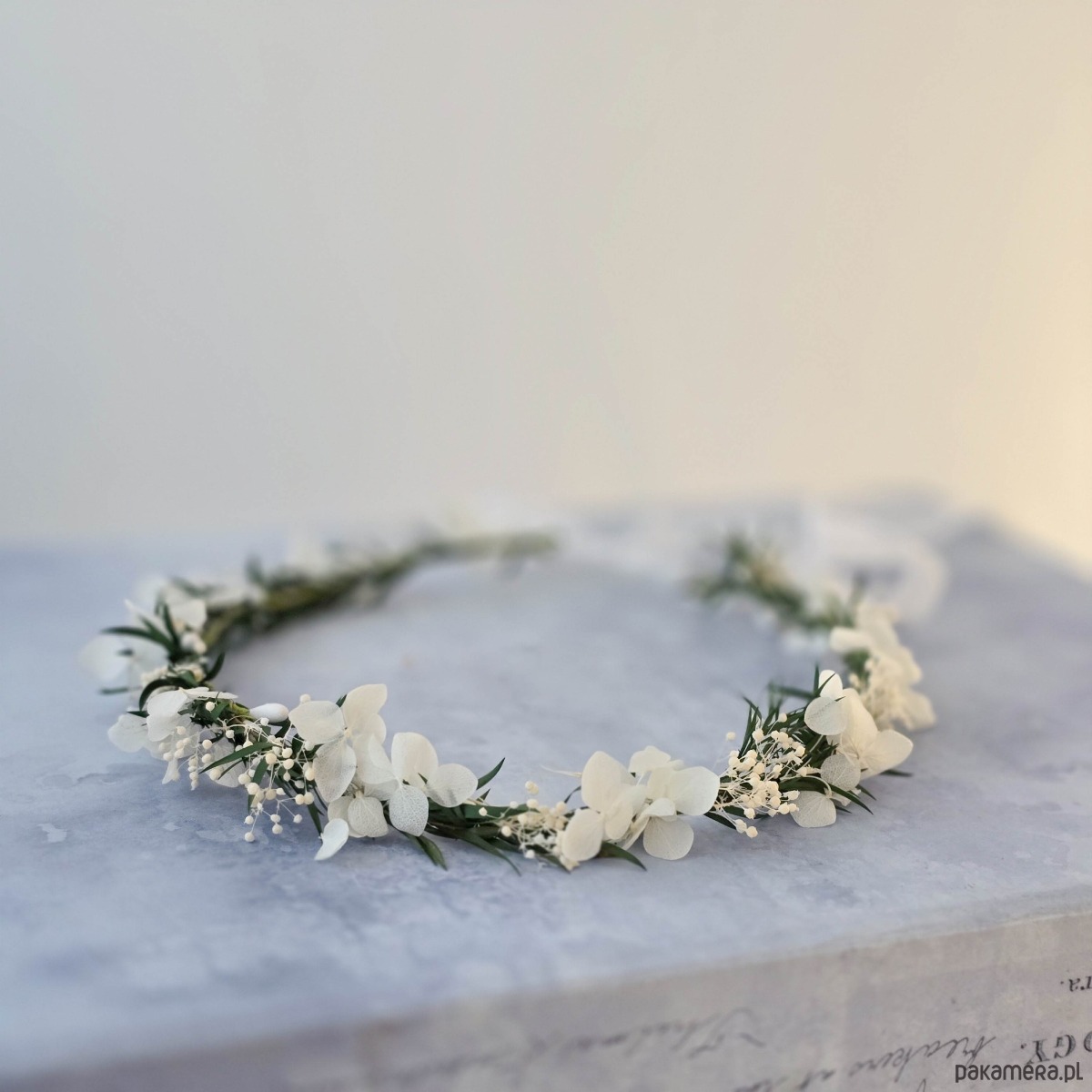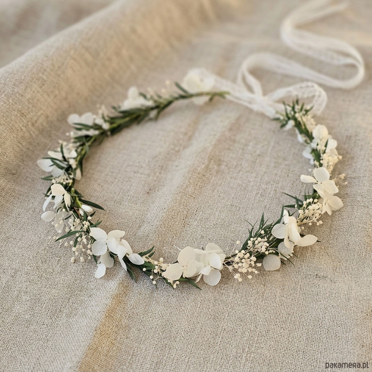 Delikatny, kwiatowy wianek na głowę. Ten subtelny wianuszek to idealny wybór dla wielbicielek minimalizmu. Wianek wykonany z naturalnych, stabilizowanych listków i białych suszonych kwiatów. Część kwiatowa wianka ma 50cm, więc pasuje na każdą głowę o obwodzie powyżej 50cm. Będzie pasował zarówno na głowę dziecka, jak i osoby dorosłej. Możliwość regulacji wielkości obwodu, dzięki satynowej tasiemce z tyłu.