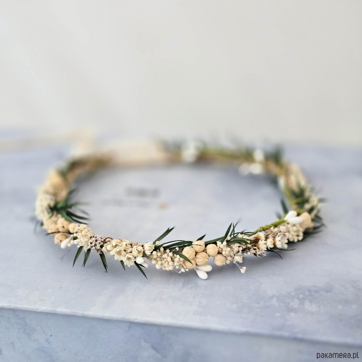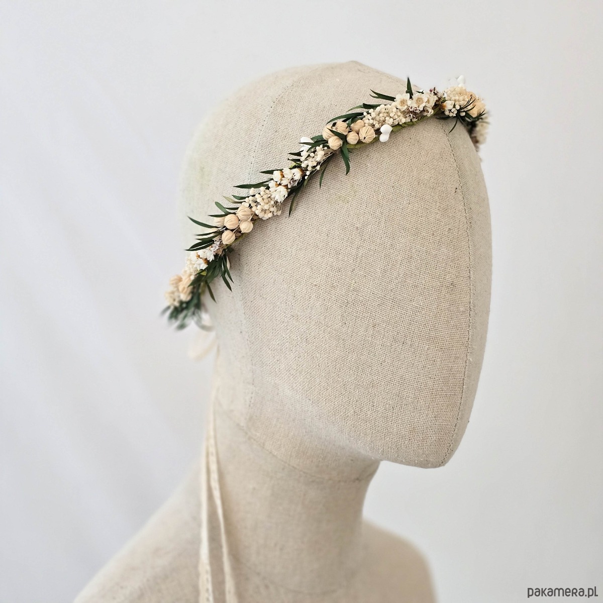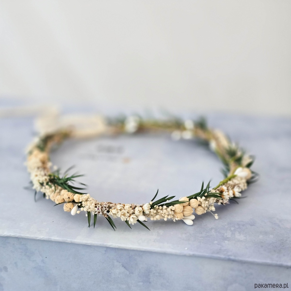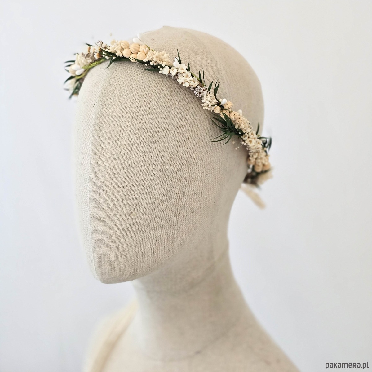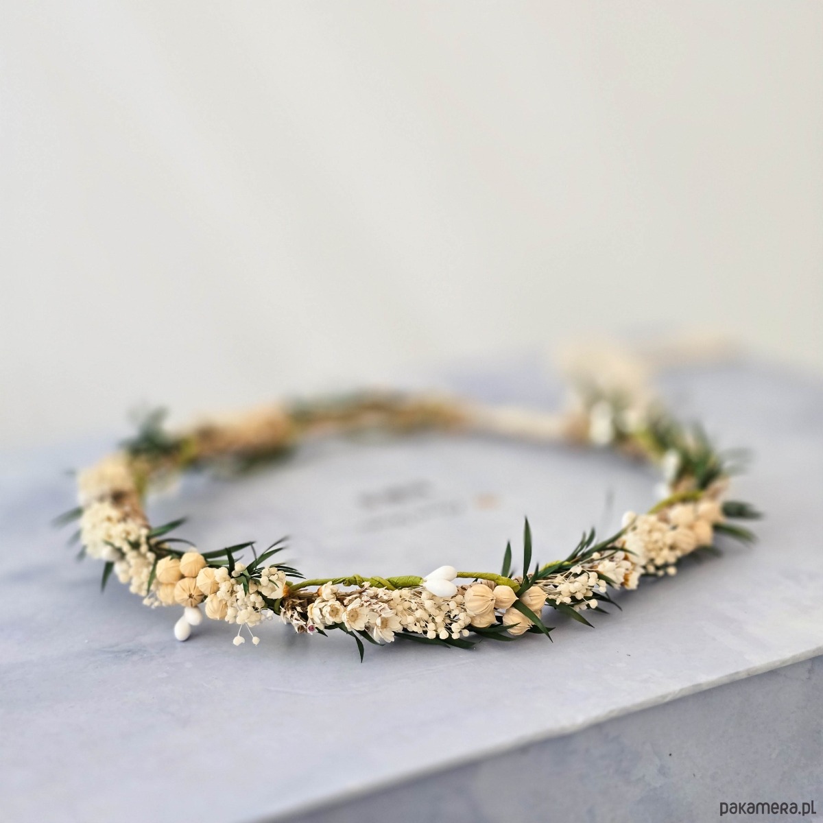 Delikatny, kwiatowy wianek na głowę. Ten subtelny wianuszek to idealny wybór dla wielbicielek minimalizmu. Wianek wykonany z naturalnych, suszonych kwiatów w odcieniach ivory i zieleni. Część kwiatowa wianka ma 50 cm, więc pasuje na każdą głowę o obwodzie powyżej 50 cm. Będzie pasował zarówno na głowę dziecka, jak i osoby dorosłej. Możliwość regulacji wielkości obwodu dzięki satynowej tasiemce z tyłu.