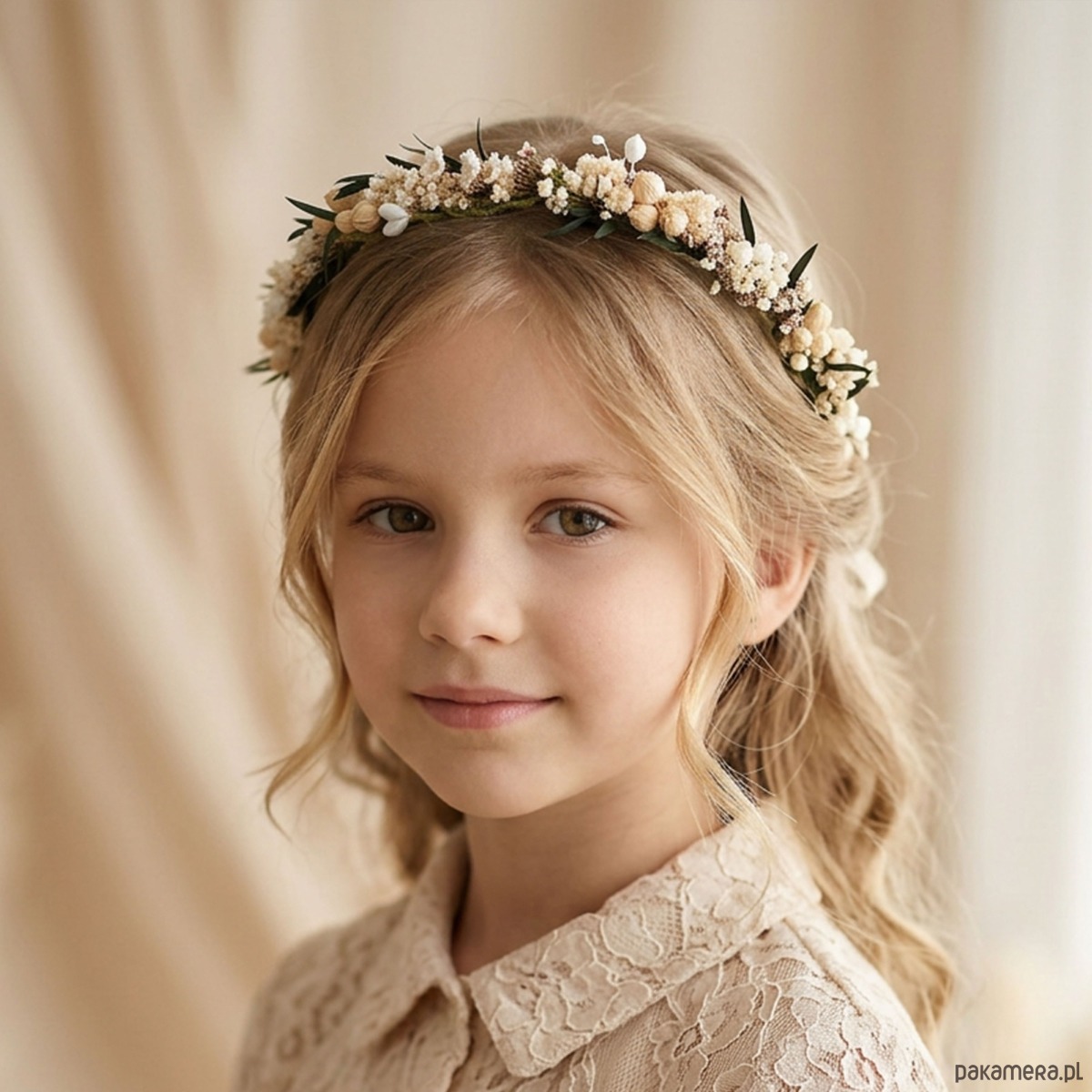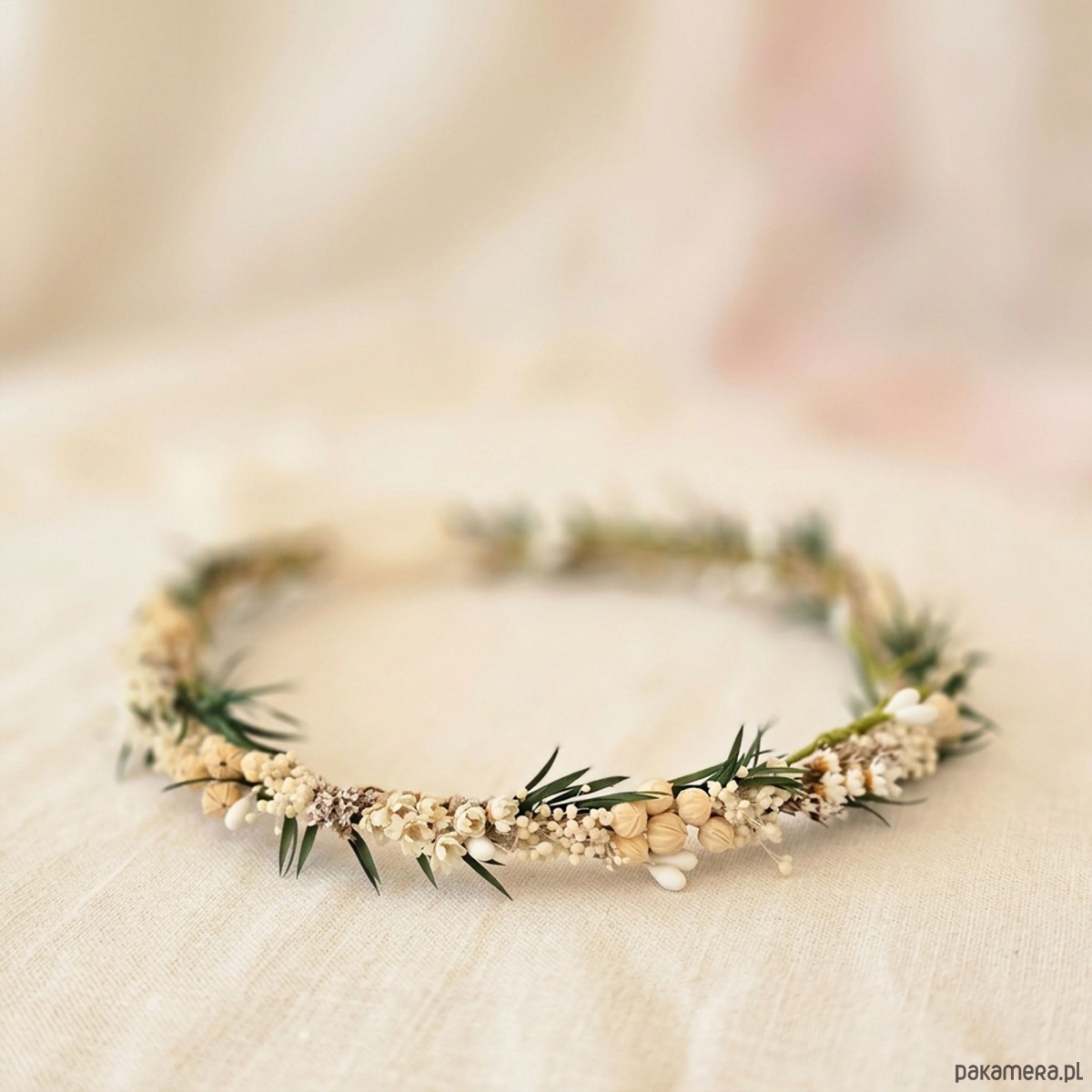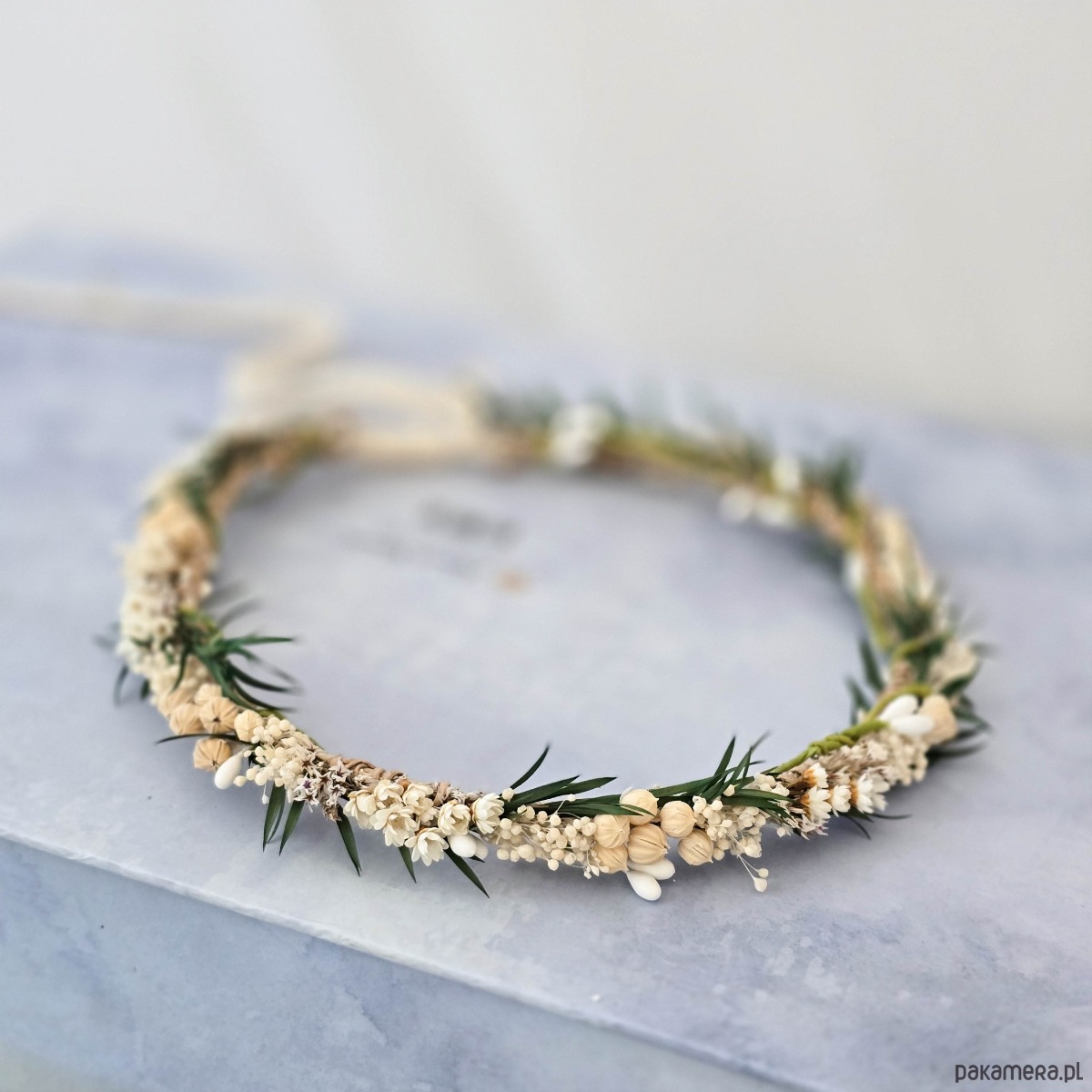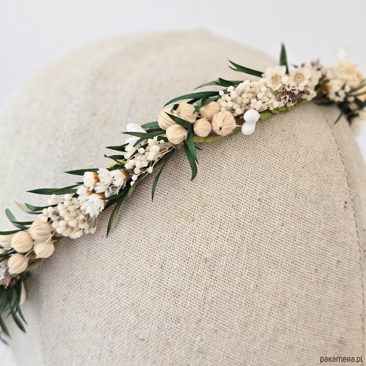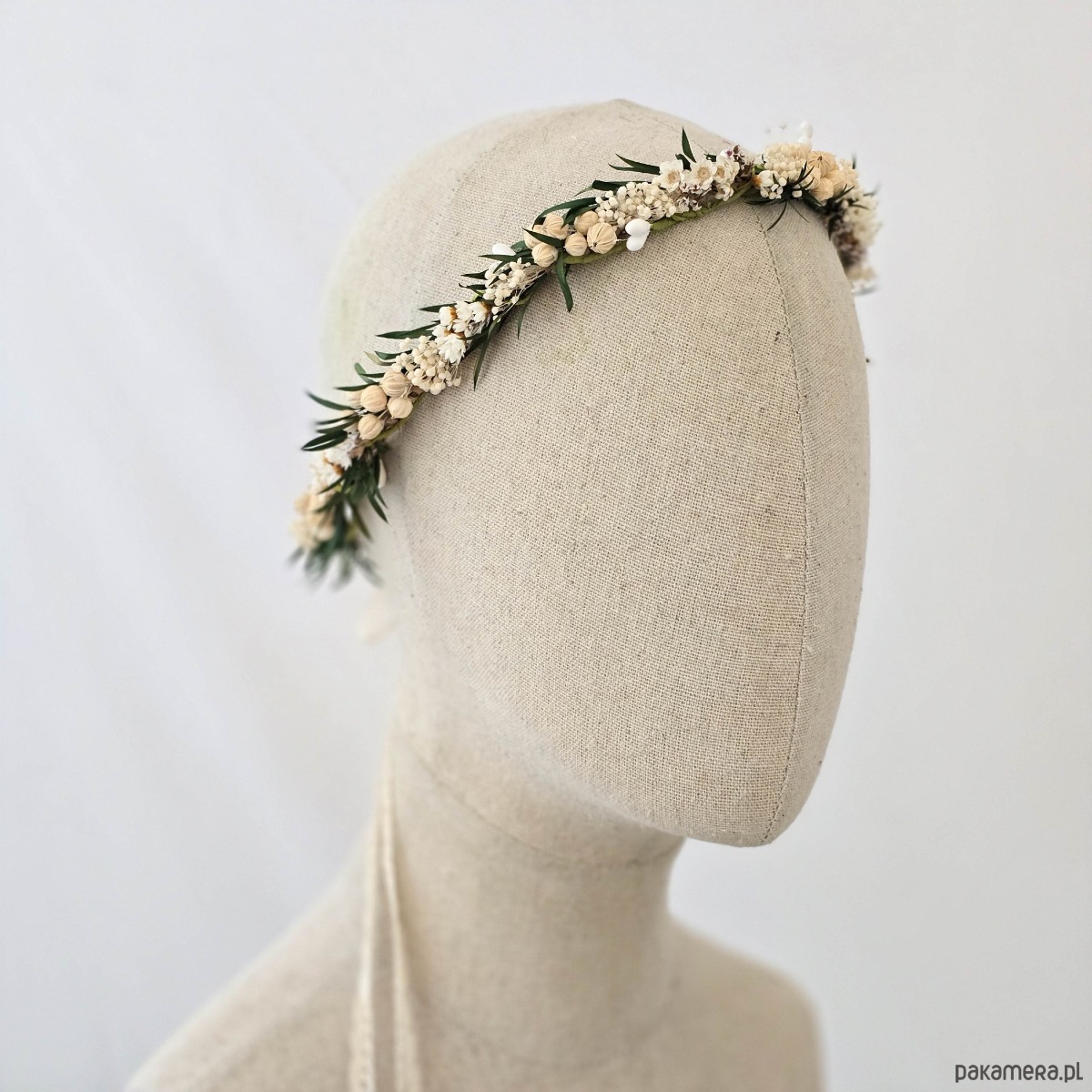 Delikatny, kwiatowy wianek na głowę. Ten subtelny wianuszek to idealny wybór dla wielbicielek minimalizmu. Wianek wykonany z naturalnych, suszonych kwiatów w odcieniach ivory i zieleni. Część kwiatowa wianka ma 50 cm, więc pasuje na każdą głowę o obwodzie powyżej 50 cm. Będzie pasował zarówno na głowę dziecka, jak i osoby dorosłej. Możliwość regulacji wielkości obwodu dzięki satynowej tasiemce z tyłu.