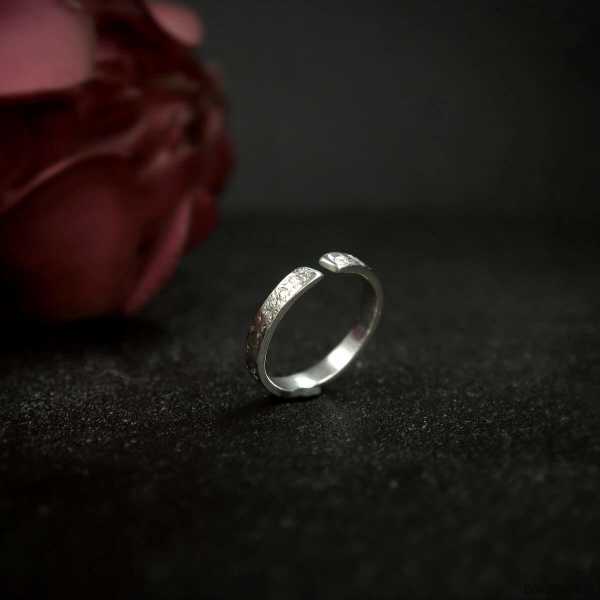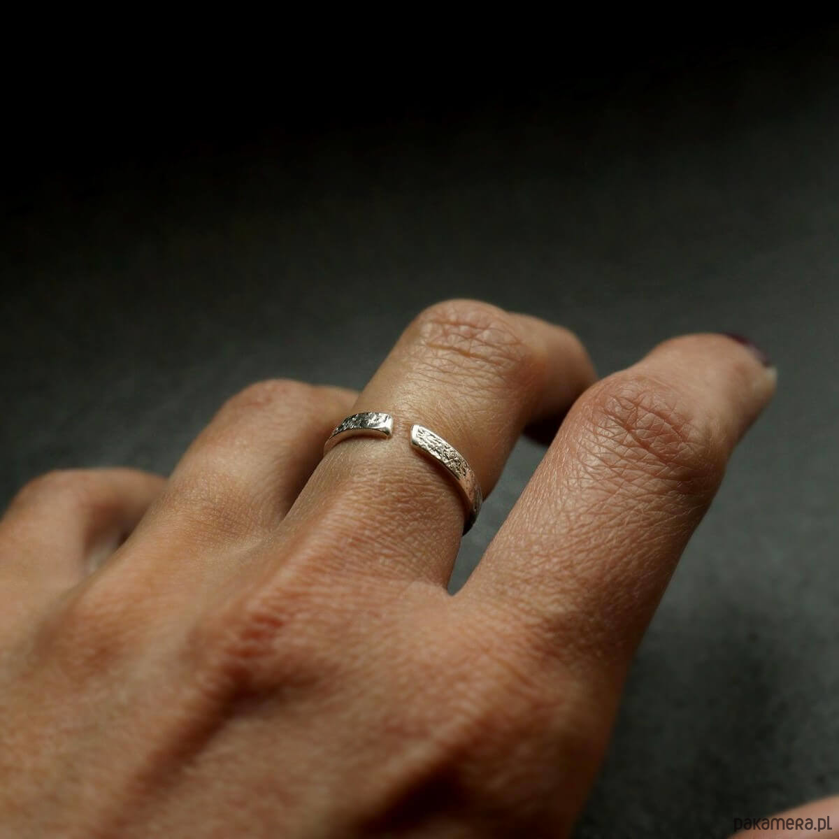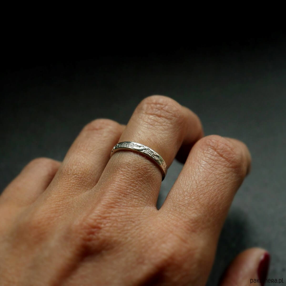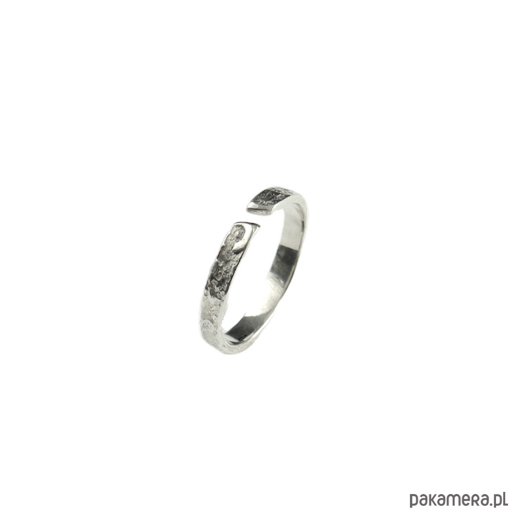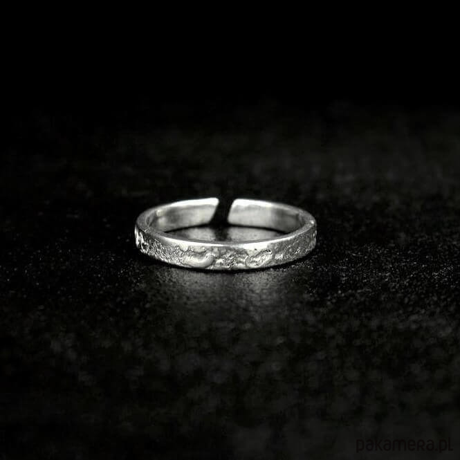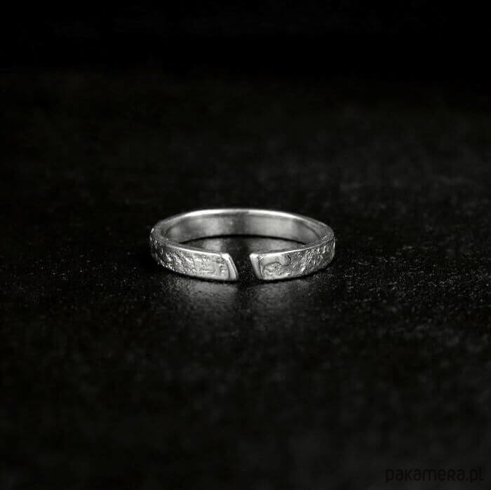 Delikatny pierścionek srebrny Moon Surface o szerokości ok. 3 mm o surowej fakturze przypominającej powierzchnię księżyca. Subtelny, a zarazem oryginalny wąski pierścionek - kompromis dla osób, którym podoba się surowy styl w biżuterii, ale na codzień noszą delikatne rzeczy. Pierścionek w opcji otwartej można nosić na dwa sposoby - ukośną przerwą z przodu lub z tyłu.