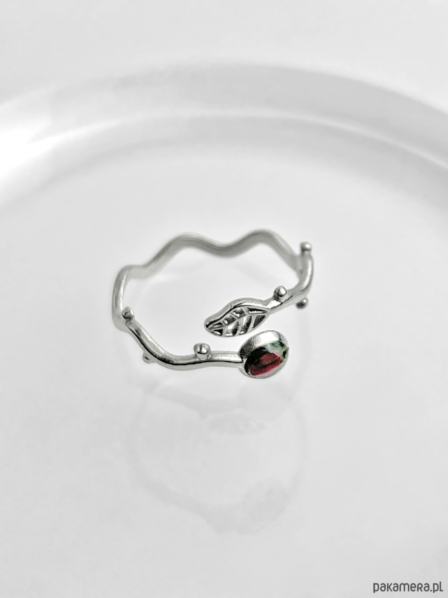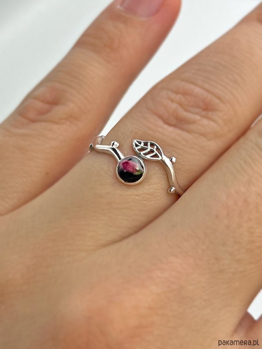 Subtelny pierścionek w kształcie gałązki zakończonej oczkiem, w którym utrwalony został prawdziwy kwiatuszek wrzosu na czarnym tle. Delikatny dodatek dla osób, które doceniają inspirowaną naturą biżuterię.
