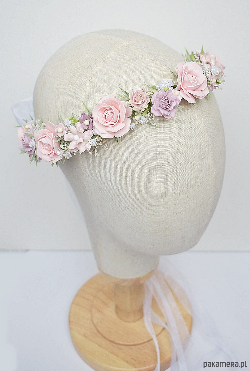 Piękny, delikatny wianek komunijny w kolorystyce róż, fiolet, ivory zielone gałązki z drobnymi listkami, z dodatkiem gipsówki i drobnych kwiatów.