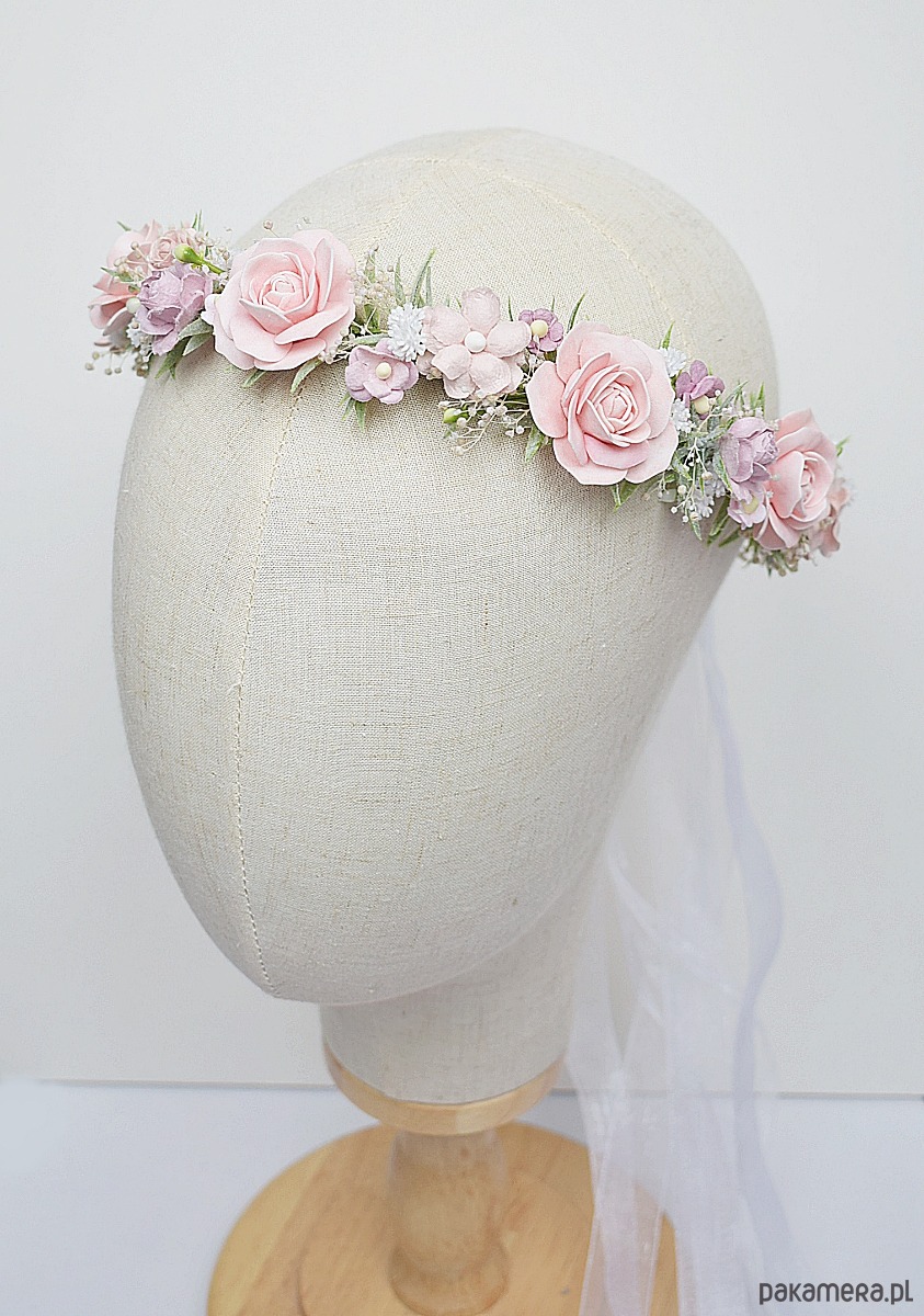 Delikatny Wianek komunijny jak żywy róż, fiolet , zieleń,