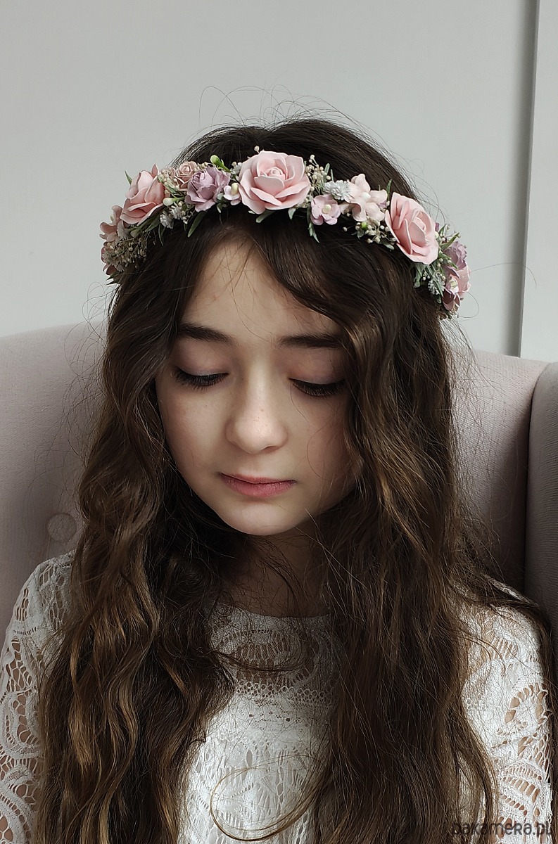 Piękny, delikatny wianek komunijny w kolorystyce róż, fiolet, ivory zielone gałązki z drobnymi listkami, z dodatkiem gipsówki i drobnych kwiatów.